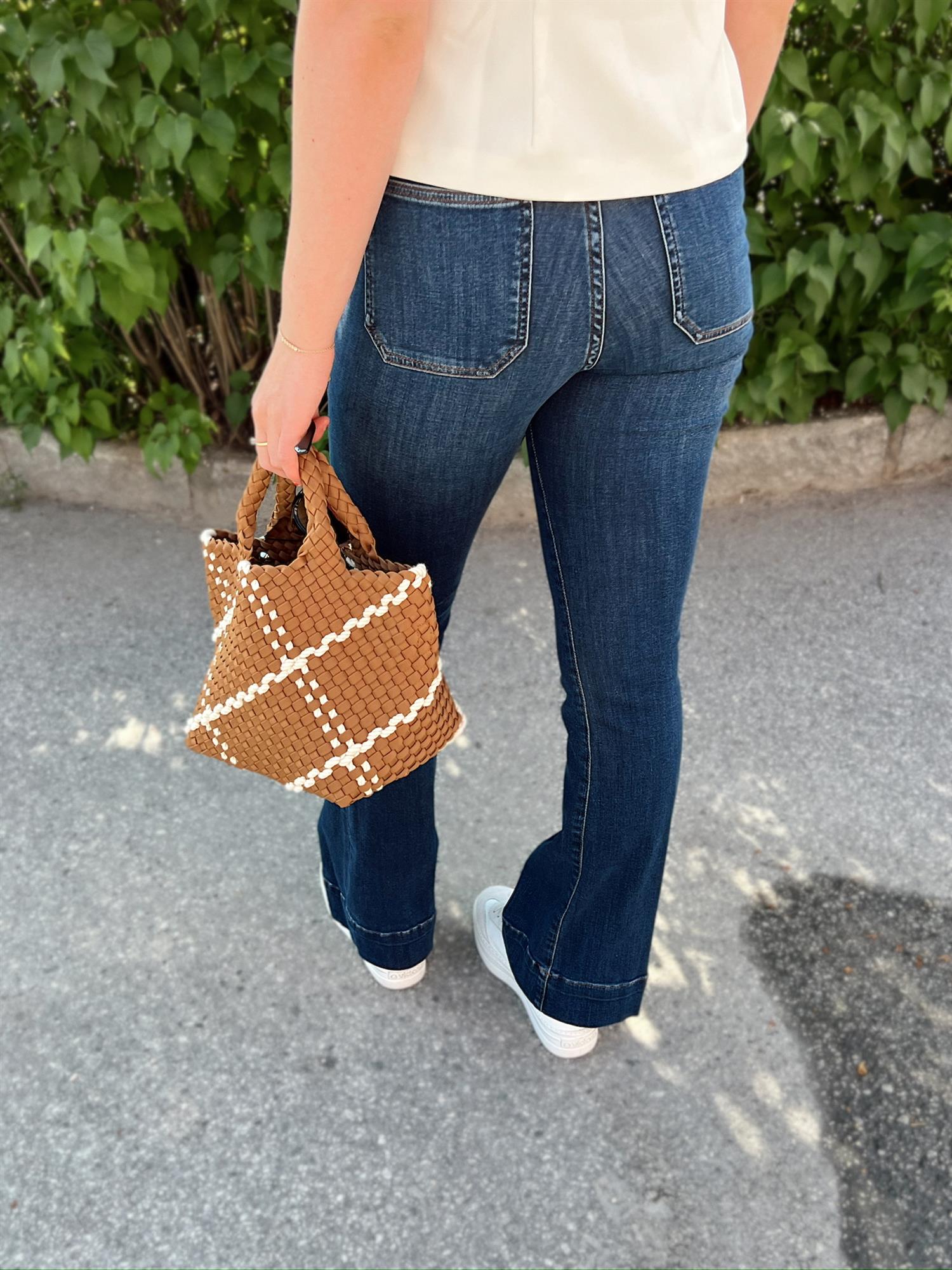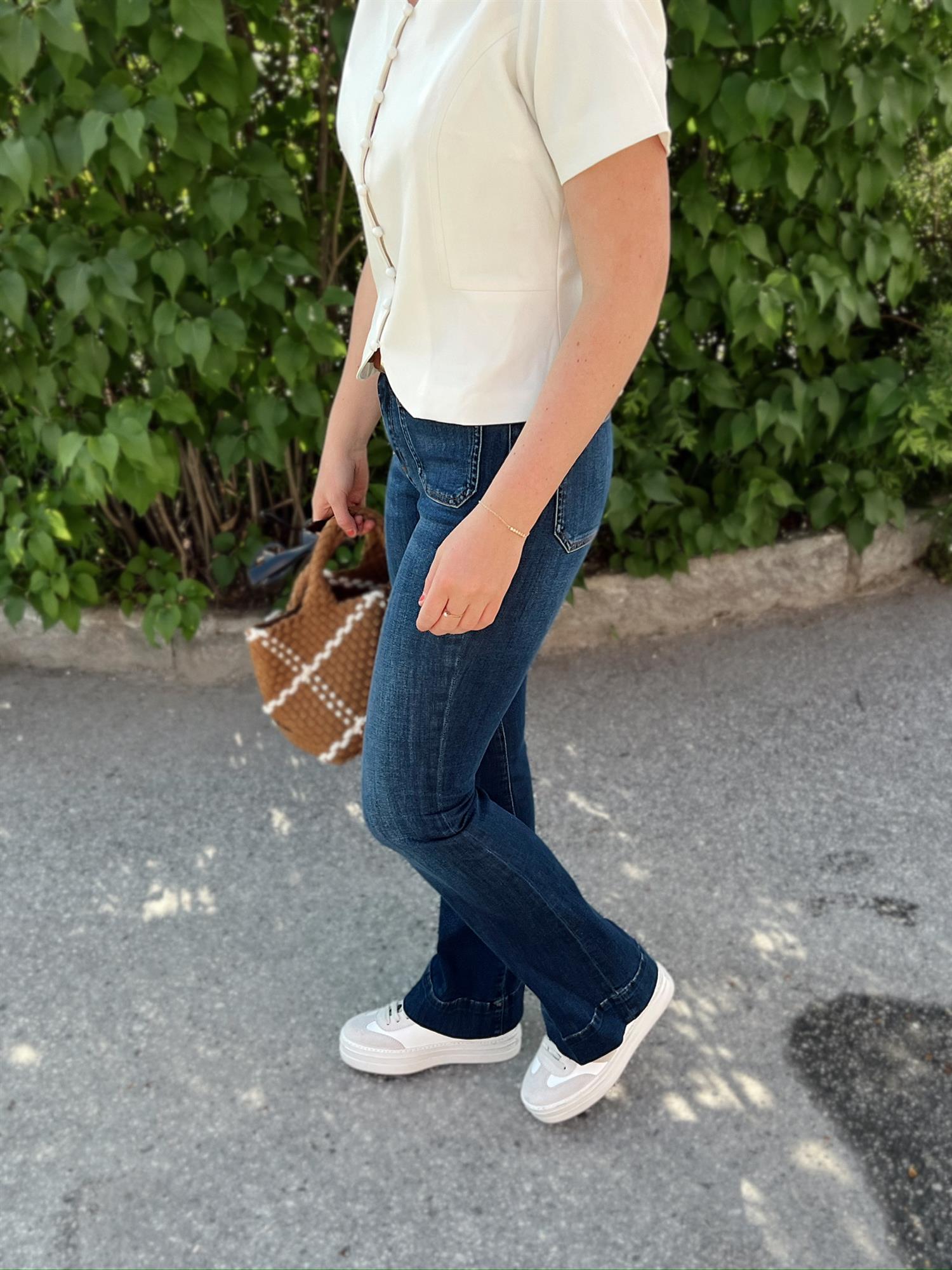 Disse stilige og komfortable buksene i vasket denim fra Denim Studio er en drøm å ha på seg! Med en lett utsvinget passform og god stretch sitter de flatterende og gir maksimal bevegelighet. De røffe lommene i front tilfører detalj til buksen, mens den myke kvaliteten gjør dem perfekte til både hverdags og mer oppkledde anledninger.