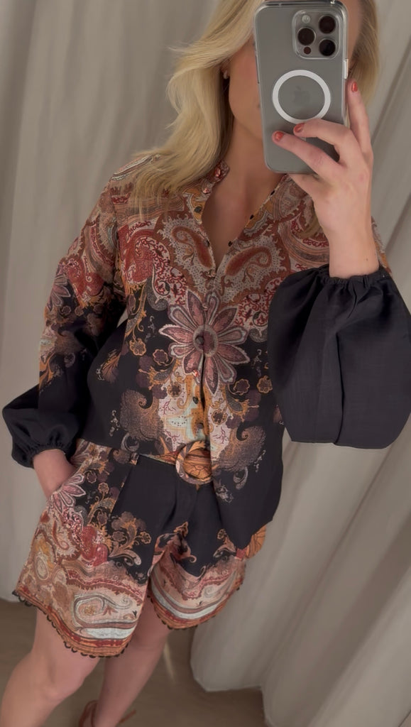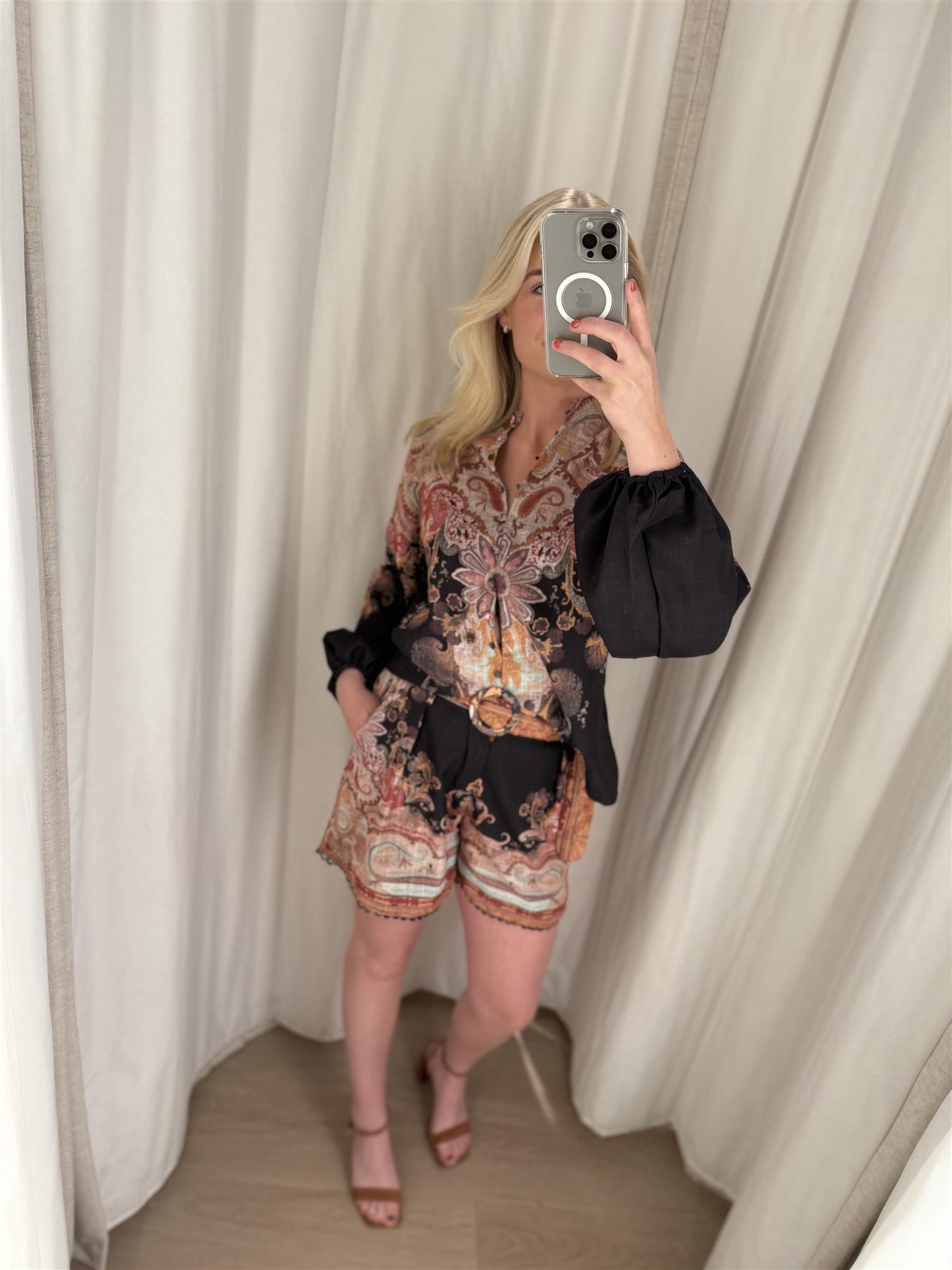 Denne drømmende shortsen fra From Paris With Love kombinerer komfort med sofistikert bohemsk eleganse. Med sitt detaljrike paisley- og blomsterinspirerte print gir den et eksklusivt og gjennomført uttrykk – perfekt til både hverdags og feriedager.