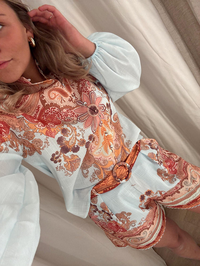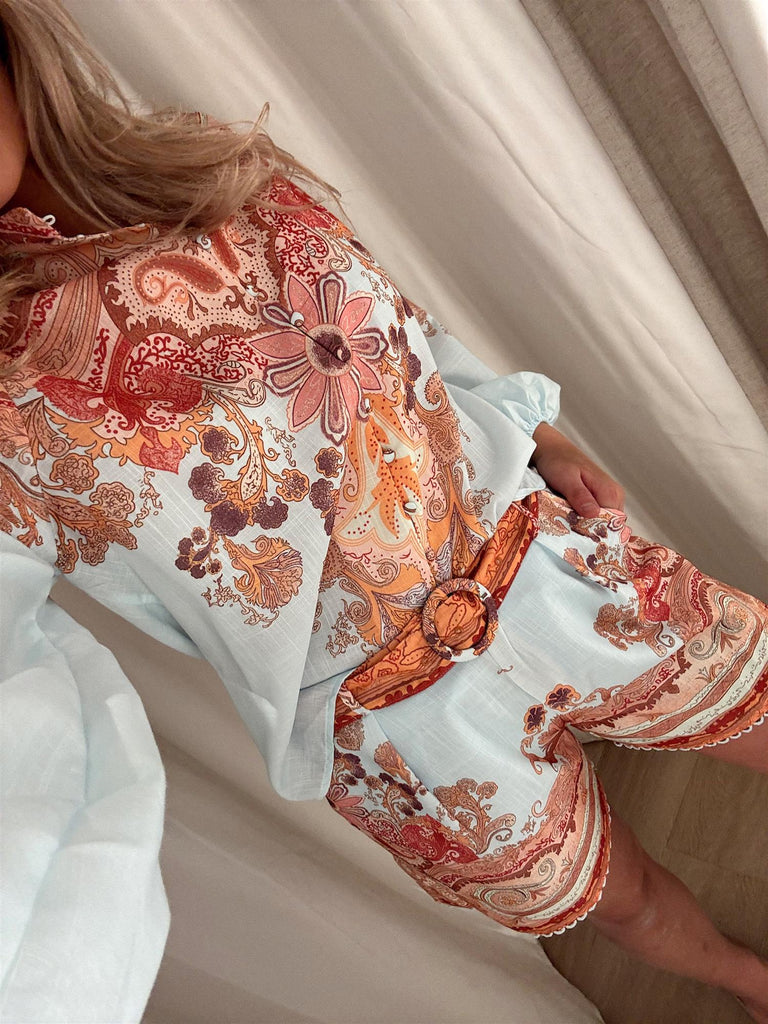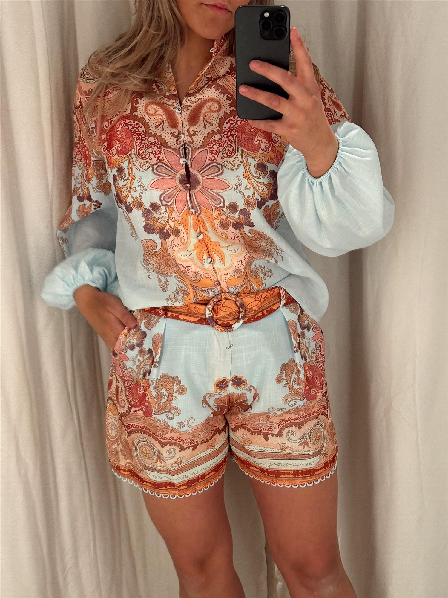 Denne drømmende shortsen fra From Paris With Love kombinerer komfort med sofistikert bohemsk eleganse. Med sitt detaljrike paisley- og blomsterinspirerte print gir den et eksklusivt og gjennomført uttrykk – perfekt til både hverdags og feriedager.