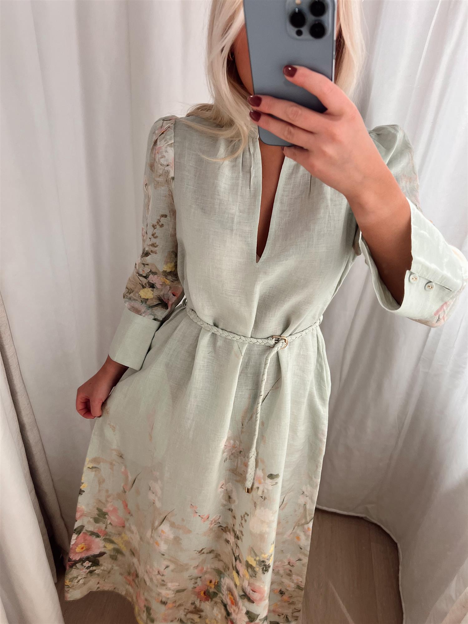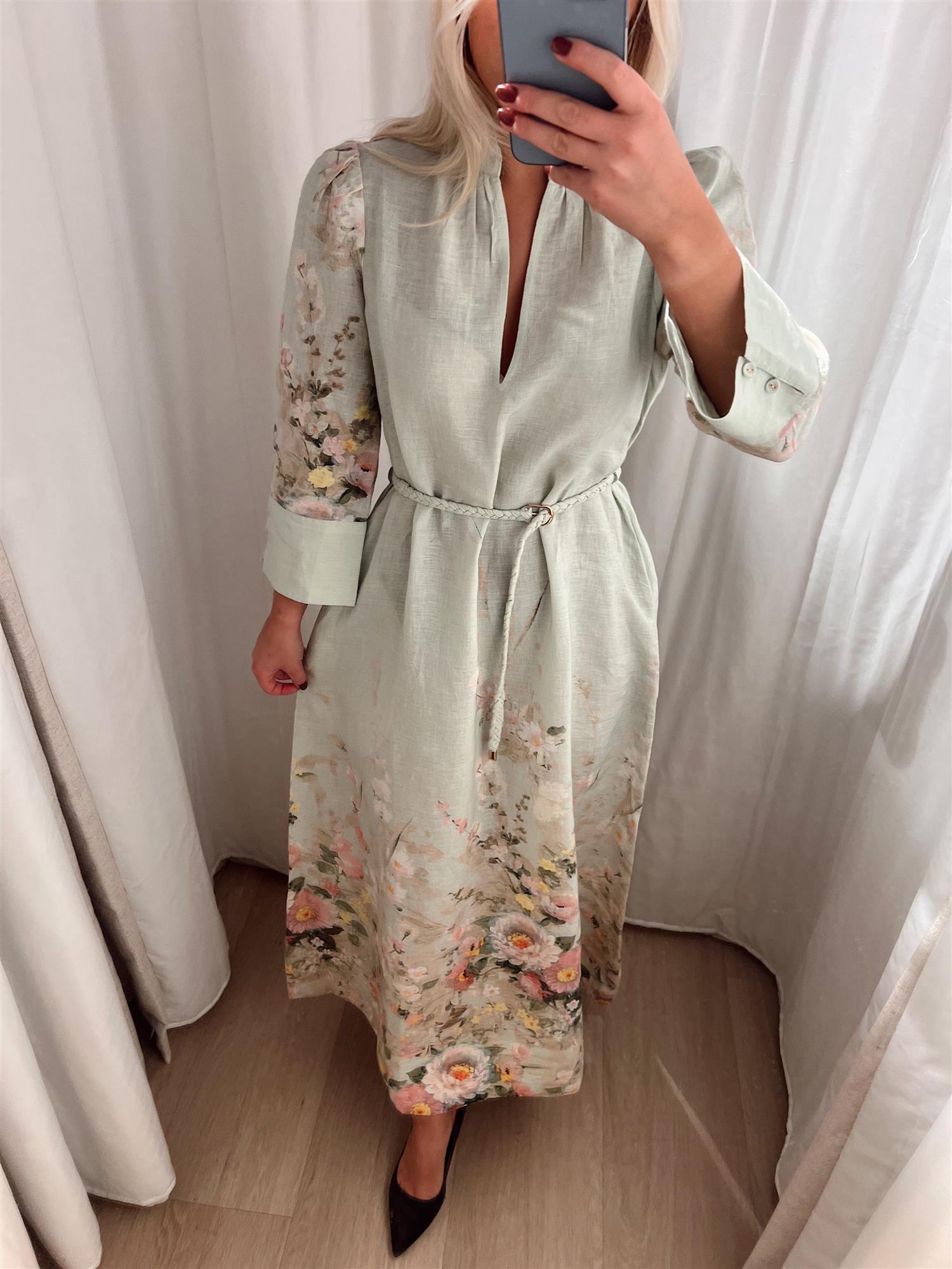 Den har en feminin V-utringning og trekvartlange ermer med brede, firkantede mansjetter som tilfører et sofistikert og moderne uttrykk. Det medfølgende flettede beltet markerer midjen og gir deg mulighet til å variere stylingen etter ønske.