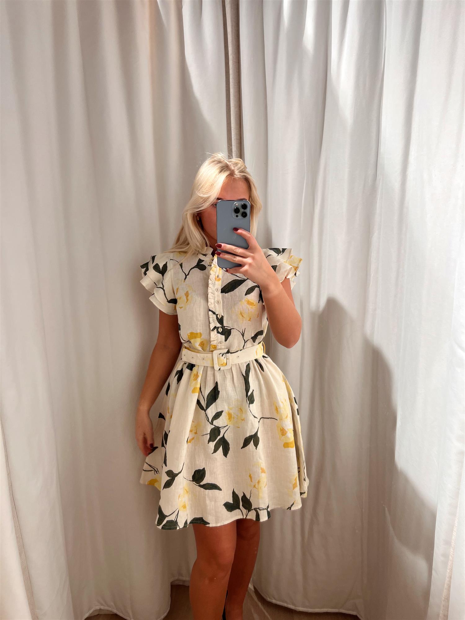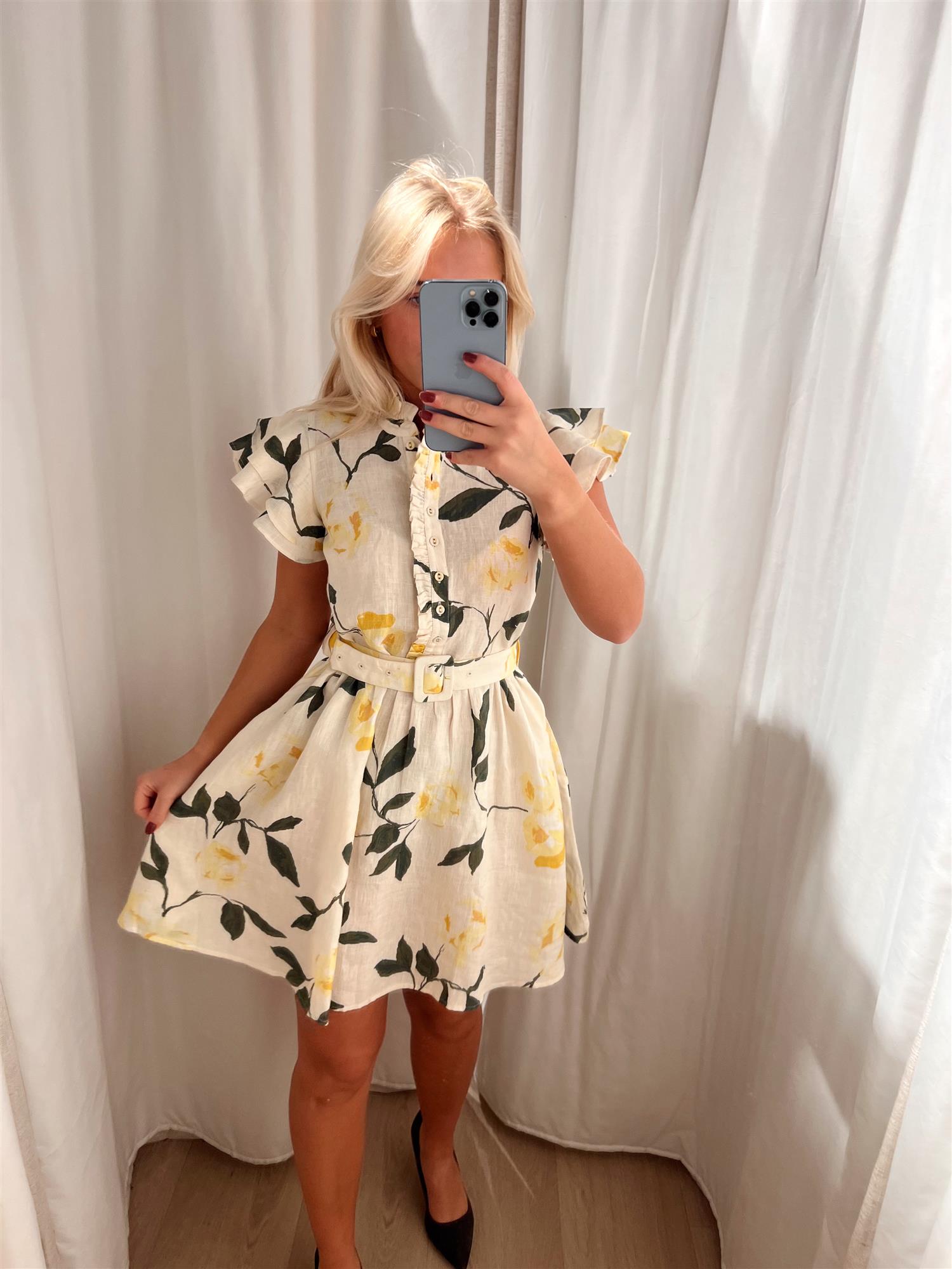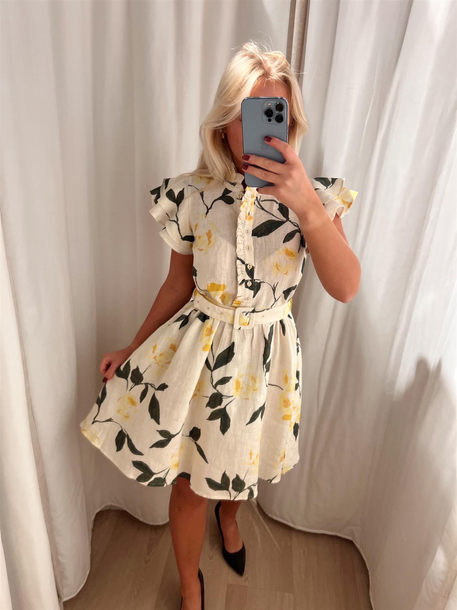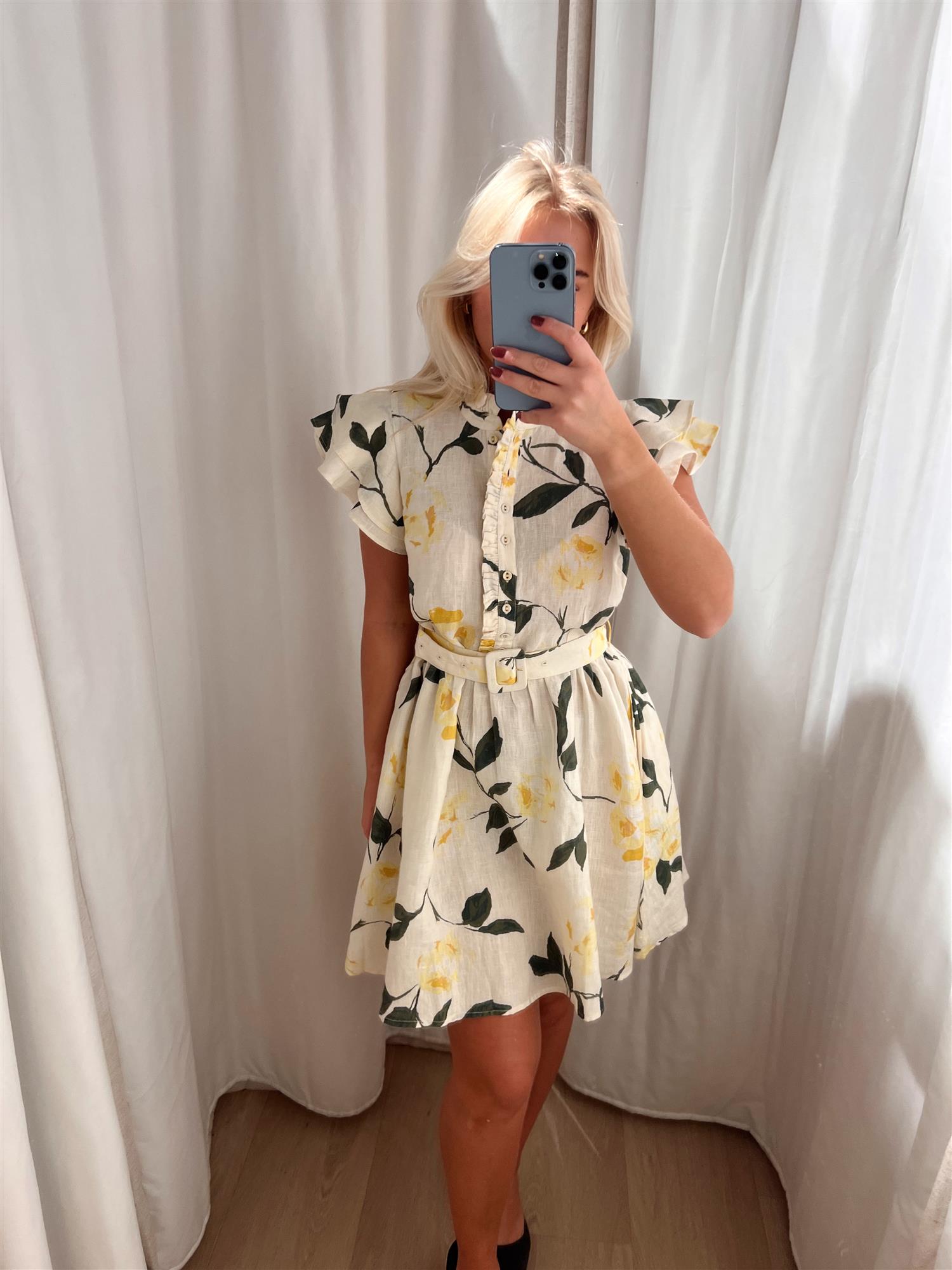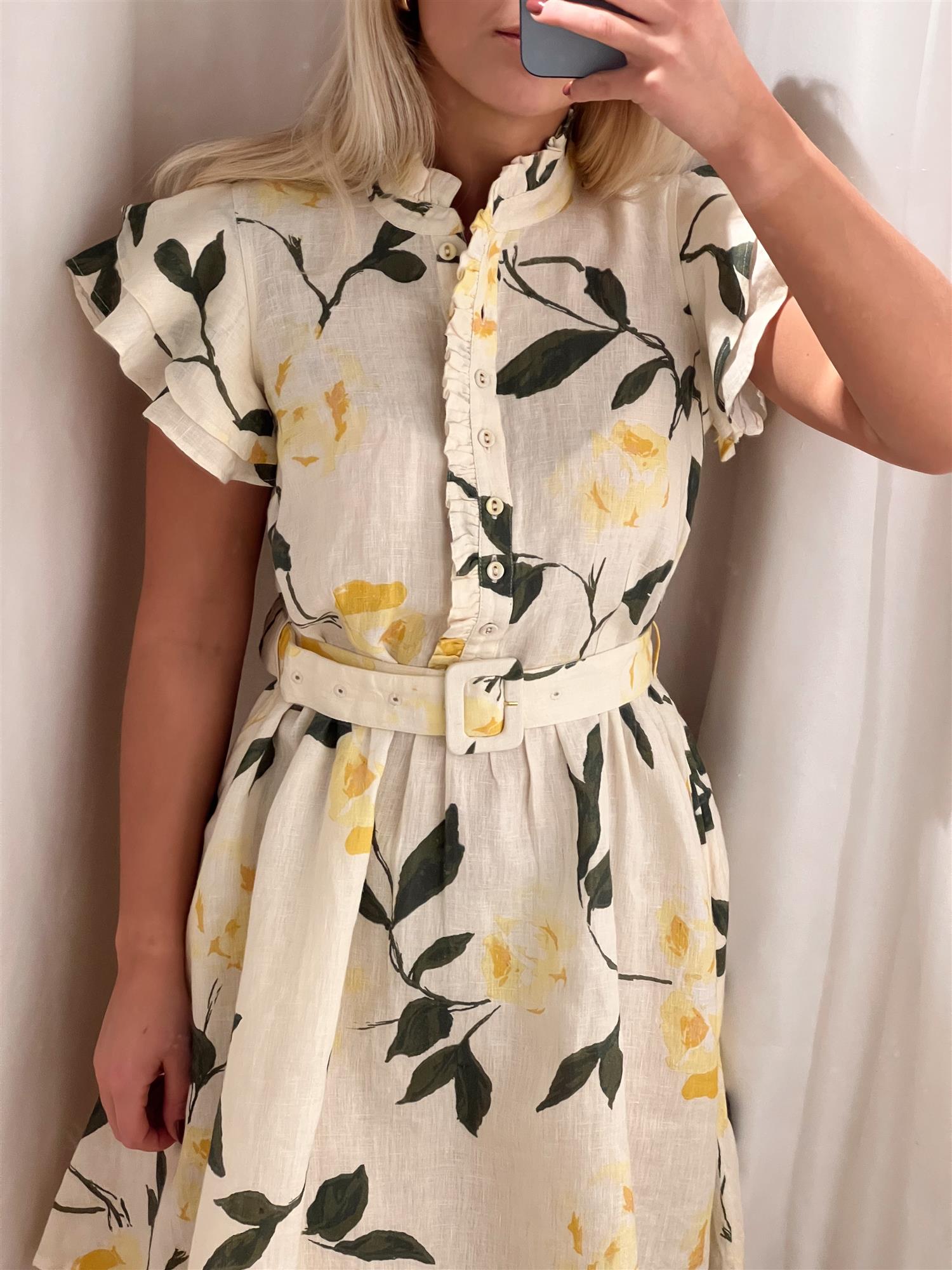 Den er designet med en elegant mandarinkrage med volangdetaljer, knapper nedover brystet og dekorative volanger over skuldrene som tilfører et romantisk og sofistikert uttrykk. Kjolen kommer med et matchende belte som markerer midjen, og lukkes med en diskret glidelås i siden for en sømløs finish.