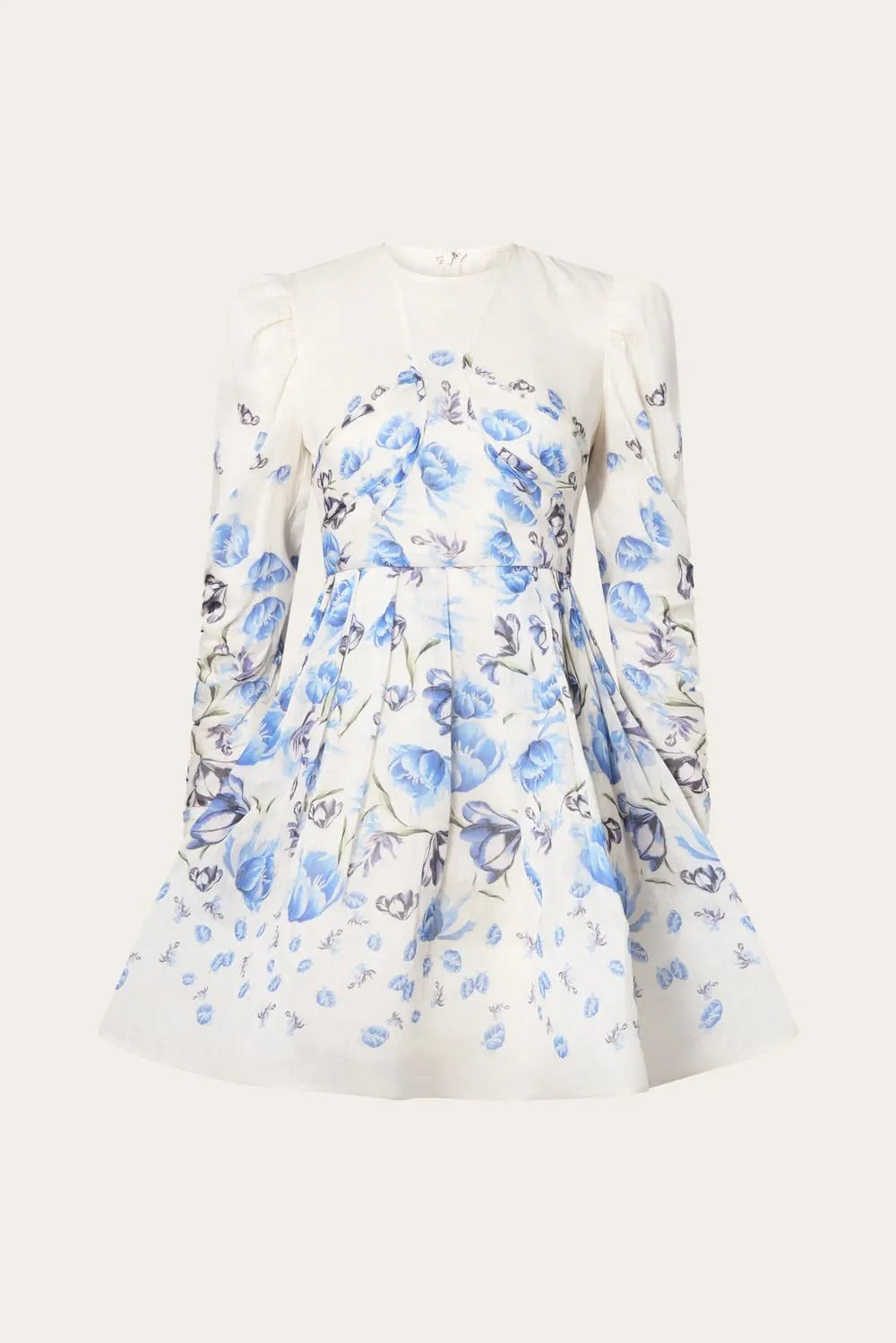 Trykt minikjole med lange ermer i en eksklusiv silkeblanding som gir et lett og sofistikert uttrykk. Kjolen har delikate rynkedetaljer, plisserte partier og fine paspoleringsdetaljer som fremhever den gjennomførte designen og gir en feminin silhuett.