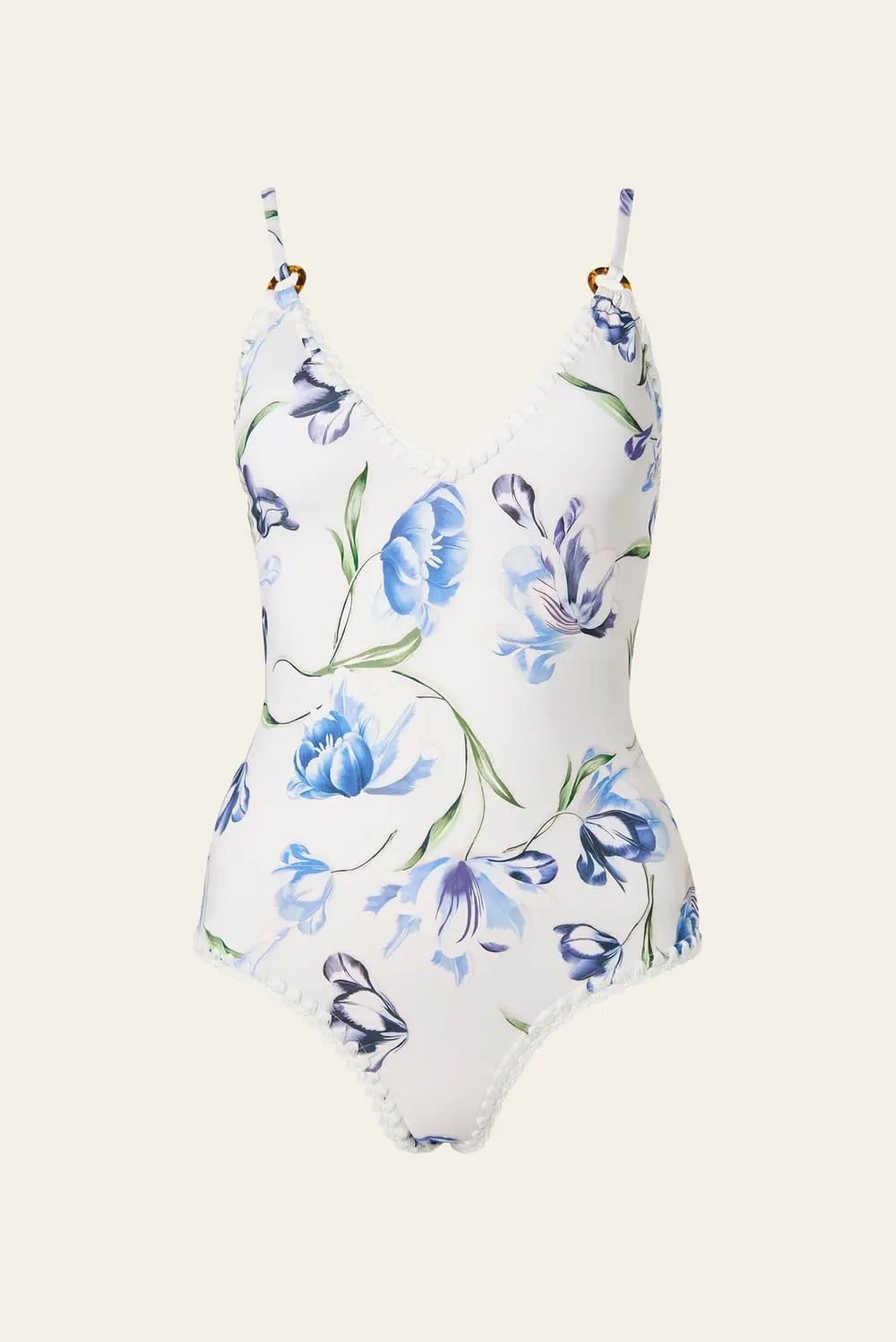 Badedrakt fra Malina med elegante ringdetaljer i skilpaddefarge og flatterende V-hals som fremhever silhuetten på en feminin måte. De heklede detaljene gir et sofistikert og eksklusivt uttrykk, mens justerbare stropper sørger for optimal tilpasning og komfort. Modellen har polstrede kopper med avtakbart innlegg som gir lett støtte og en naturlig fasong.