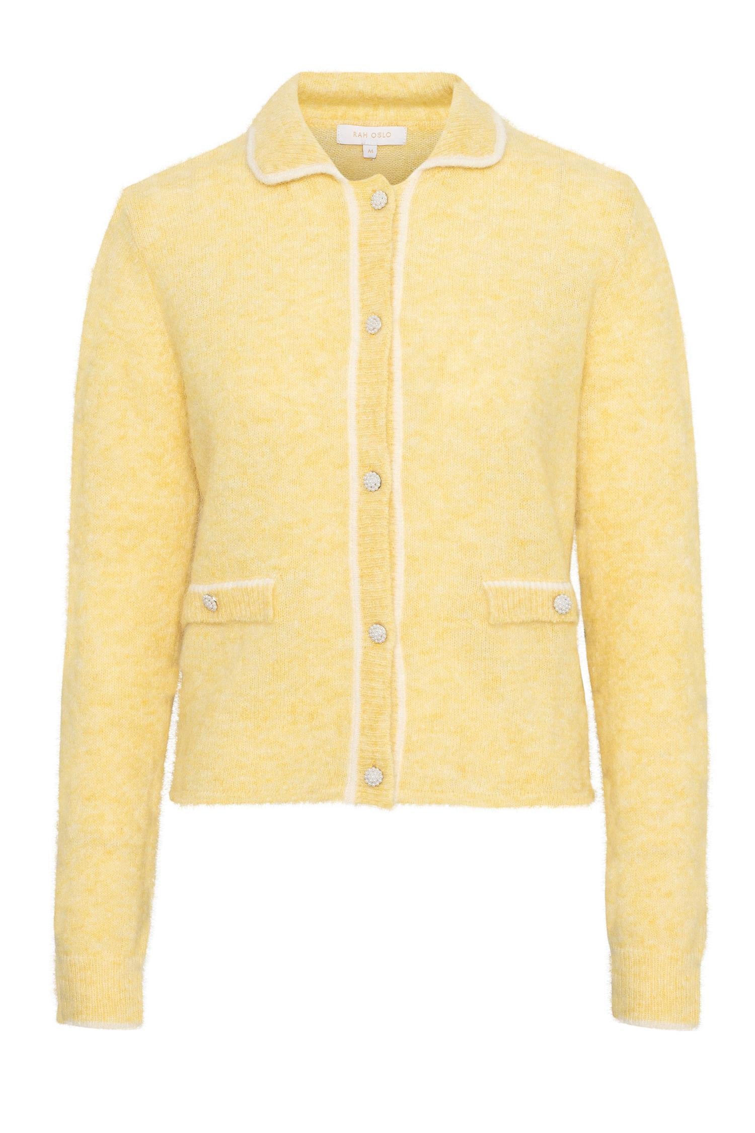 En elegant og feminin cardigan i RAH OSLOs populære kidmohair-kvalitet. Cardiganen har krage, dekorative knapper i front og lekre kontrastdetaljer som gir et sofistikert og tidløst uttrykk. Den rette fasongen gjør den like fin lukket som åpen – perfekt både til skjørt, kjoler og bukser.