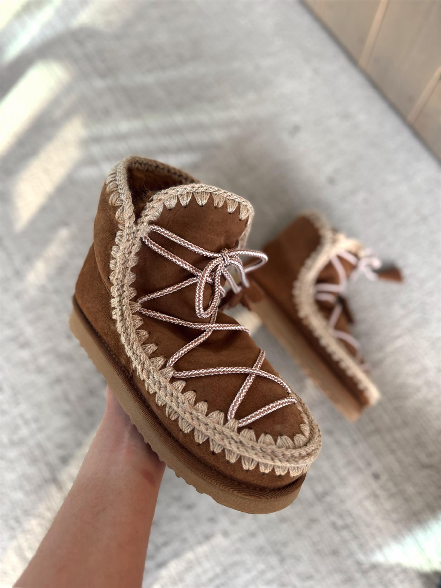 Eskimo 18 Scoubidou Lace fra MOU er en luksuriøs vinterfavoritt som kombinerer tidløst design med førsteklasses komfort. Støvlene er håndlaget i varmt, doblet saueskinn og dekorert med MOUs ikoniske hekledetaljer i ull. En støttende hælkappe og en slitesterk såle i EVA og gummi sørger for god støtte og høy slitestyrke, mens den lekre snøringen gir et unikt uttrykk.