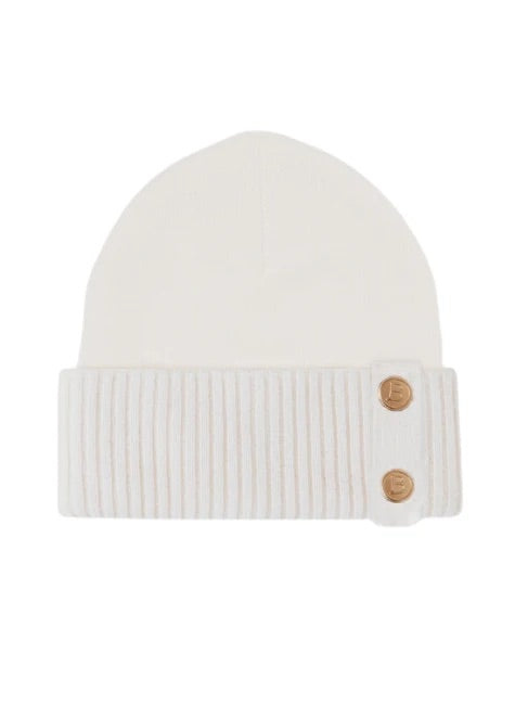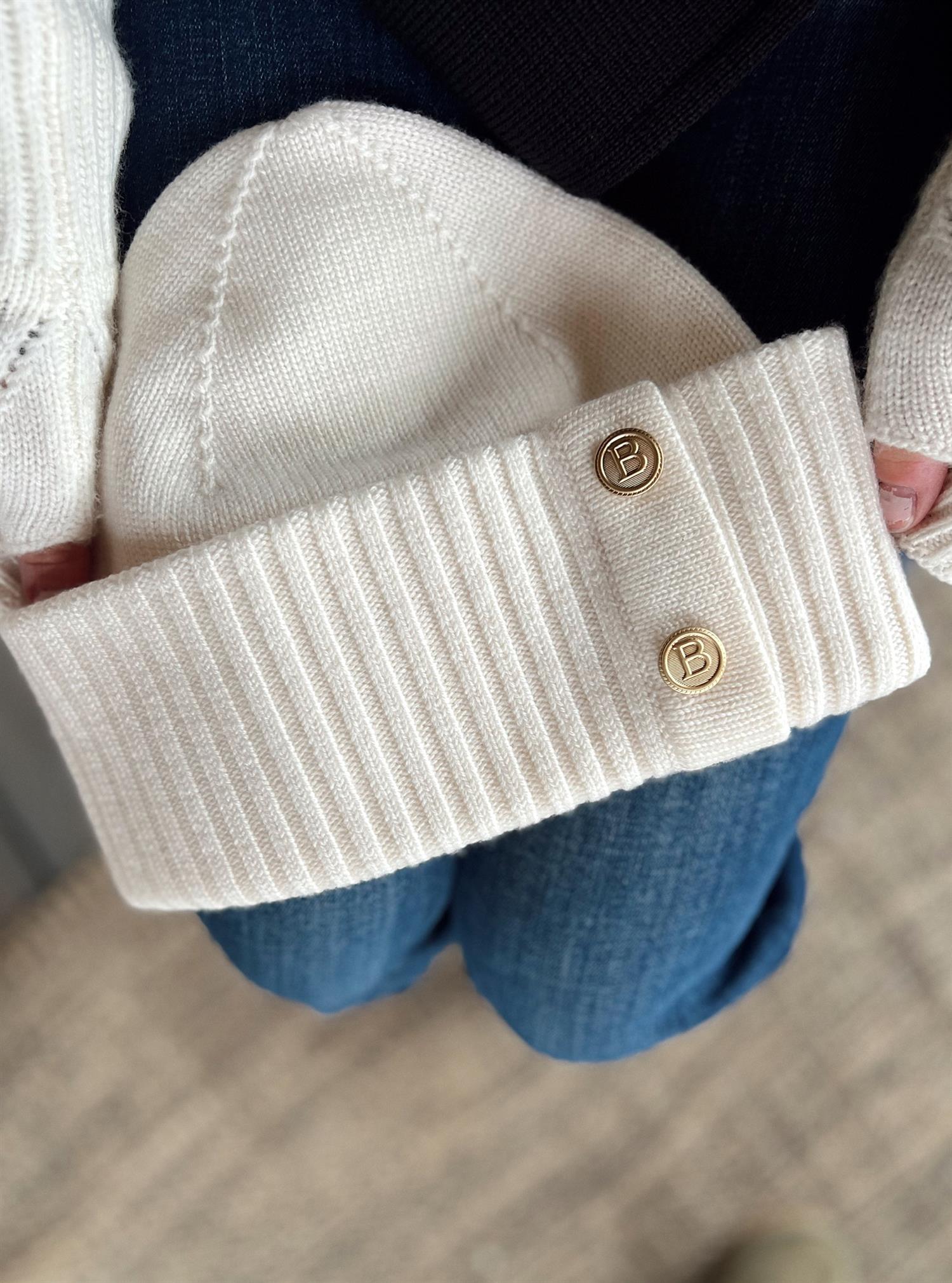 Roya Beanie er en ribbestrikket lue laget av myk merinoull. Luen har en brettet kant som er pyntet med gullfargede B-knapper, perfekt for både varme og stil.