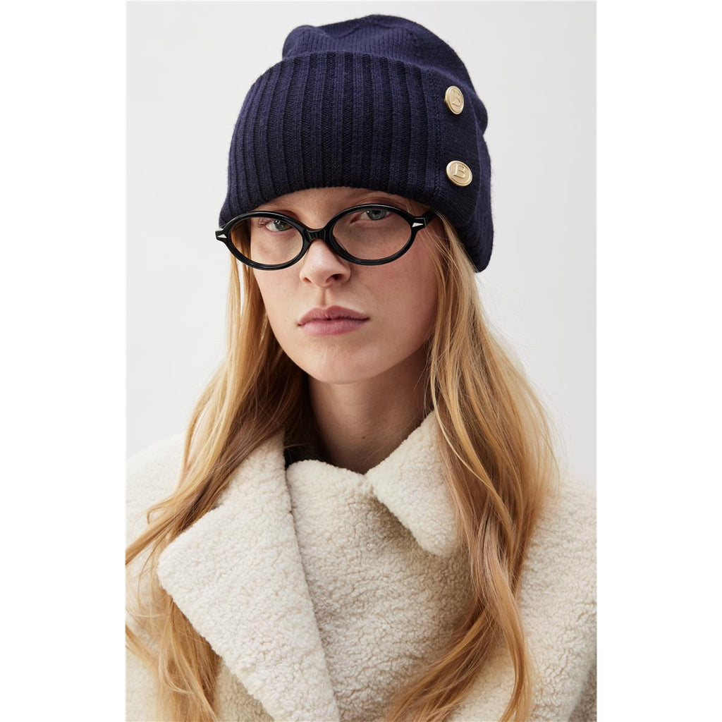 Roya Beanie er en ribbestrikket lue laget av myk merinoull. Luen har en brettet kant som er pyntet med gullfargede B-knapper, perfekt for både varme og stil.