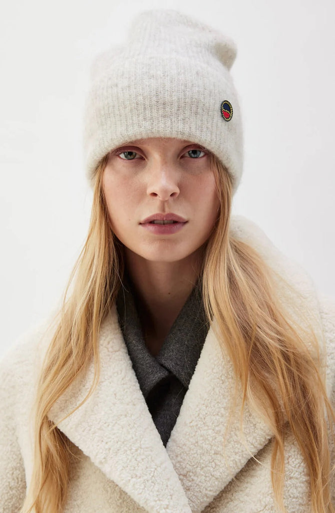 iel Beanie er en myk og varm lue strikket i en mohairblandet garnkvalitet. Luen har en glatt og fluffy tekstur, og en oppbrettet kant som gir ekstra varme og komfort.