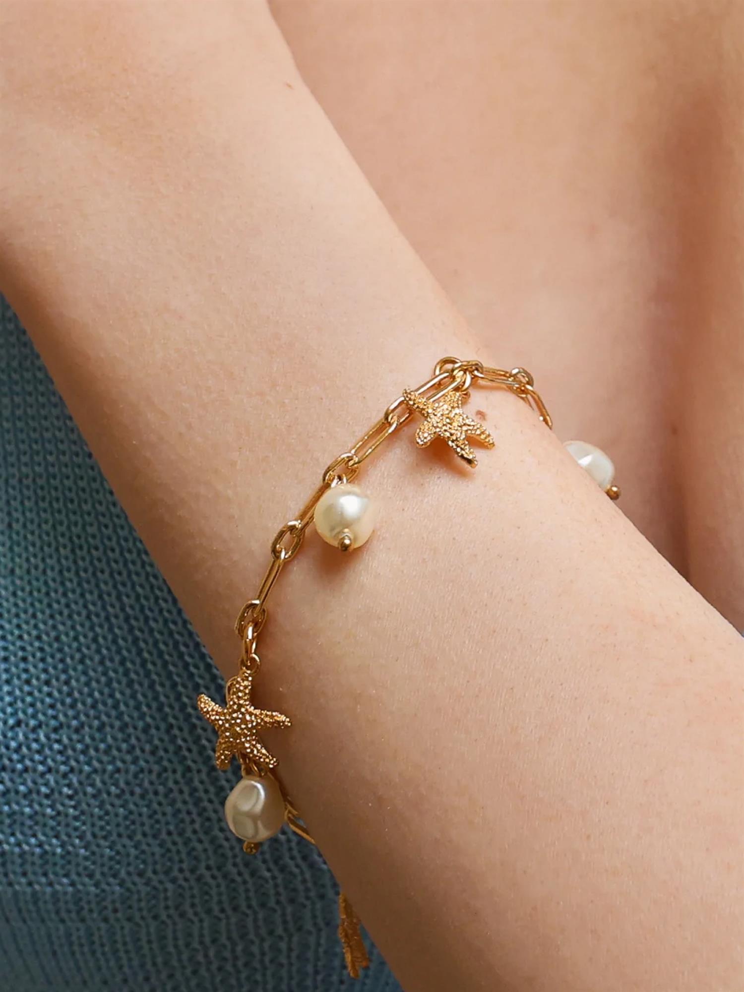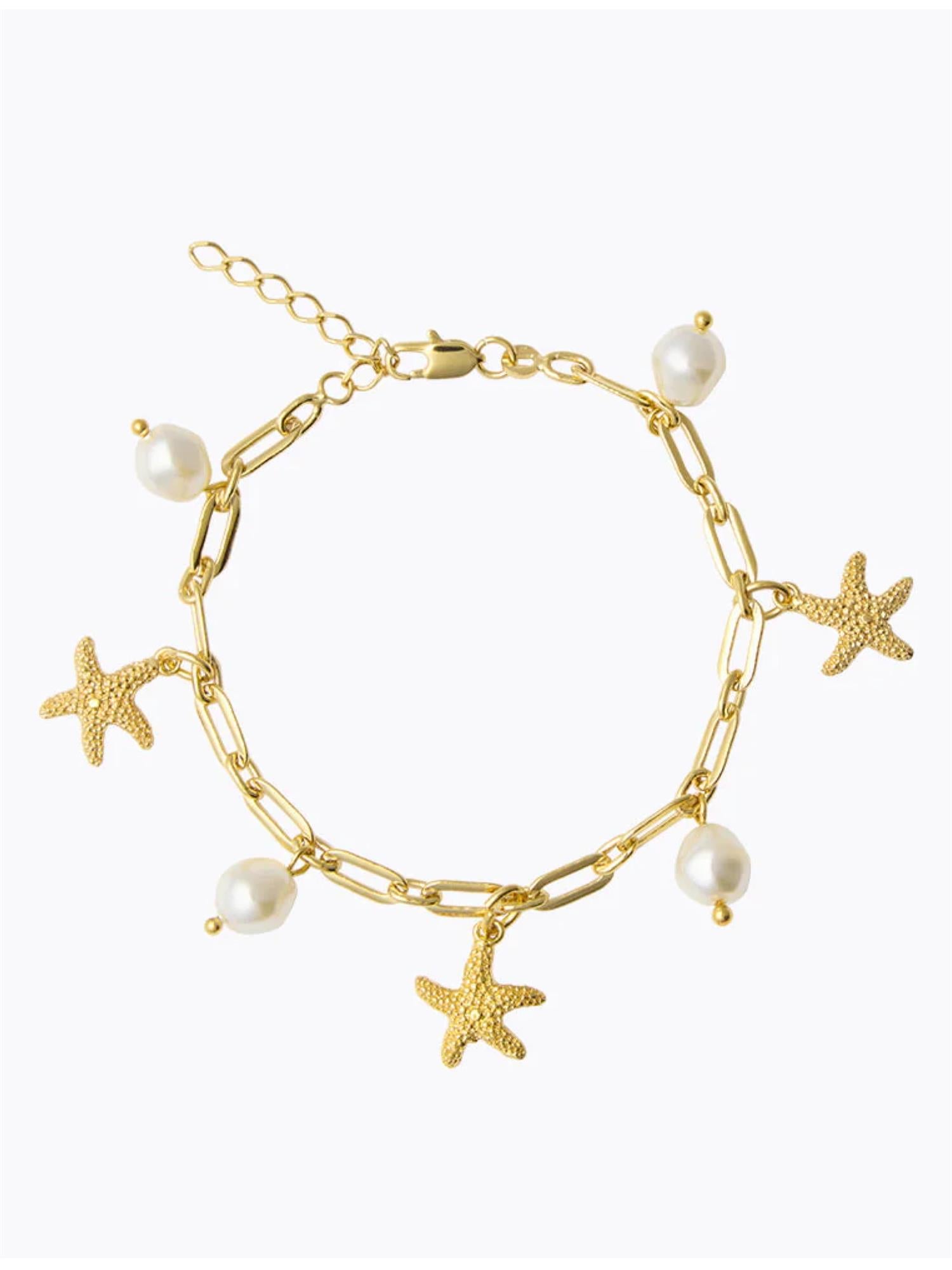 Sea Star Chain Bracelet er et drømmende smykke inspirert av havet, dekorert med delikate sjøstjerneanheng og glansfulle perler. Det lekne, men elegante designet gjør armbåndet perfekt for alle sommerens eventyr – enten det er på stranden, i byen eller på ferie.