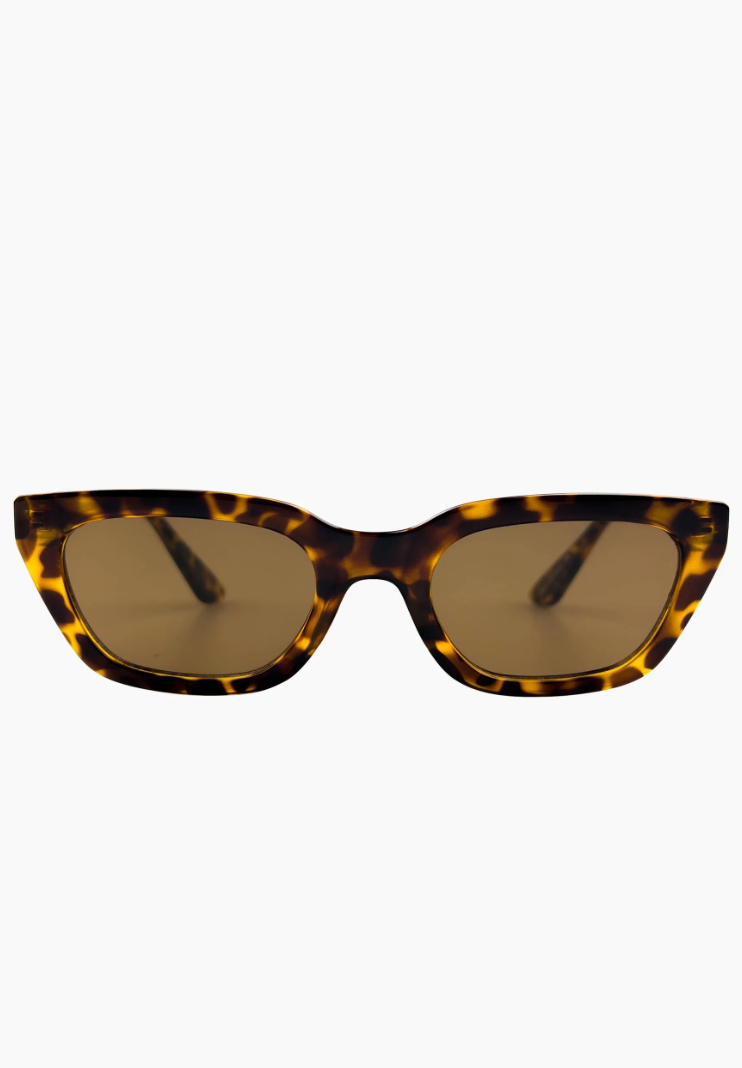 Klassisk og feminin solbrille med en avrundet cateye-fasong. Tortoiseshell-innfatningen gir et tidløst uttrykk, mens de brune linsene gir både stil og beskyttelse med 100 % UV-filter. Leveres med et beskyttende vegansk etui.