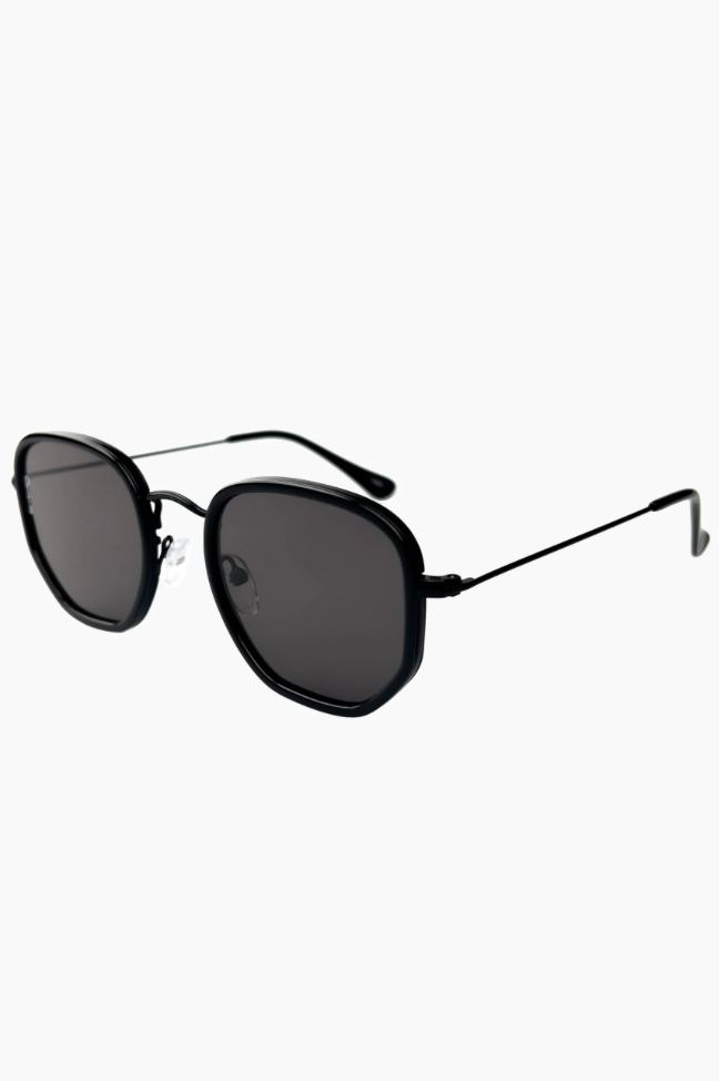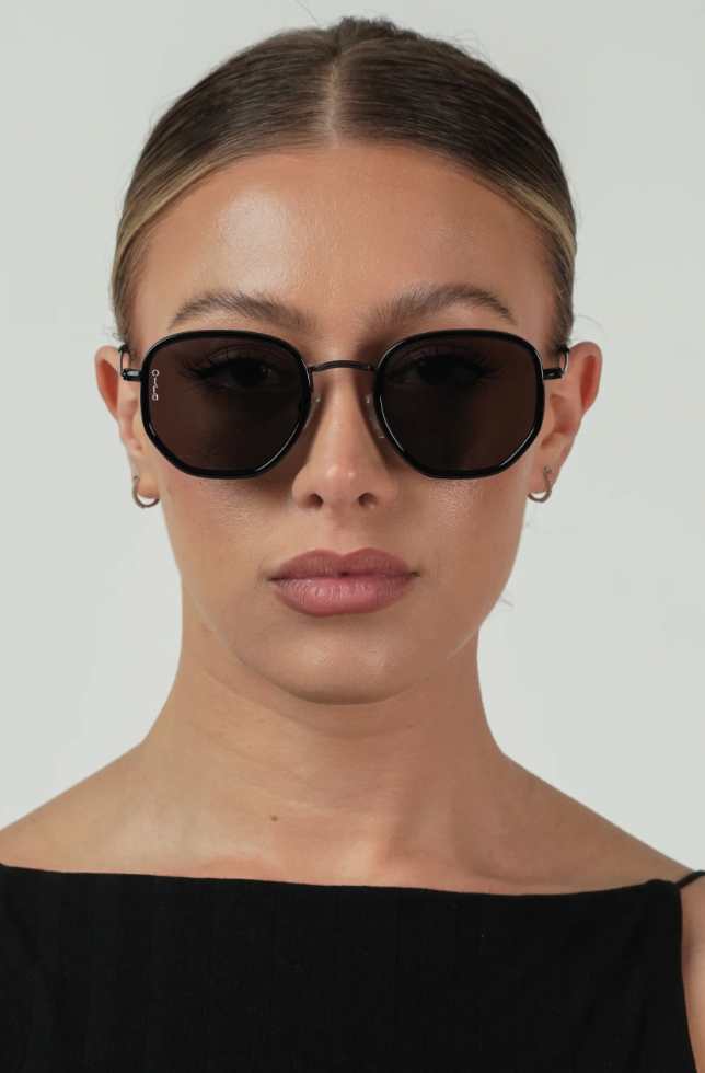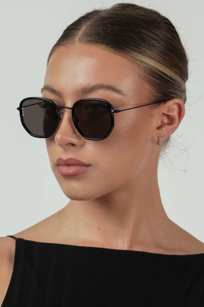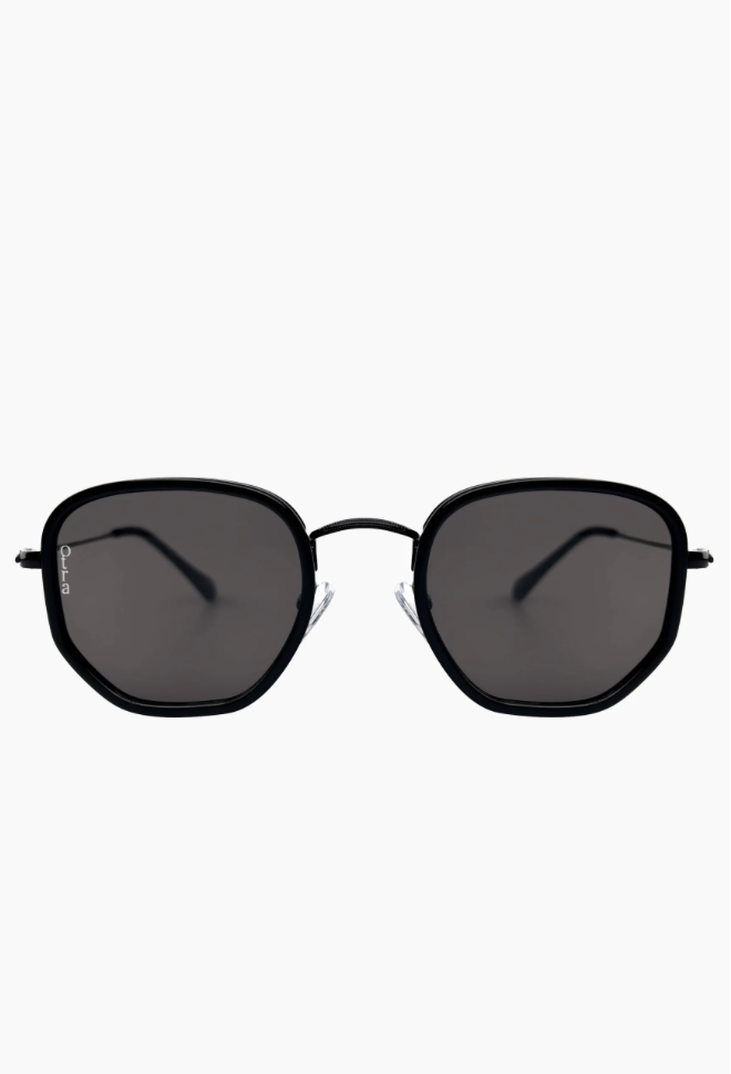 Tate fra Otra er en moderne solbrille med en elegant, sekskantet metallramme i sort. Med sitt minimalistiske design og rene linjer gir den et sofistikert og edgy uttrykk som passer like godt til hverdags som til mer pyntede anledninger.