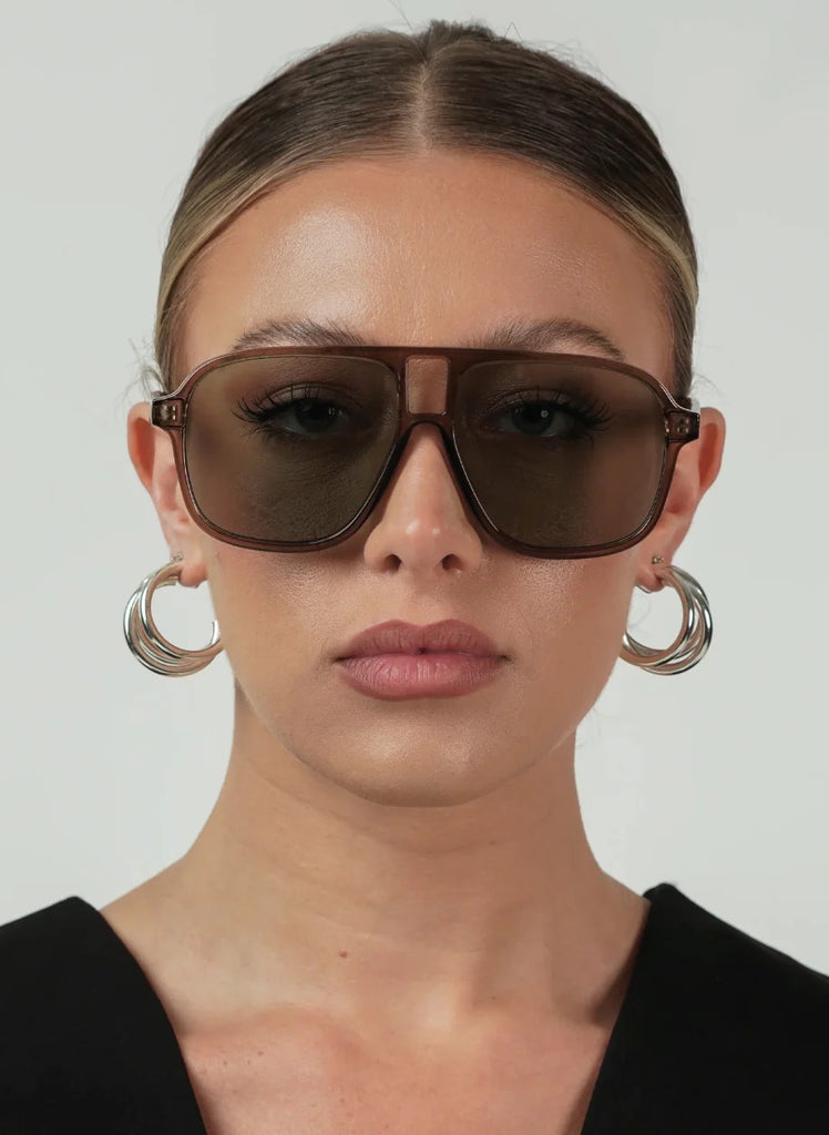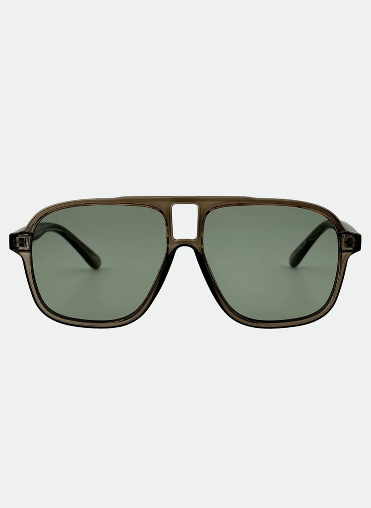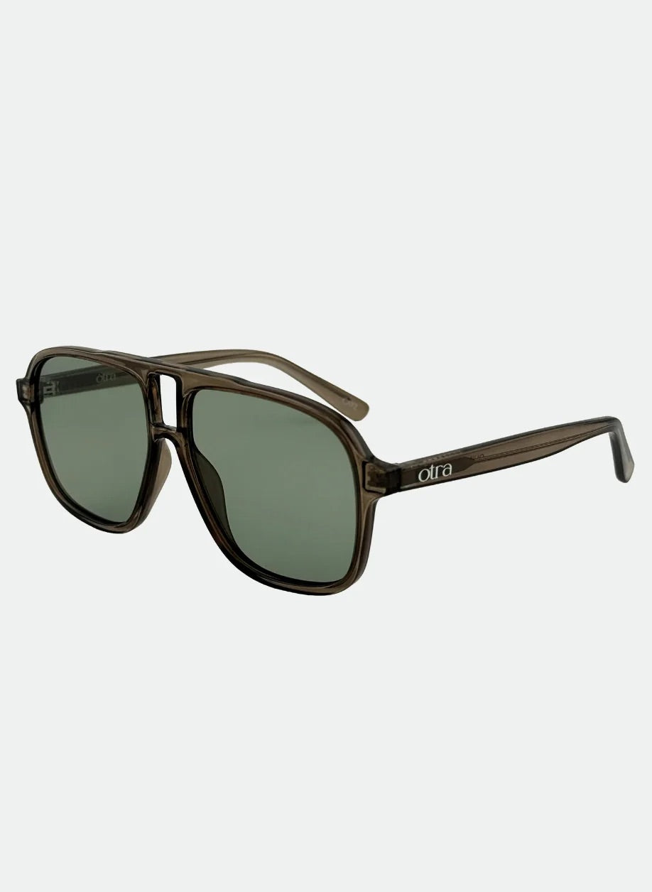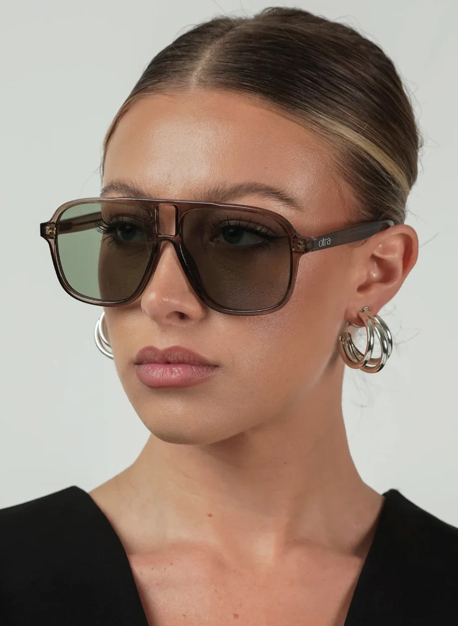 Quinn fra australske Otra Eyewear er et par statement-solbriller med tydelig attityde. Den oversized pilotfasongen kombinerer retro og moderne på elegant vis, mens den transparente grå rammen og lysegrønne glassene gir et friskt og sofistikert uttrykk. Perfekt for deg som ønsker å løfte ethvert antrekk med en kul, men tidløs finish.