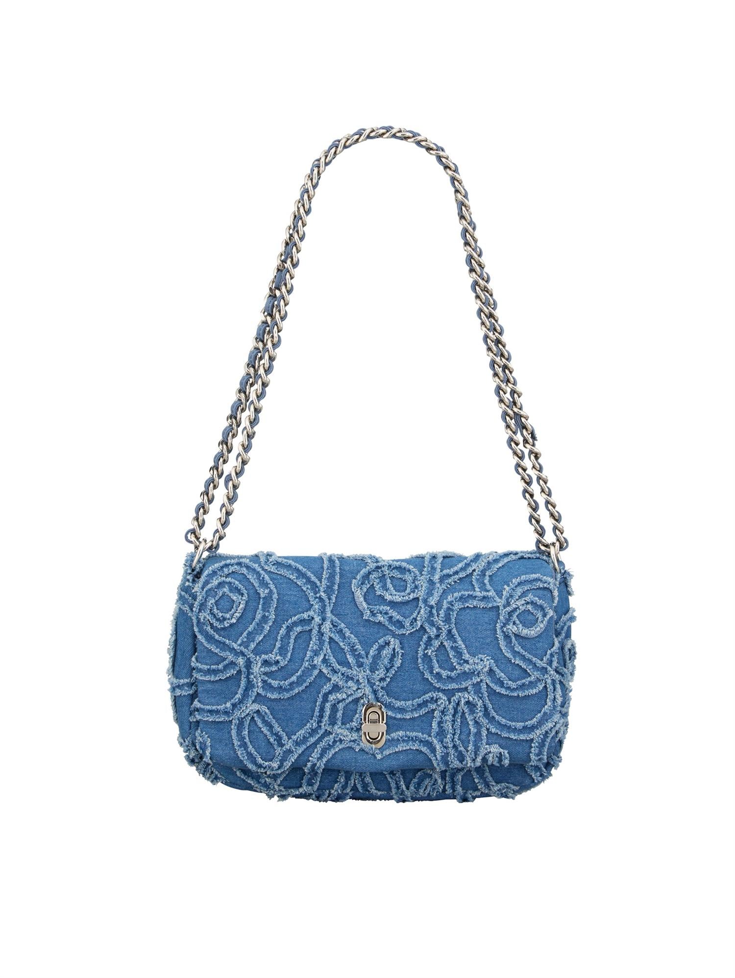 Den har en elegant klaff med dekorativ lås i front og en solid skulderrem i metallkjede med denimdetaljer, som gir et røft, men sofistikert preg. Størrelsen gjør den perfekt til både hverdagsbruk og fest – med plass til det viktigste du trenger gjennom dagen eller kvelden.