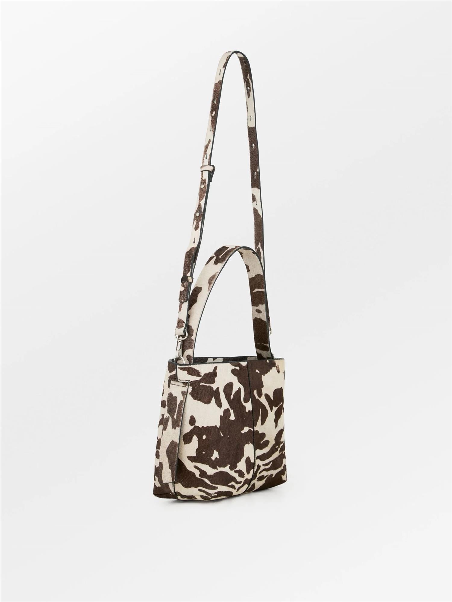 Texas Leather Small Fraya Bag er en stilsikker veske laget i 100% kuskinn, dekorert med et lekkert cow print i en varm brun tone. Med sine praktiske mål på 24 x 22 cm har den plass til alt du trenger i hverdagen, samtidig som den løfter antrekket med sitt unike design.