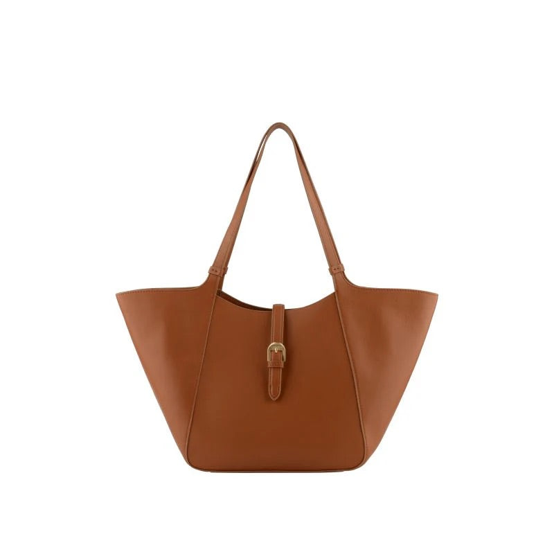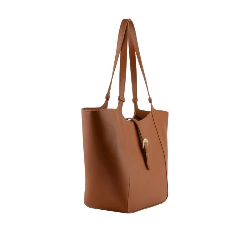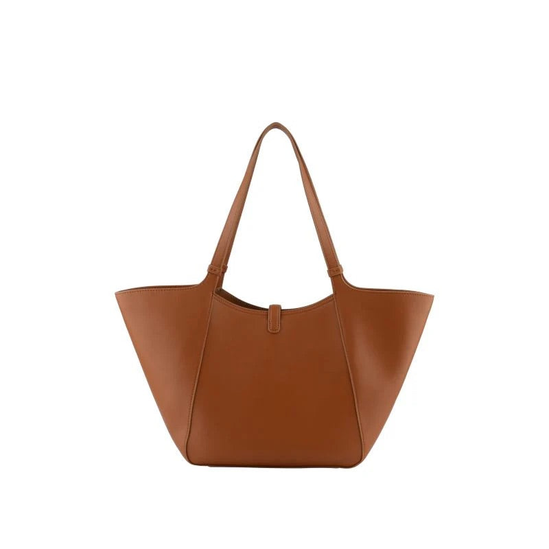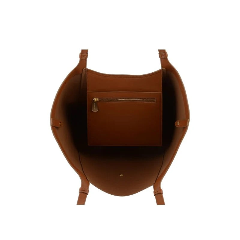 L’envolée tote bag i camel skiller seg ut med sitt skulpturelle og fleksible design, og gir unik allsidighet takket være to bruksformer: