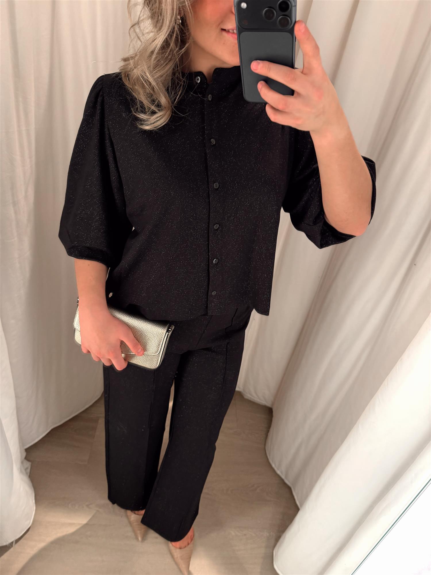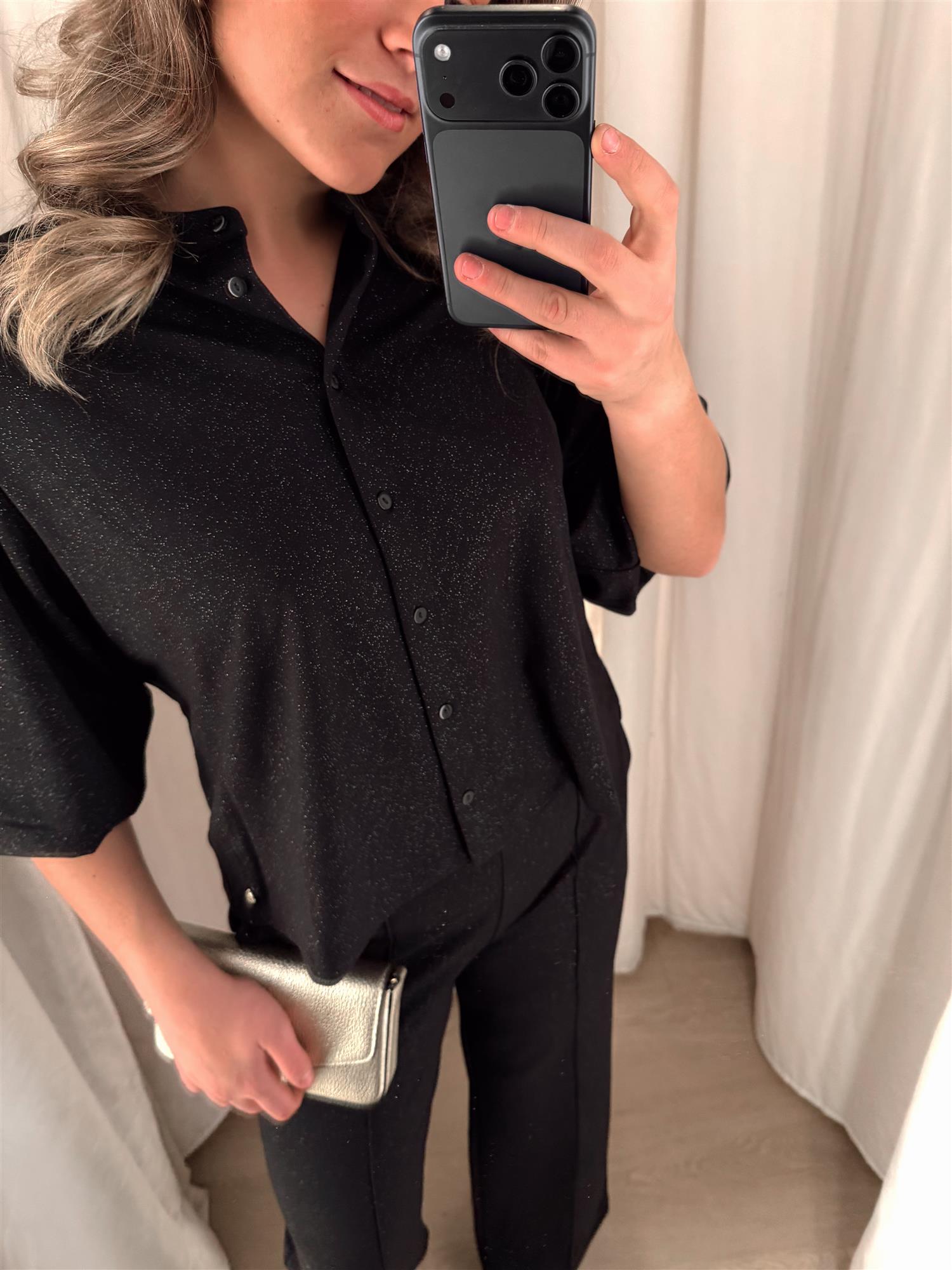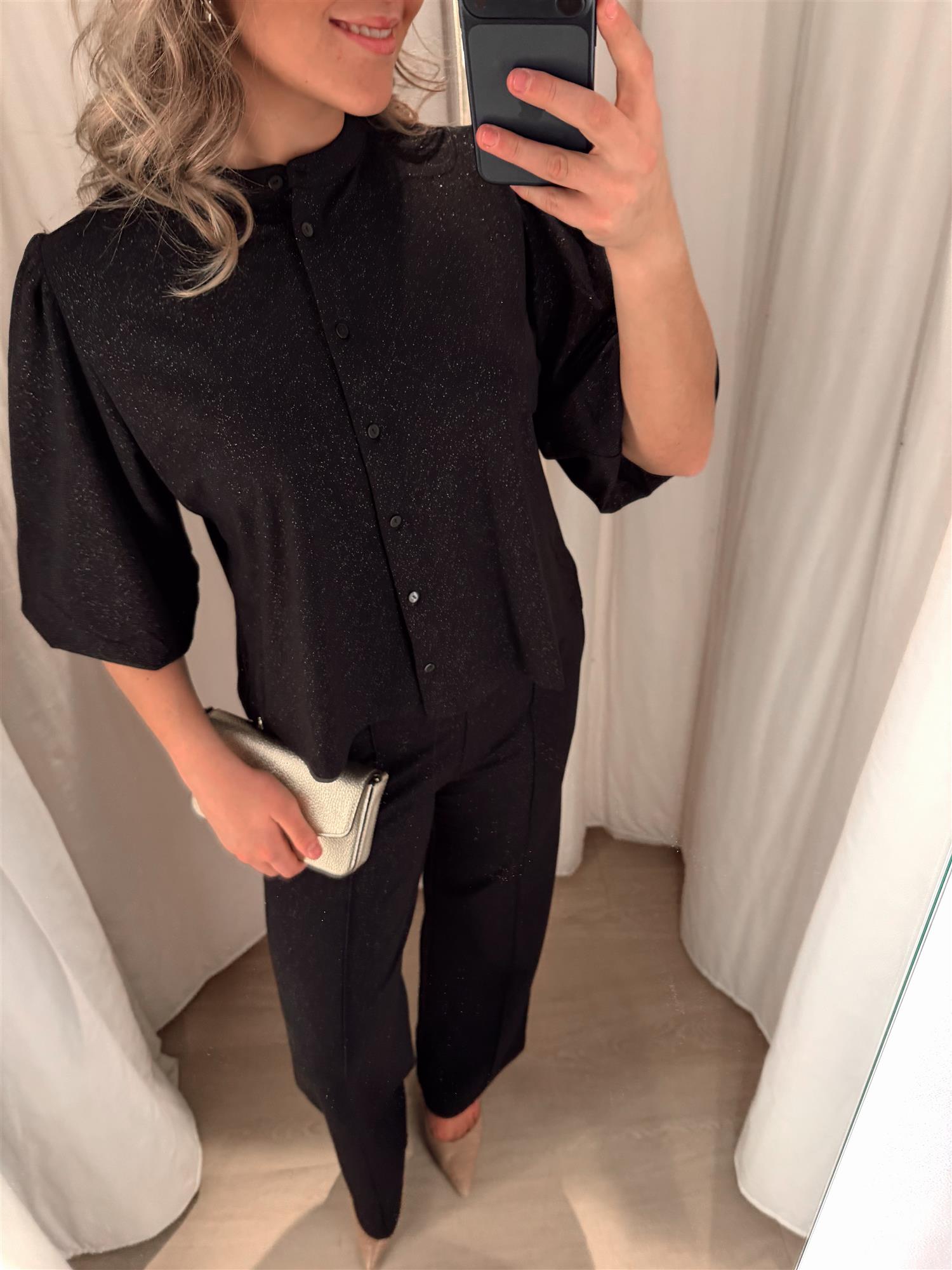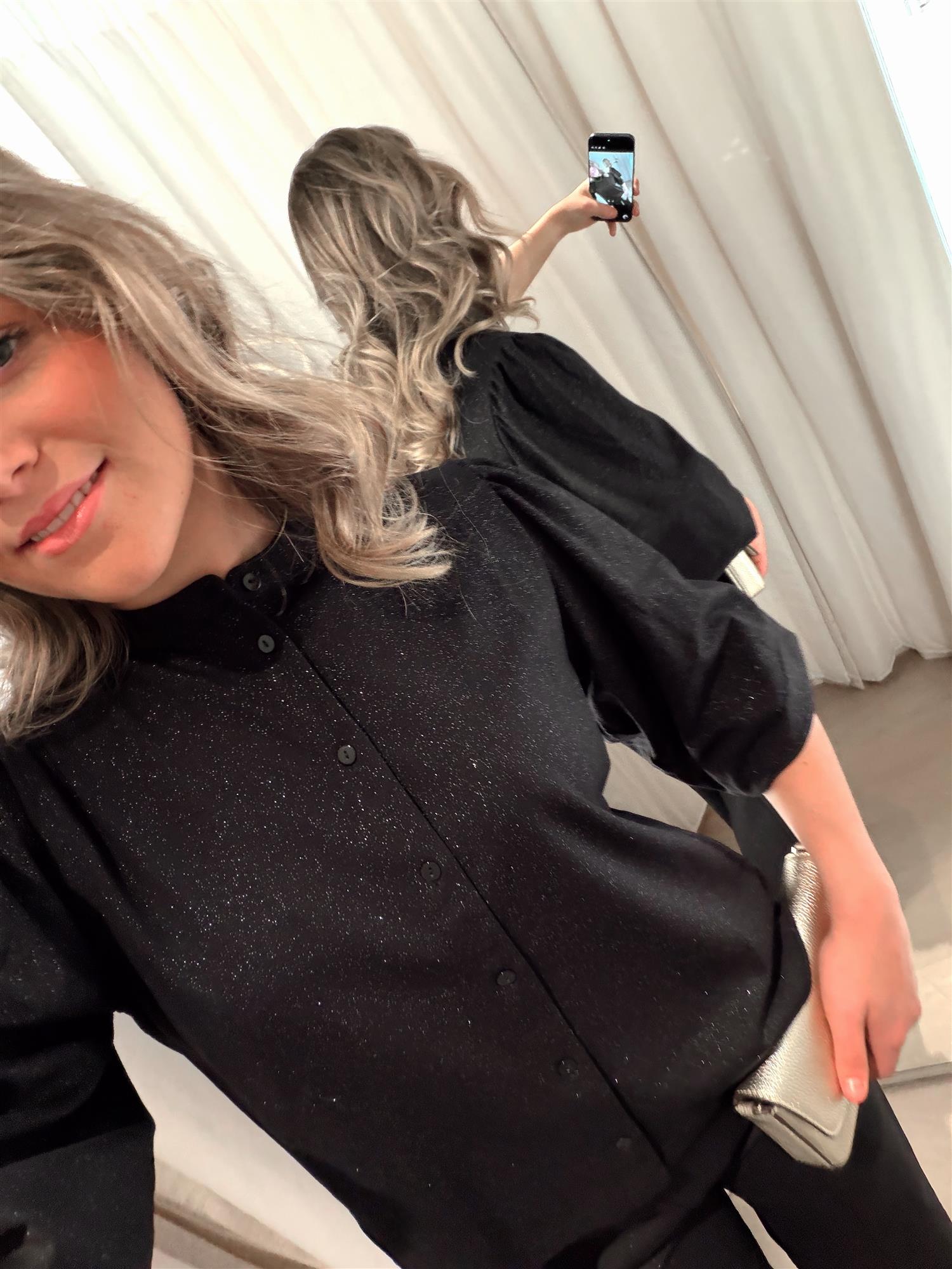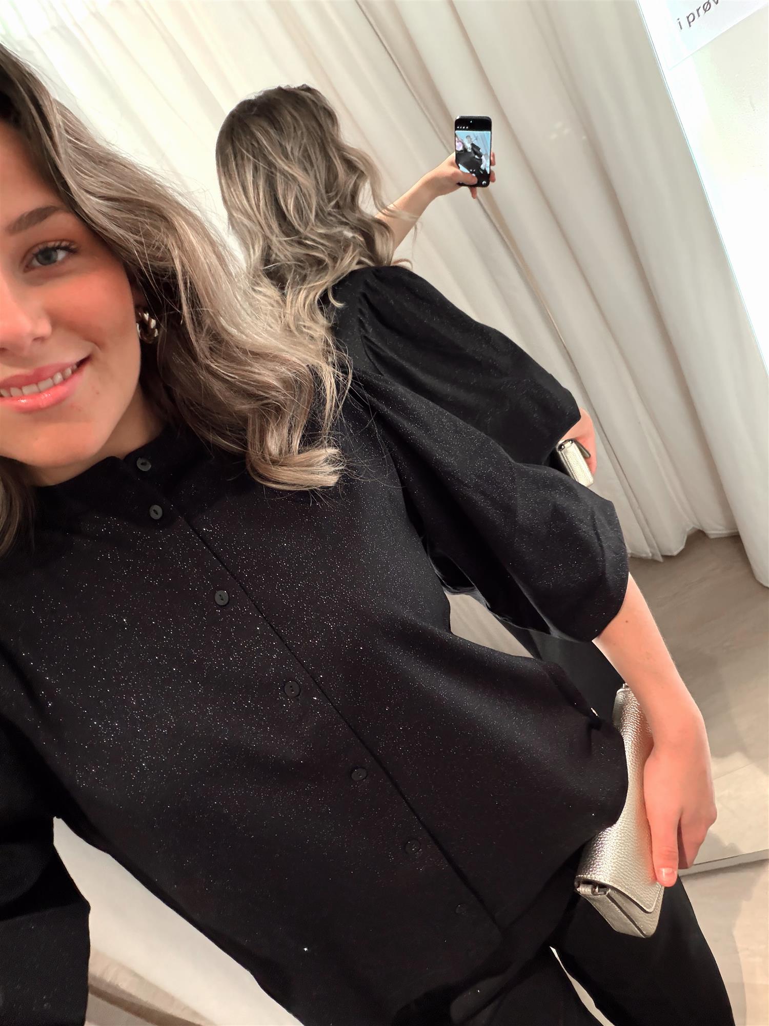 Det subtile glitteret i stoffet gir et lekkert skimmer uten å føles for pyntet – perfekt til både jeans, skinnbukser eller skjørt.