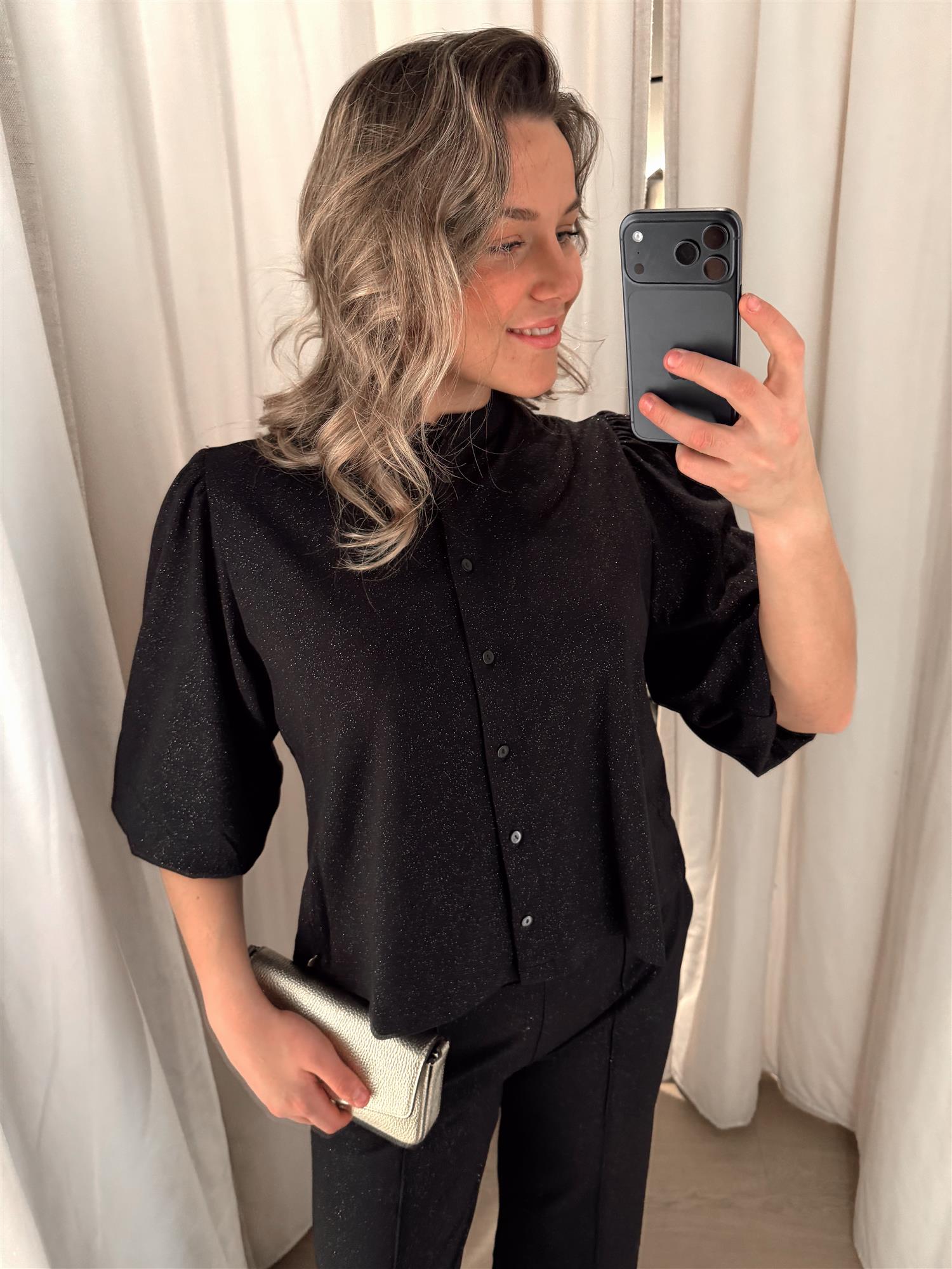 Skinnende eleganse i hverdagskomfort – Glitter Blouse fra Rah Oslo er laget i samme myke og stretchy viskosemiks som den populære Glitter Dress. Blusen har knepping i front med delikate knapper, 3/4 ballongermer og en avslappet passform som gir et feminint og behagelig uttrykk.