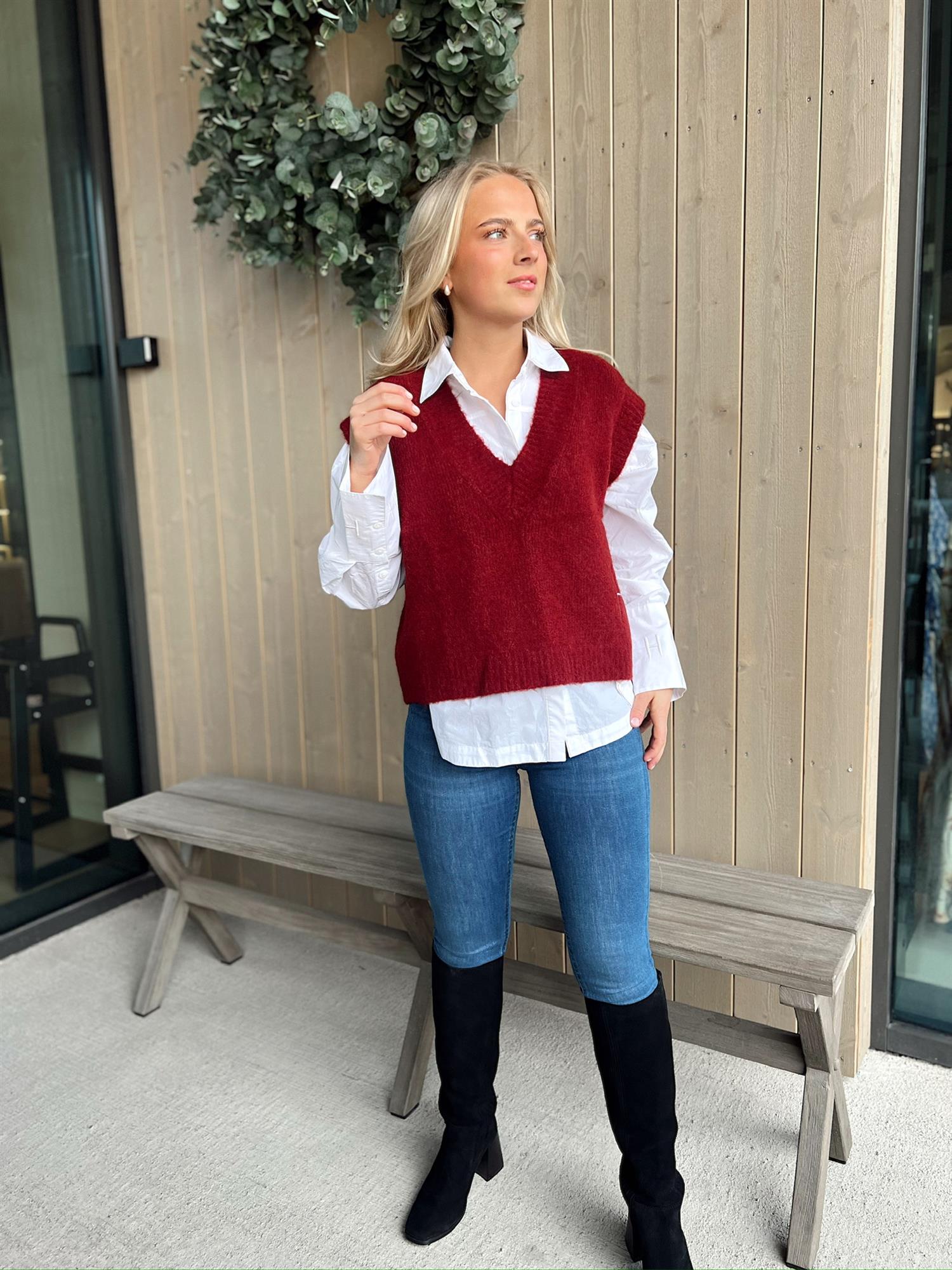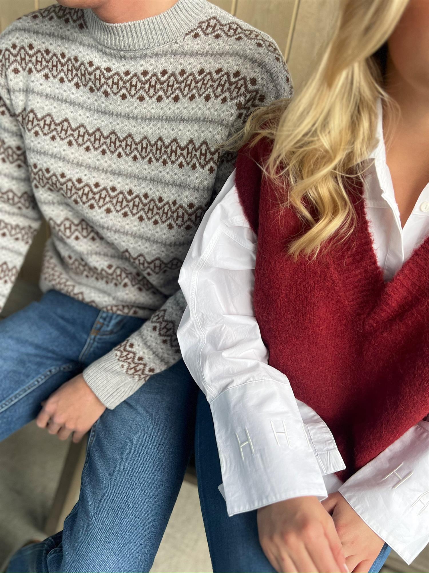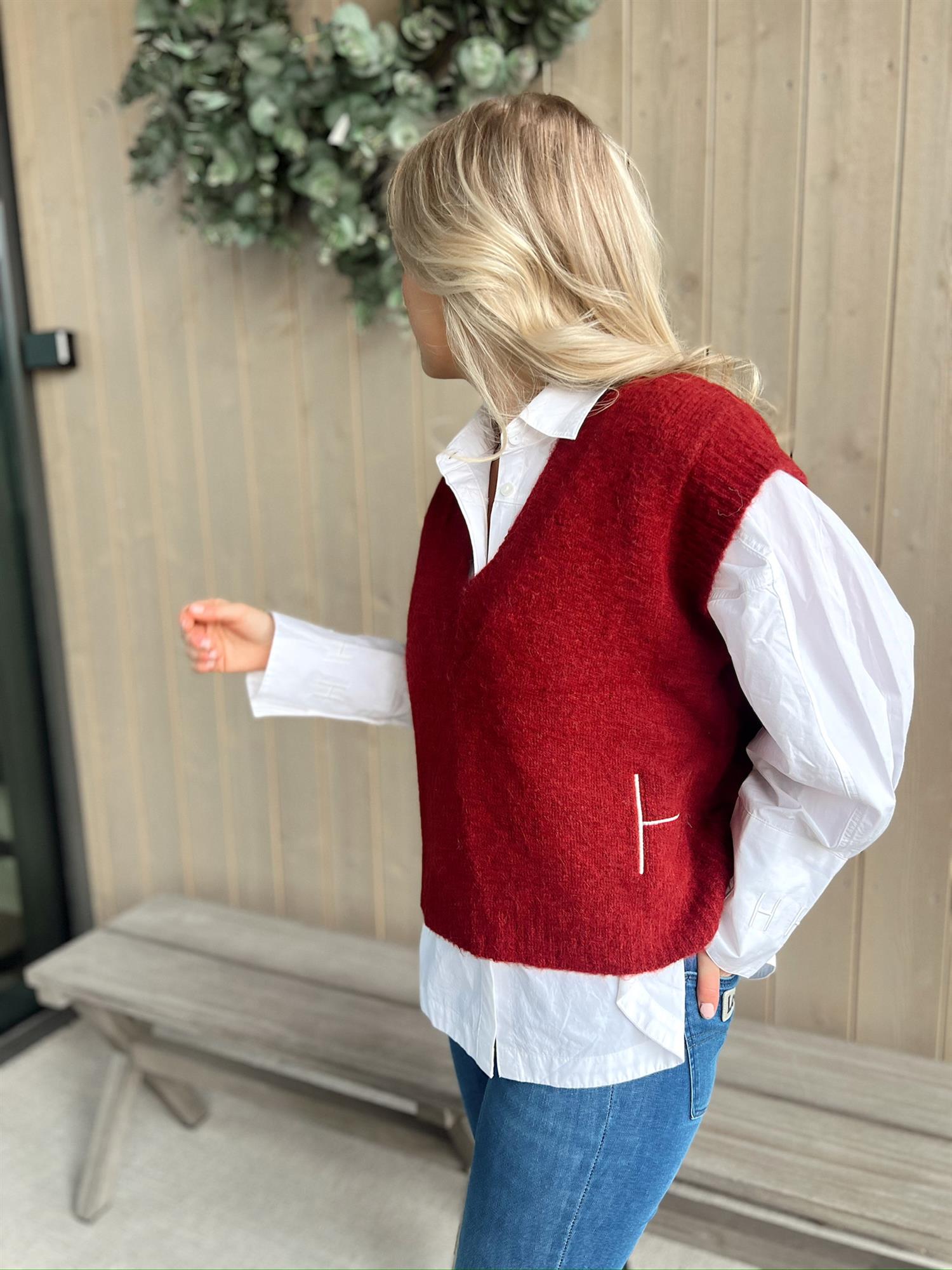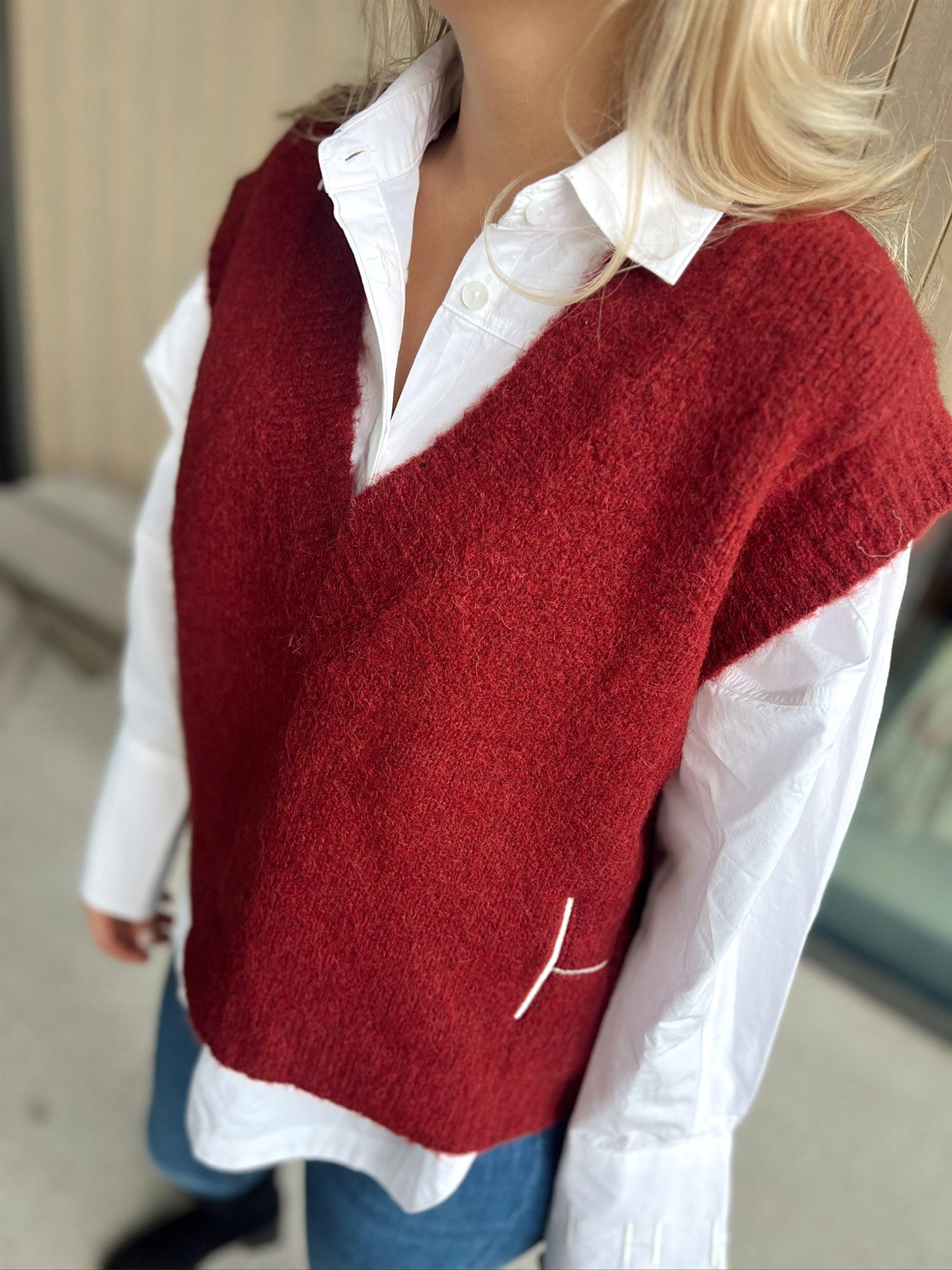 Denne avslappede vesten med V-hals er strikket i en myk alpakkablanding som gir en varm og behagelig følelse. Ribbdetaljer og rå kanter tilfører et moderne, teksturert uttrykk. Et allsidig lag-på-lag-plagg som løfter hverdagsstilen med et subtilt preg av eleganse.