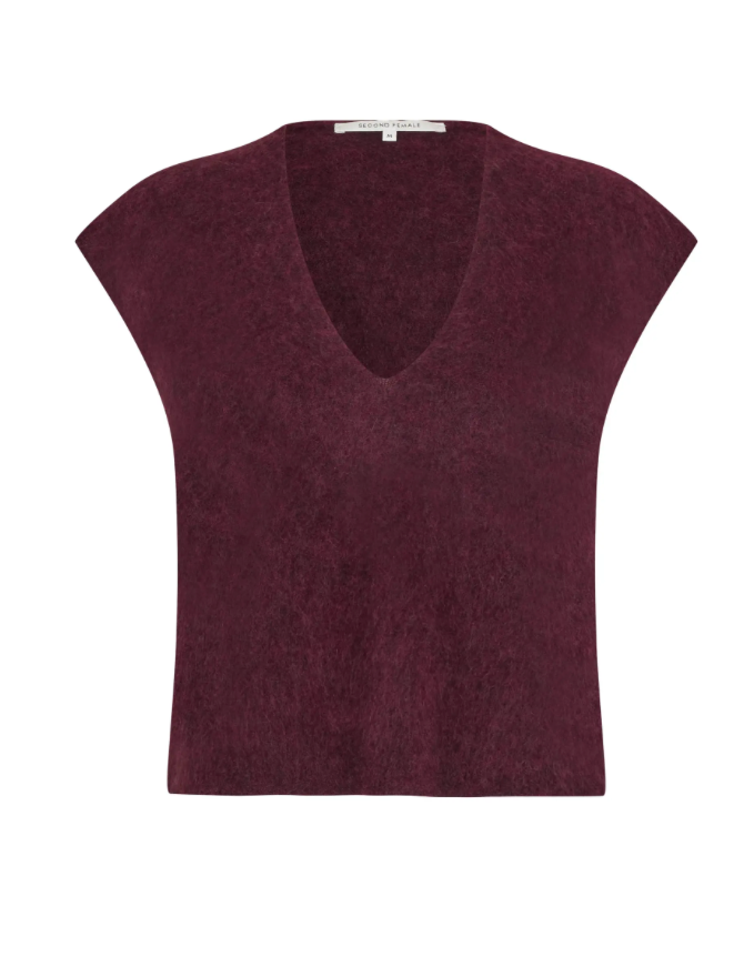 Vest fra Second Female med dyp V-utringning. Strikket i en myk og stretchy mohair- og ullblanding med fluffy tekstur som gir et eksklusivt uttrykk. Den har dype ermehull, ribbestrikket kant nederst og små splitter i sidene for en avslappet silhuett. Perfekt over skjorter, tynne gensere eller kjoler for et lag-på-lag-antrekk med stil.