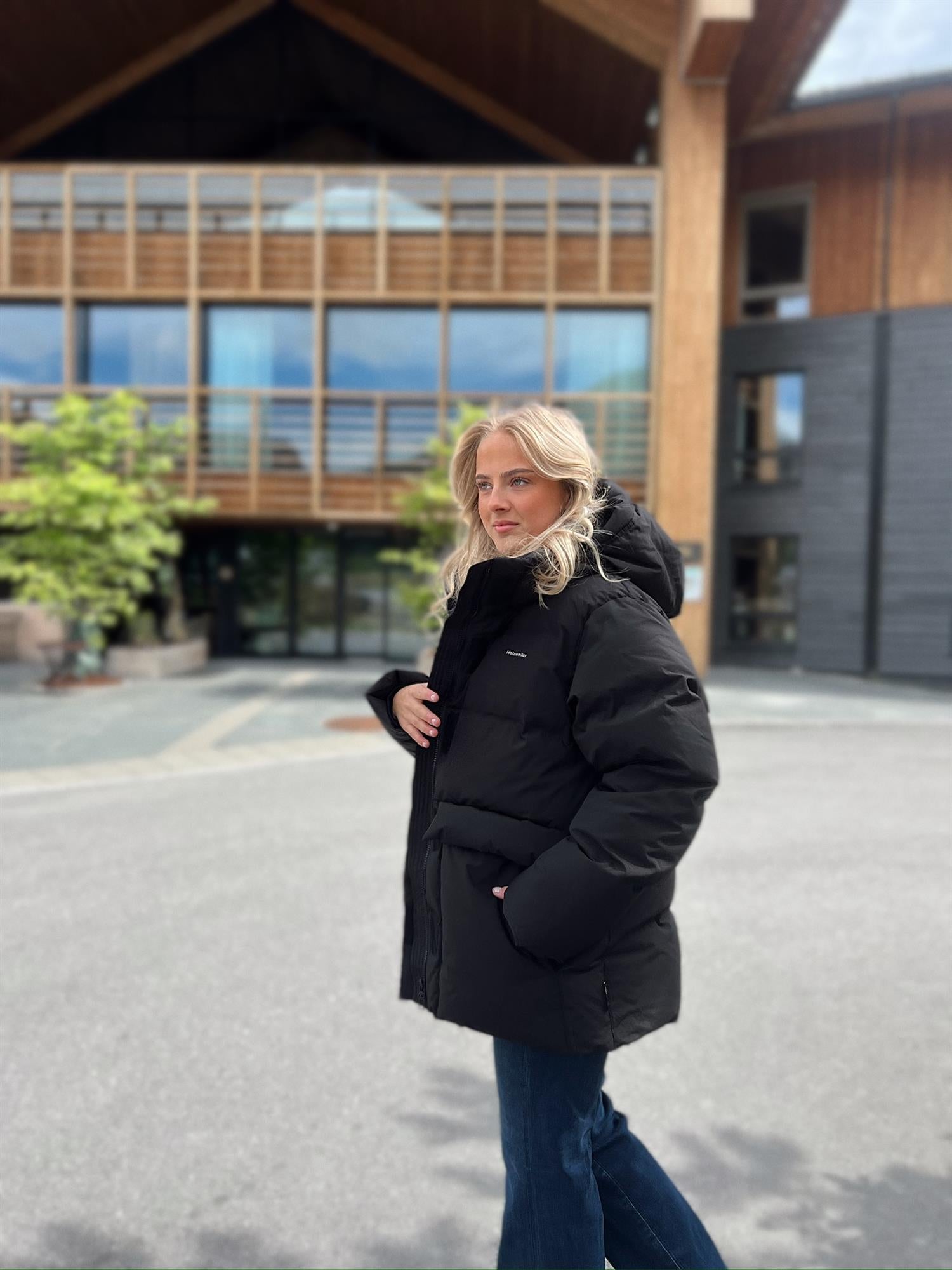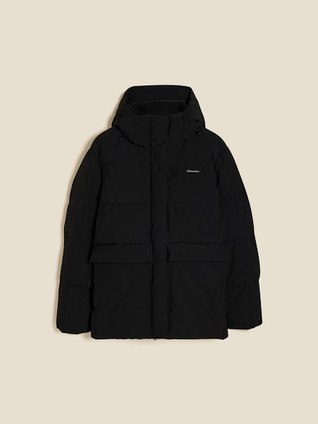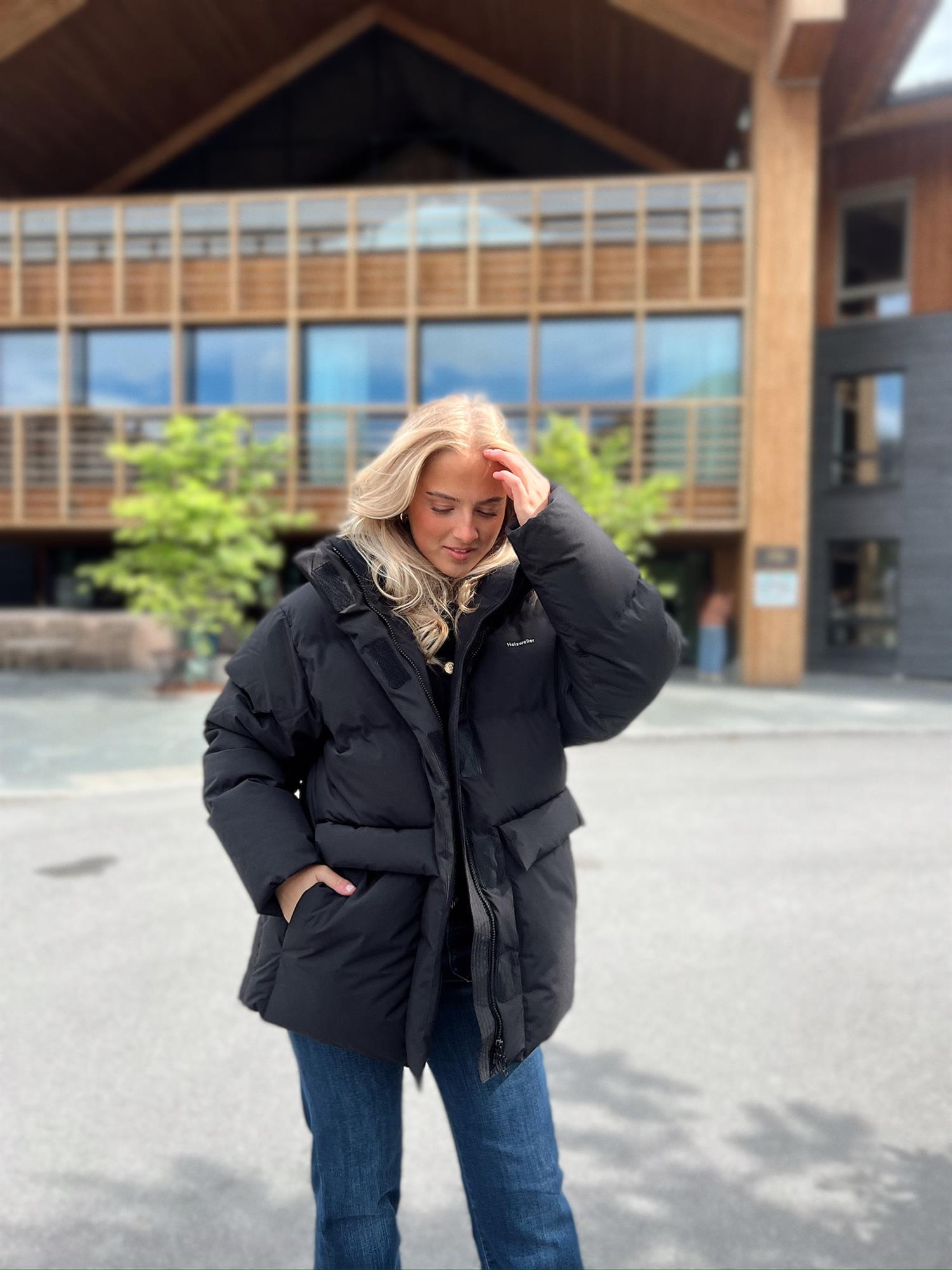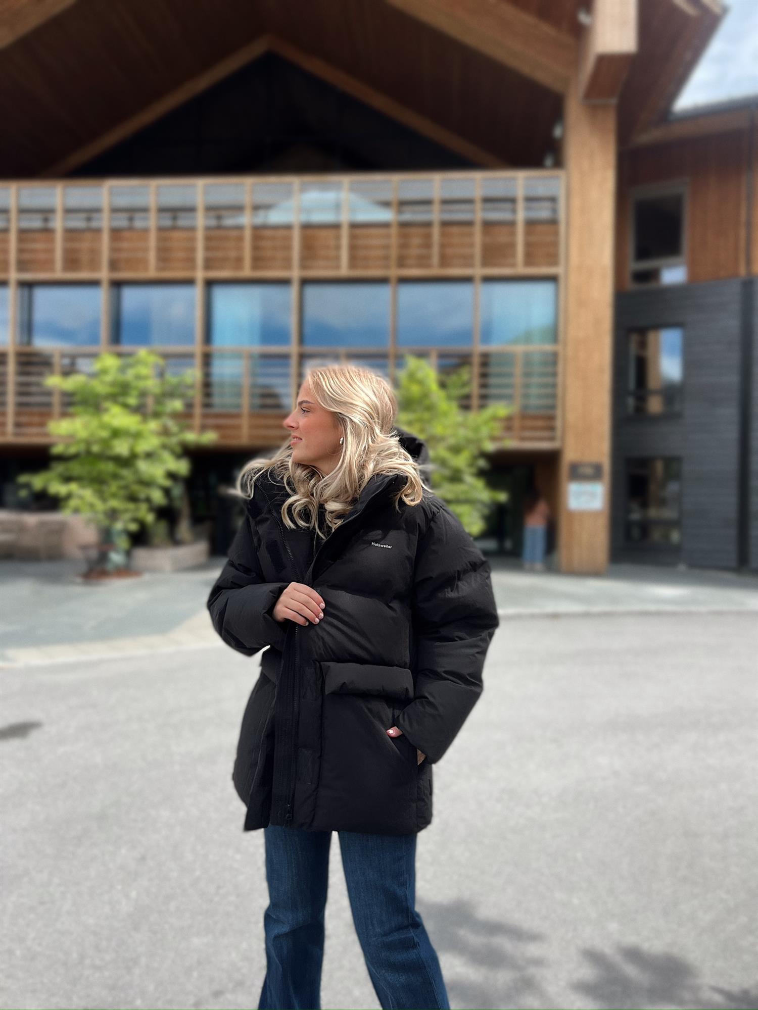 Designet har en trendy, oversized passform med middels lengde, en matt og eksklusiv overflate og stilrene detaljer som gjør den enkel å style både til hverdags og tur. Den romslige hetten beskytter mot vind og snø, og kan enkelt tas av når du ønsker et renere uttrykk. Den høye kragen gir ekstra varme, og de to sett lommene i front – samt en innvendig lomme – gir praktisk oppbevaring for små nødvendigheter.
