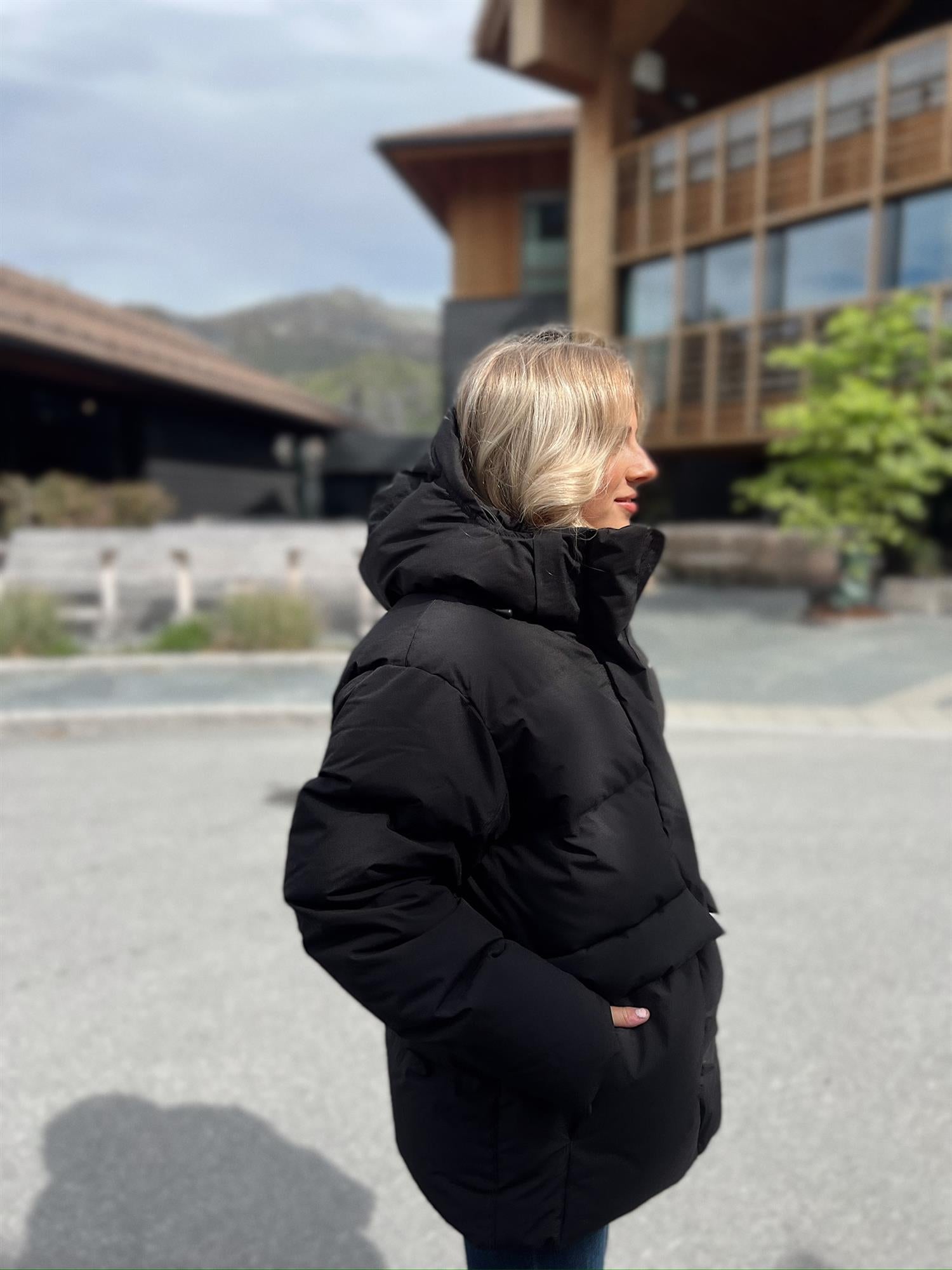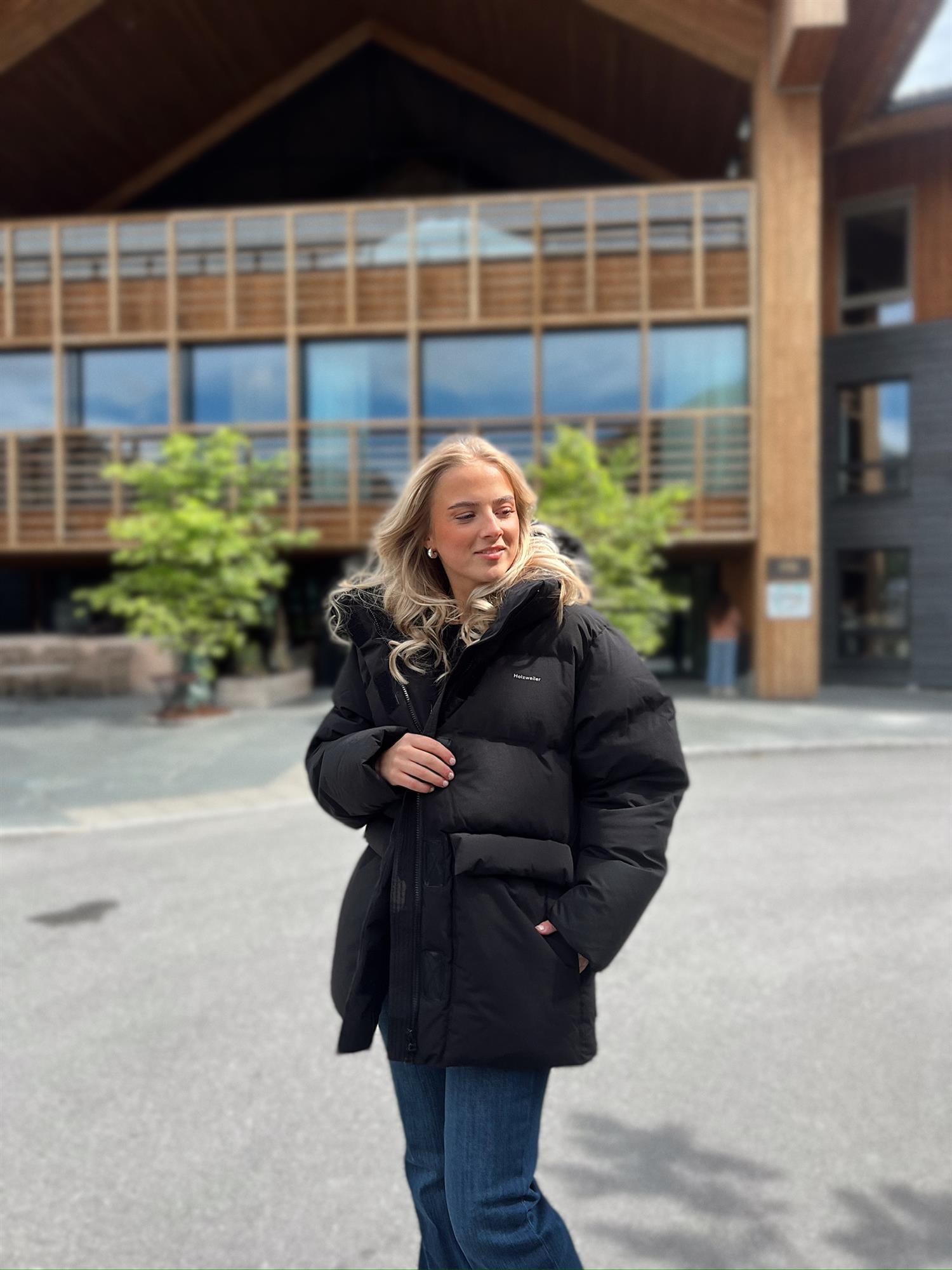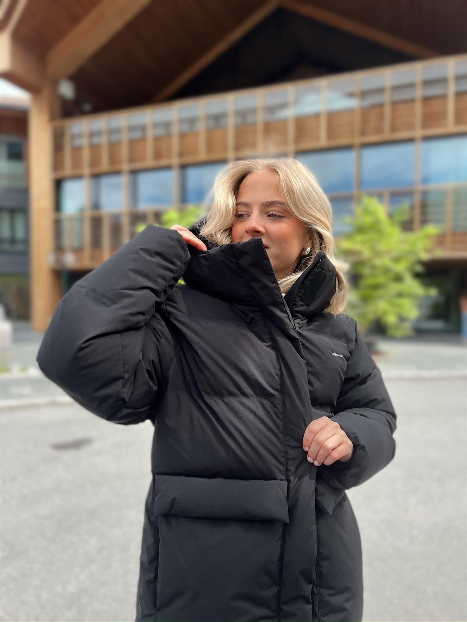 Designet har en trendy, oversized passform med middels lengde, en matt og eksklusiv overflate og stilrene detaljer som gjør den enkel å style både til hverdags og tur. Den romslige hetten beskytter mot vind og snø, og kan enkelt tas av når du ønsker et renere uttrykk. Den høye kragen gir ekstra varme, og de to sett lommene i front – samt en innvendig lomme – gir praktisk oppbevaring for små nødvendigheter.