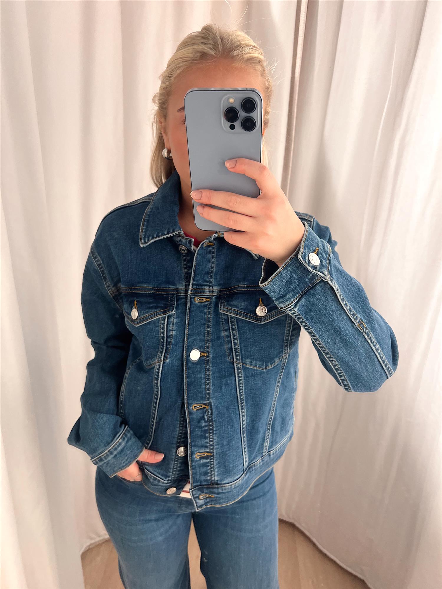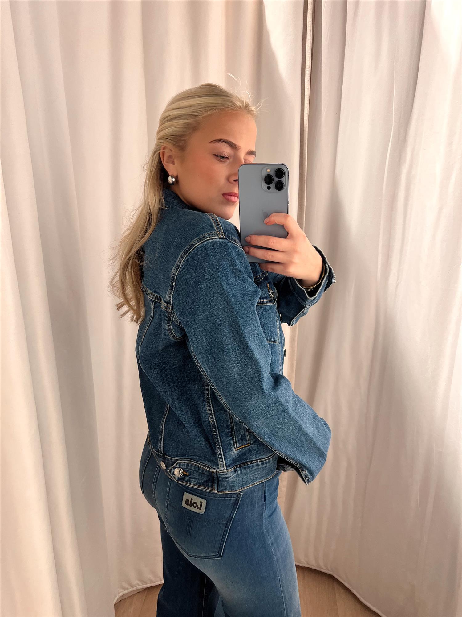 NicholiaPW JA er en stilren jakke i medium mørk blå denim, perfekt for å tilføre et moderne preg til antrekket ditt. Den er laget av en kombinasjon av vanlig og resirkulert bomull, noe som gjør den både komfortabel og miljøvennlig.
