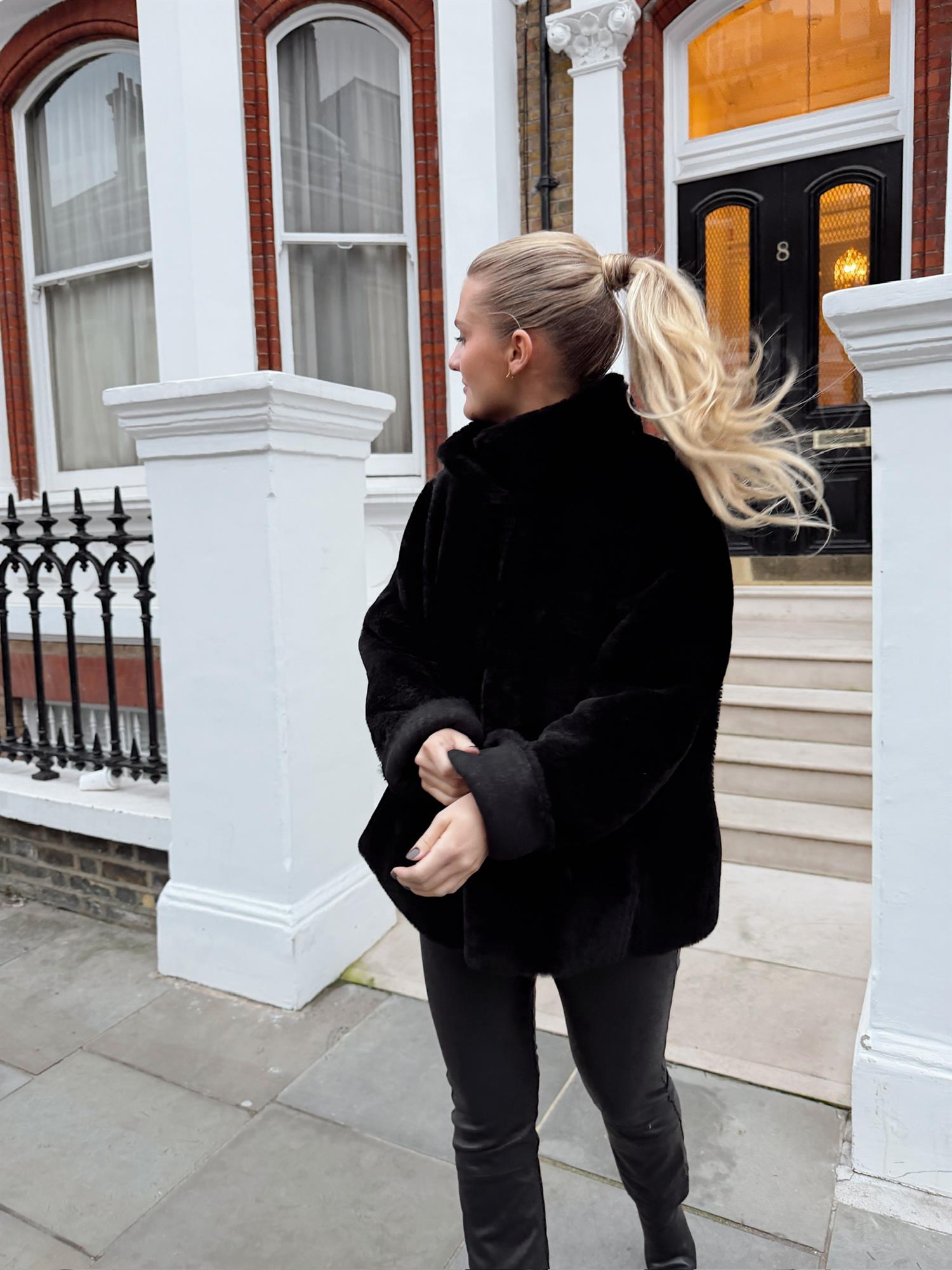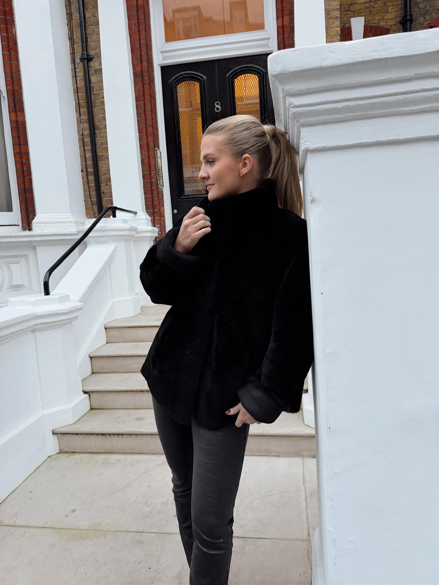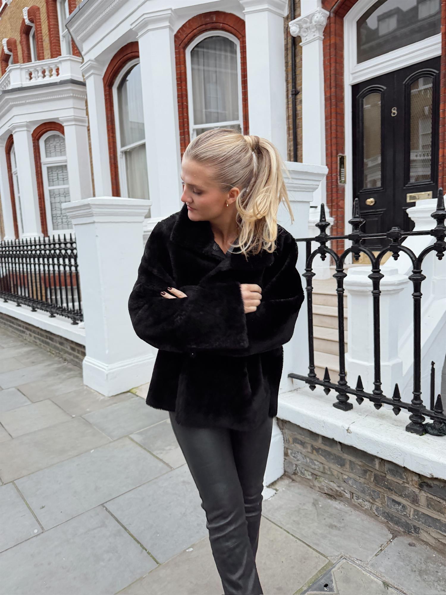 Klassisk og tidløs kort kåpe som kan brukes begge veier. Kåpen lukkes med knepping i front. Sidelommer i front og høy splitt i begge sider.