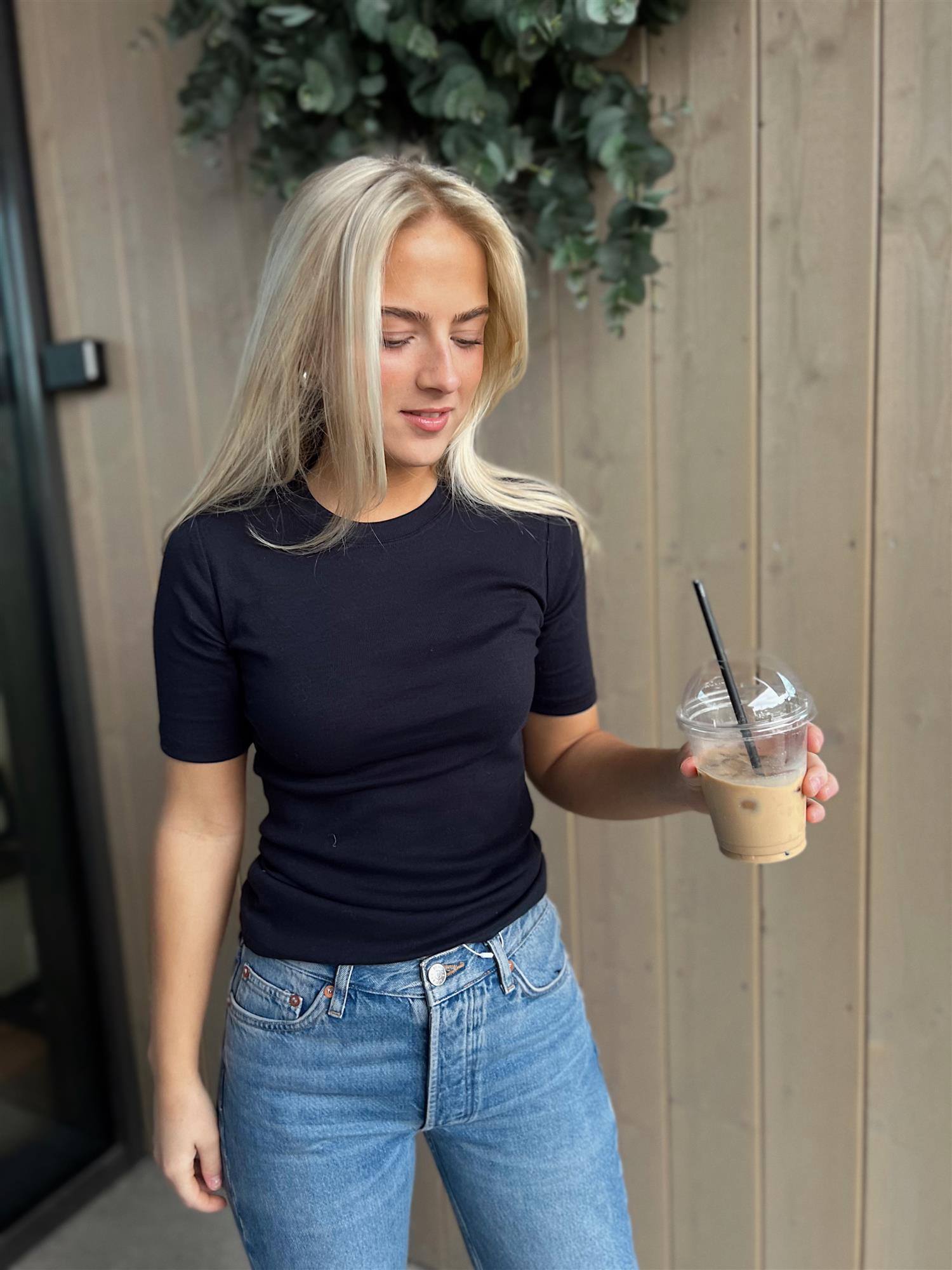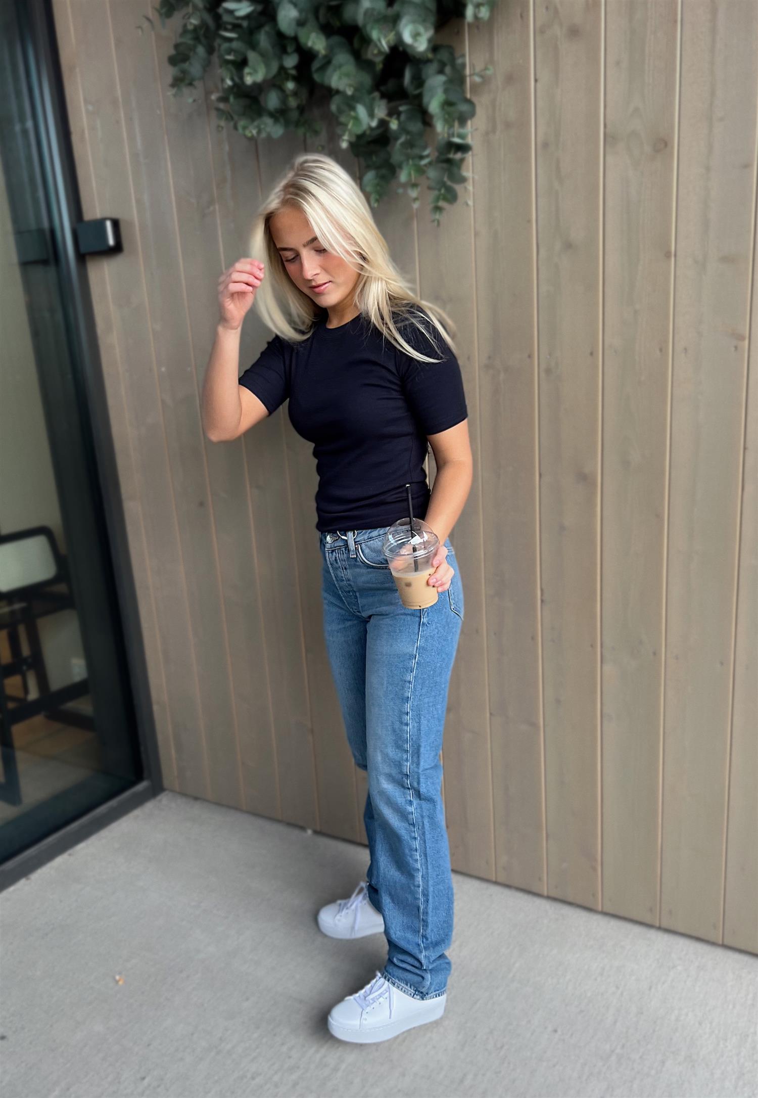 Slank T-skjorte med korte ermer og rund hals. Dobbeltsøm-detaljer og laget av fint ribbestrikket jerseystoff i økologisk bomull med ekstra stretch fra elastan.