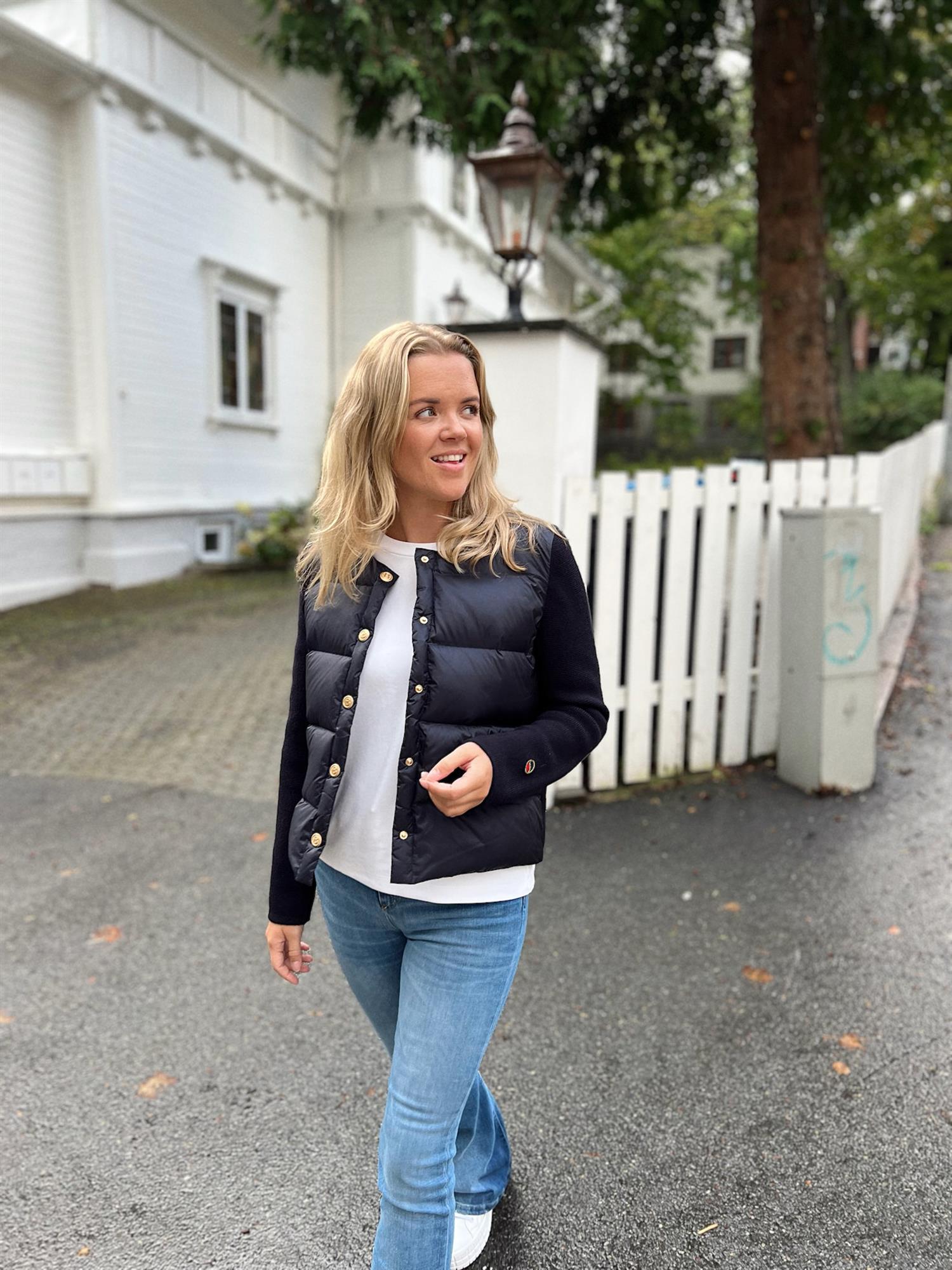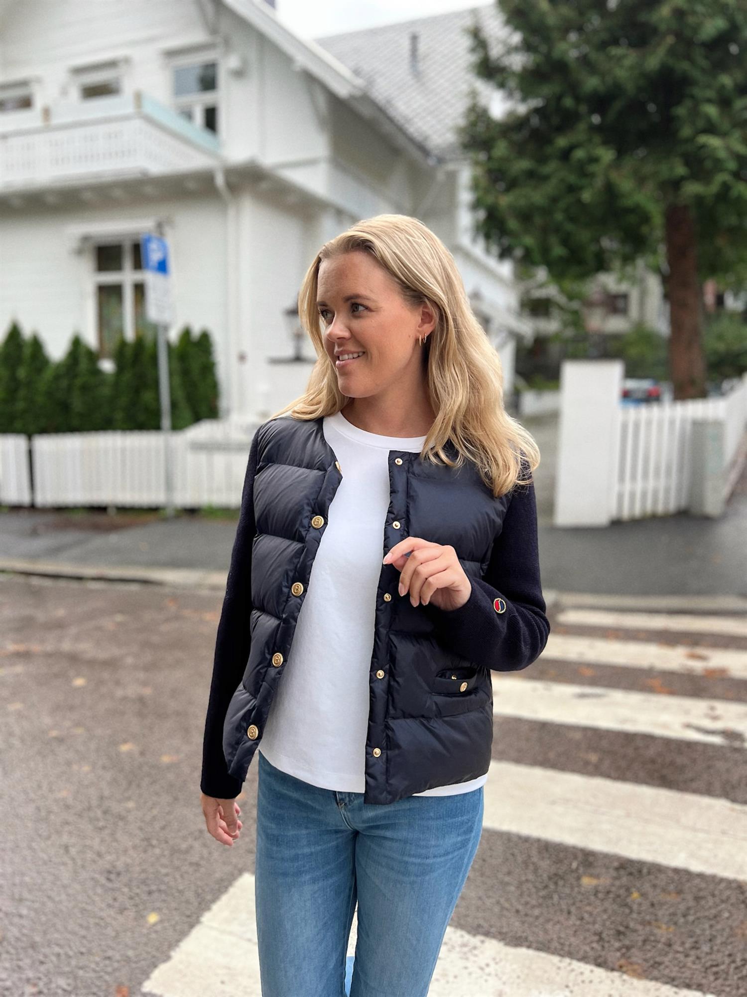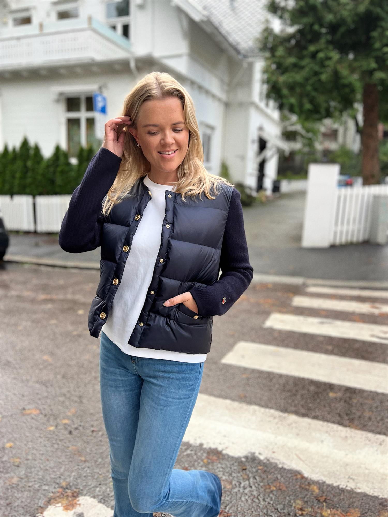 Iva Down Jacket fra Busnel kombinerer stilig design med varme og komfort, perfekt for kaldere dager og kvelder. Jakken har en kontrasterende front fylt med dun, mens ermene er strikket i ekstra fin merinoull. De åtte gyldne B-knappene og de to lommene foran gir jakken et luksuriøst uttrykk som er typisk for Busnel.