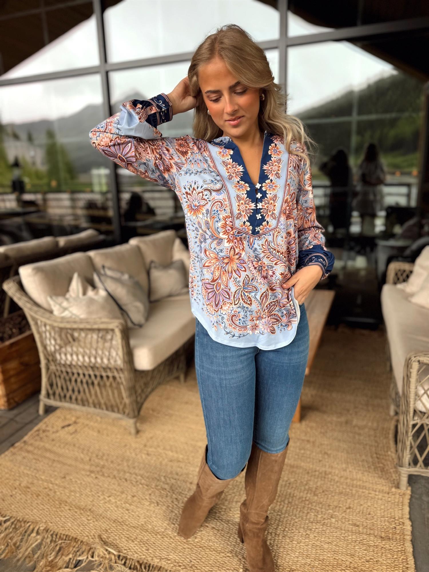 Stilren og komfortabel topp fra Berkley, perfekt for en avslappet dag. Denne toppen har en nydelig yoke med blomsterknapper og lange ermer med trykknapper ved mansjettene, noe som gir et elegant preg. Den lave hofte lengden med rundet nederkant gjør den lett å style med ulike antrekk.