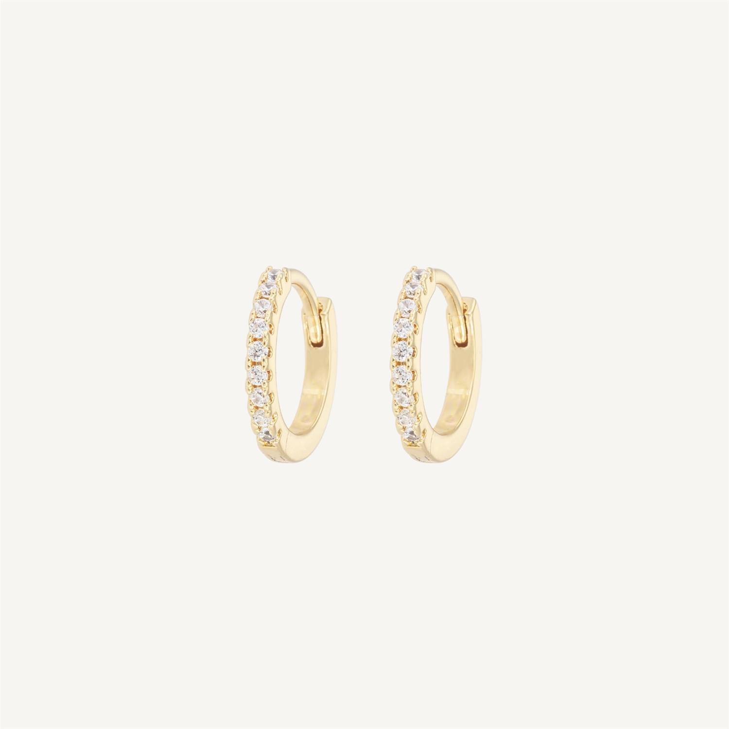 Disse øreringene har en diameter på 13 mm og er laget av kraftig 18K gullbelagt messing, dekorert med glitrende cubic zirconia-stener. Et lekkert og tidløst valg som passer både til hverdags og fest.