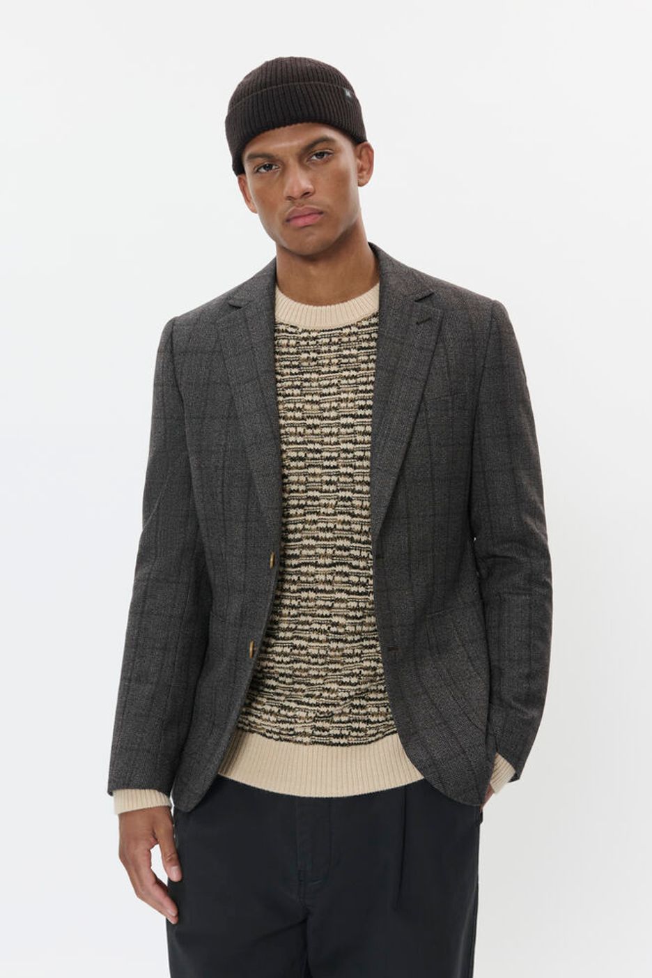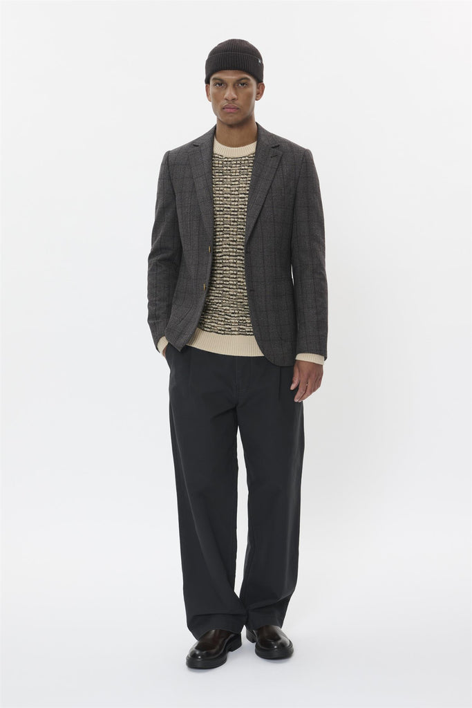 MAgeorge jakken i espresso er en stilren og bærekraftig jakke laget av en blanding av ull, resirkulert polyester og viskose. Denne jakken kombinerer komfort med et moderne design, perfekt for enhver anledning.