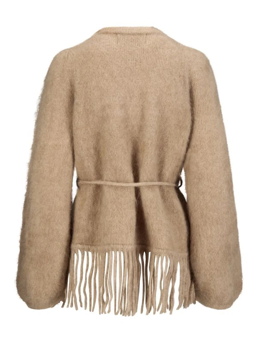 Fidele Chunky Cardigan er en stilfull omslags-cardigan med en moderne vri. Den har et justerbart belte i livet som gir en flatterende silhuett, og en dekorativ frynsekant nederst som tilfører et lekent og trendy uttrykk.