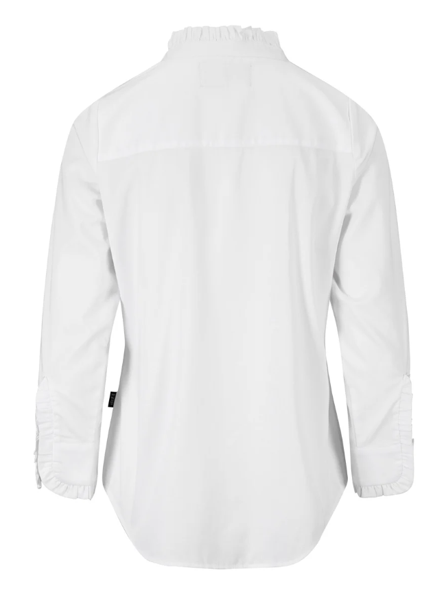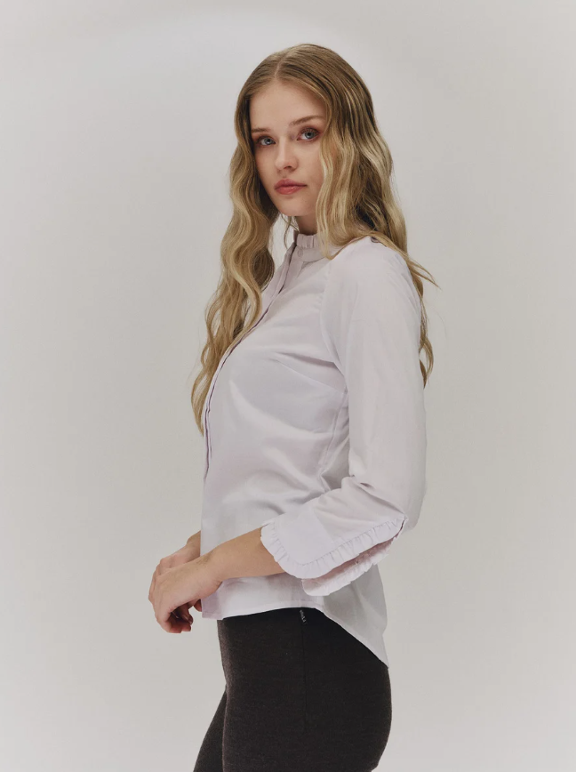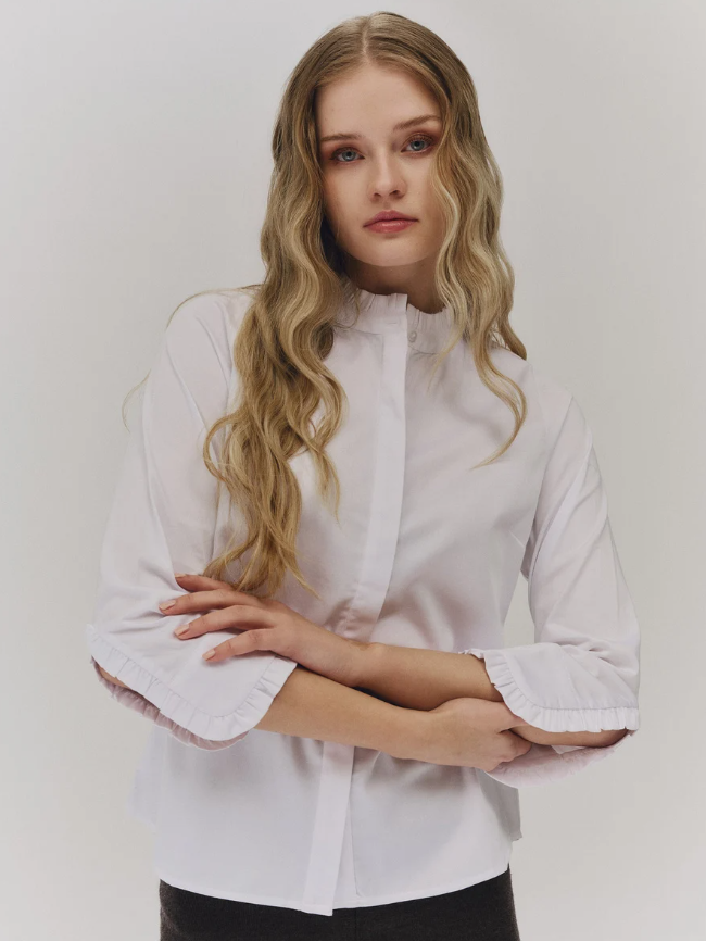 Skjortebluse i myk poplin med en flatterende slim fit-passform. Den har elegante volangdetaljer ved halsen og på ermene, samt skjulte knapper hele veien ned foran som gir et rent og sofistikert uttrykk.