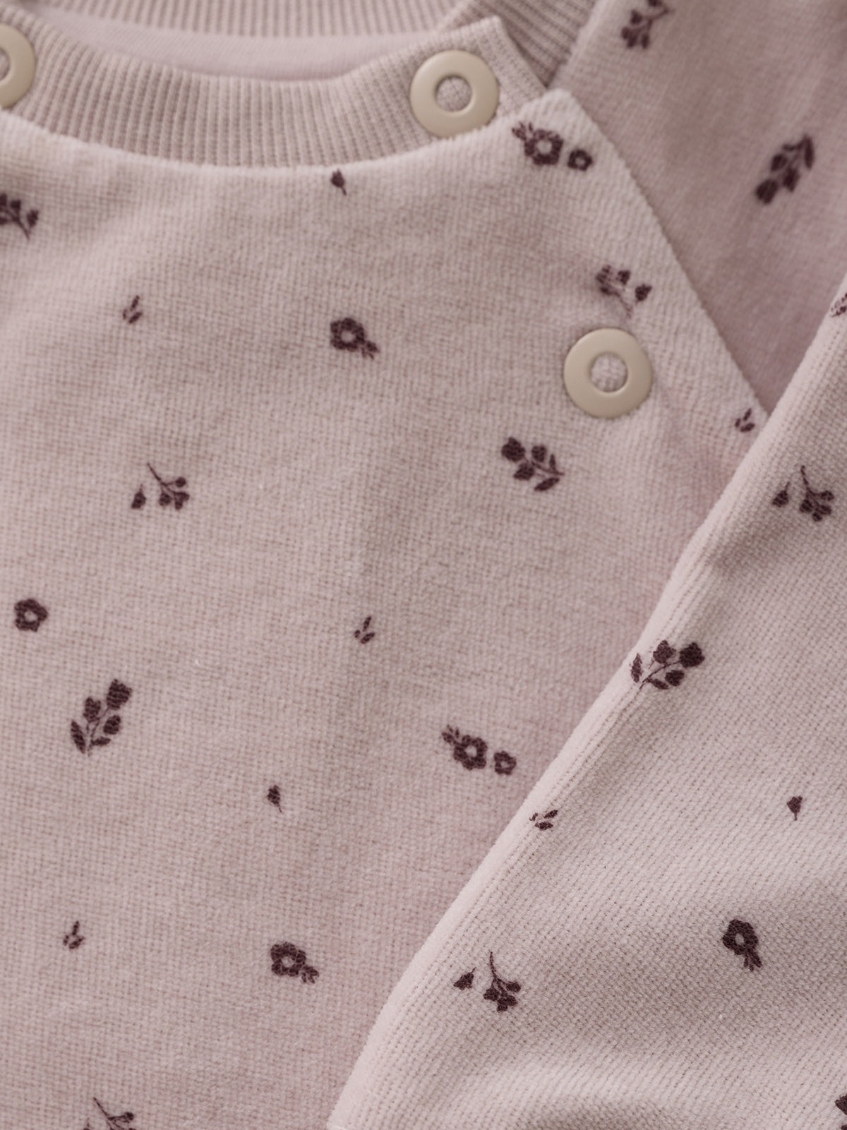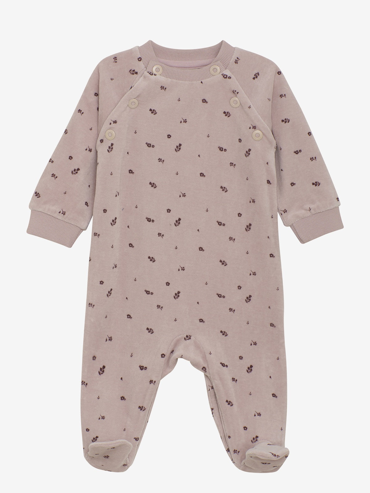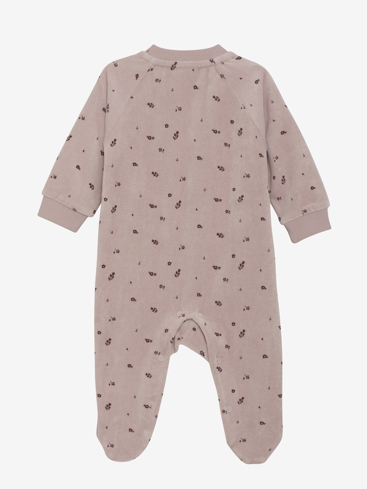 Romper i velour fra FIXONI. Denne romberen har helprint og kan åpnes bak for enkel på- og avkledning.