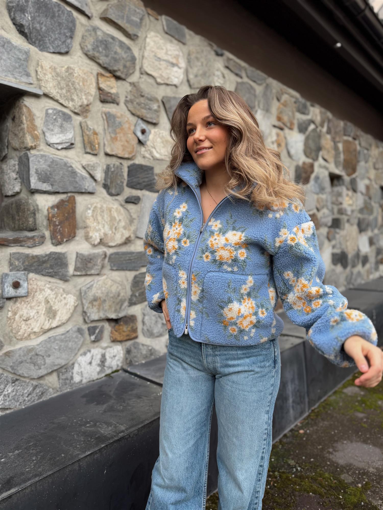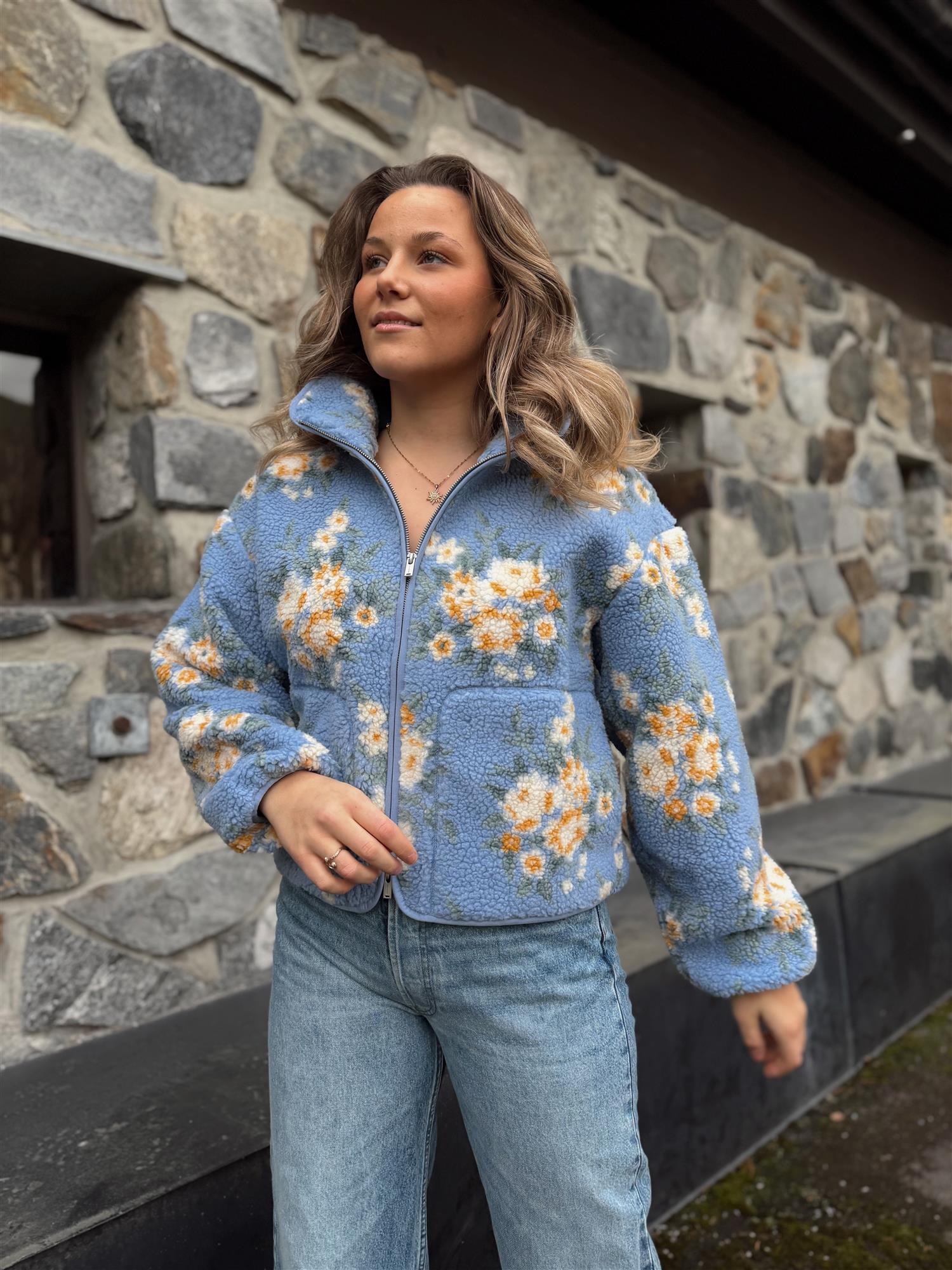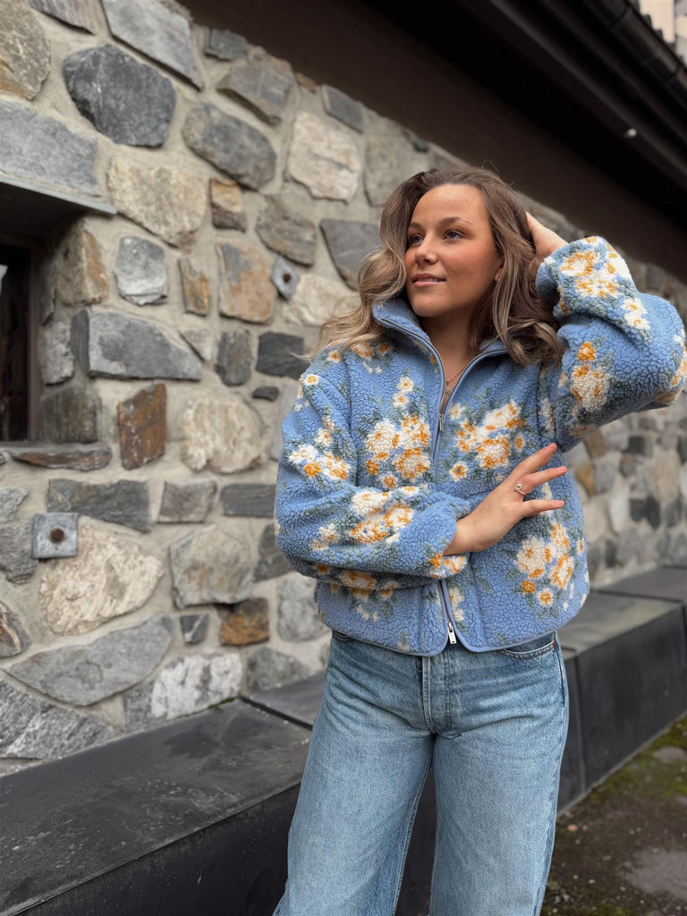 Myk og behagelig fleecejakke med blomsterprint, et gjennomgående uttrykk i kolleksjonen. Jakken har glidelås i front, høy hals, avslappet passform og praktiske sidelommer. Et varmt og stilig plagg som kombinerer funksjon og mote – perfekt til lag-på-lag gjennom kjølige dager.