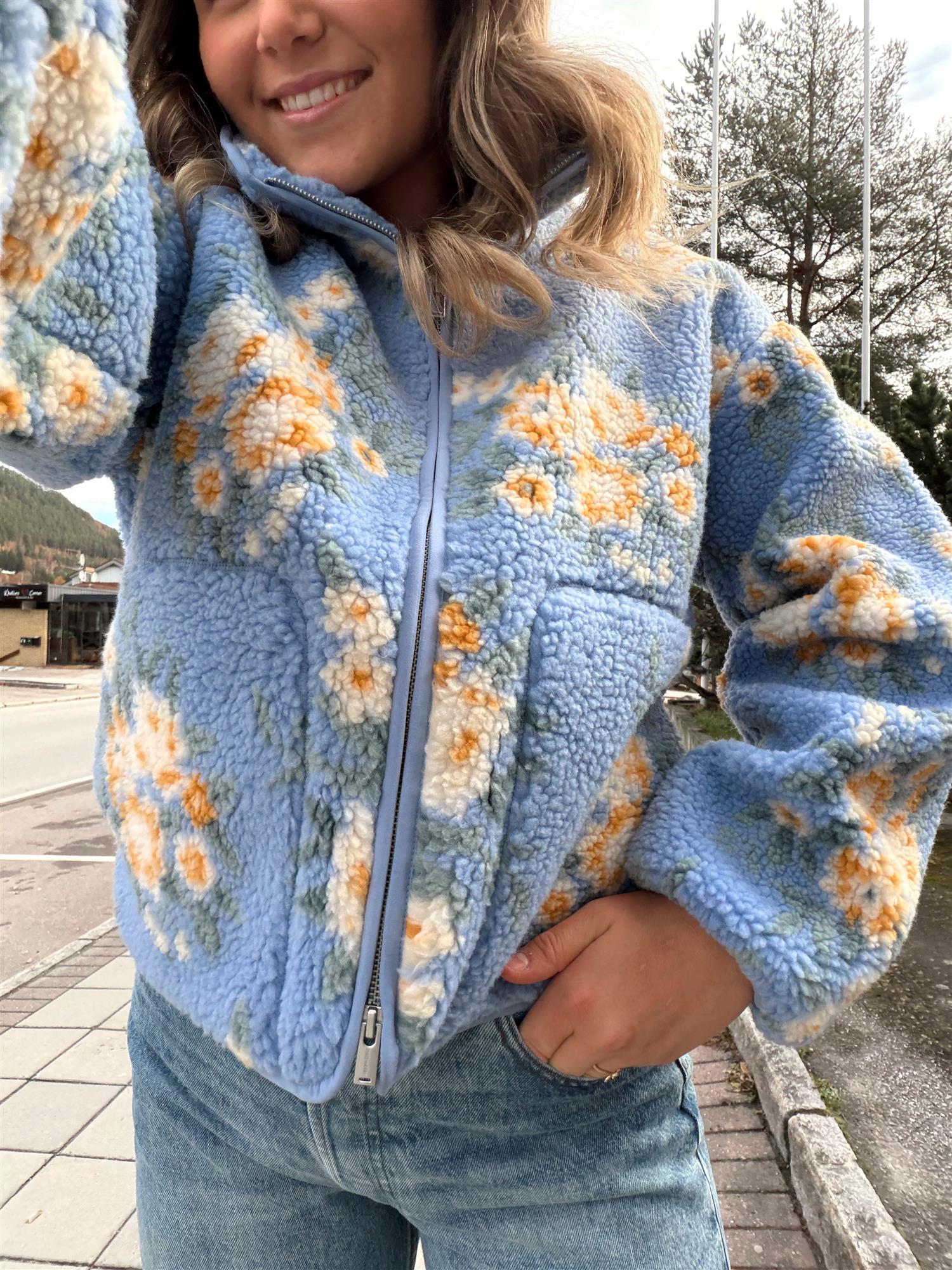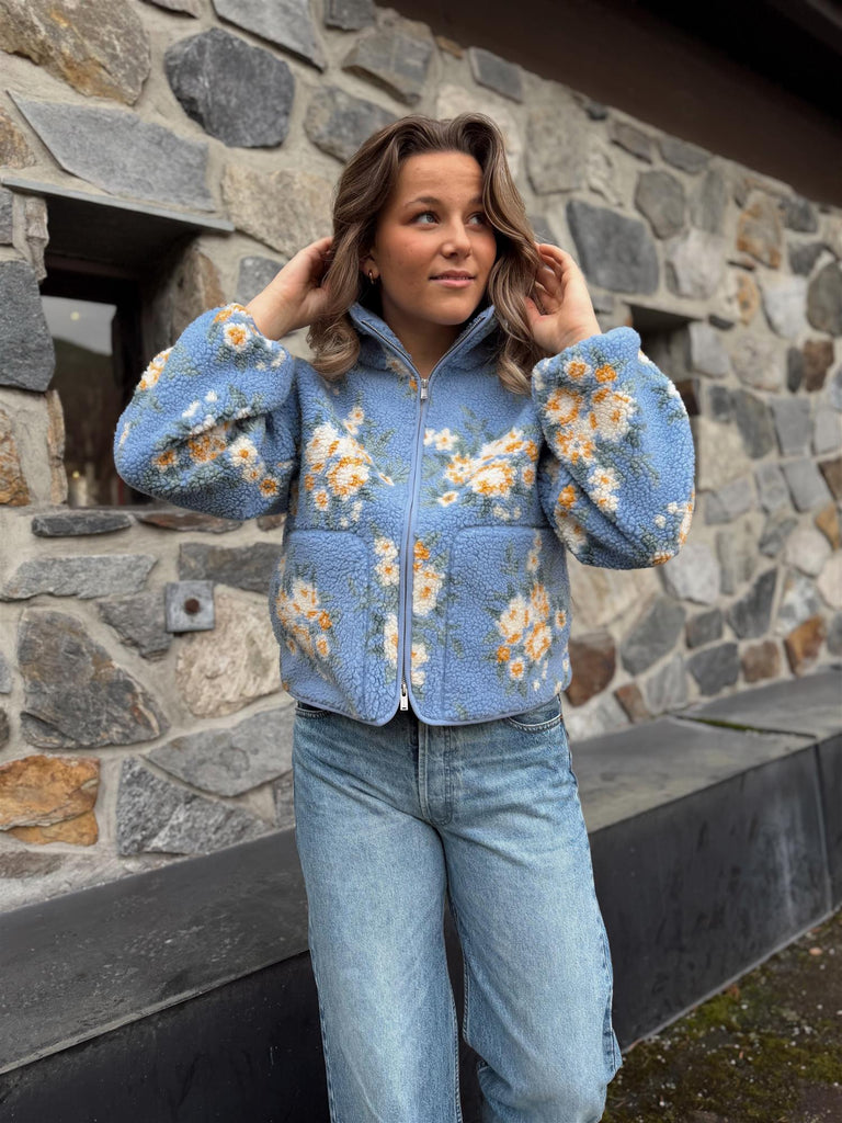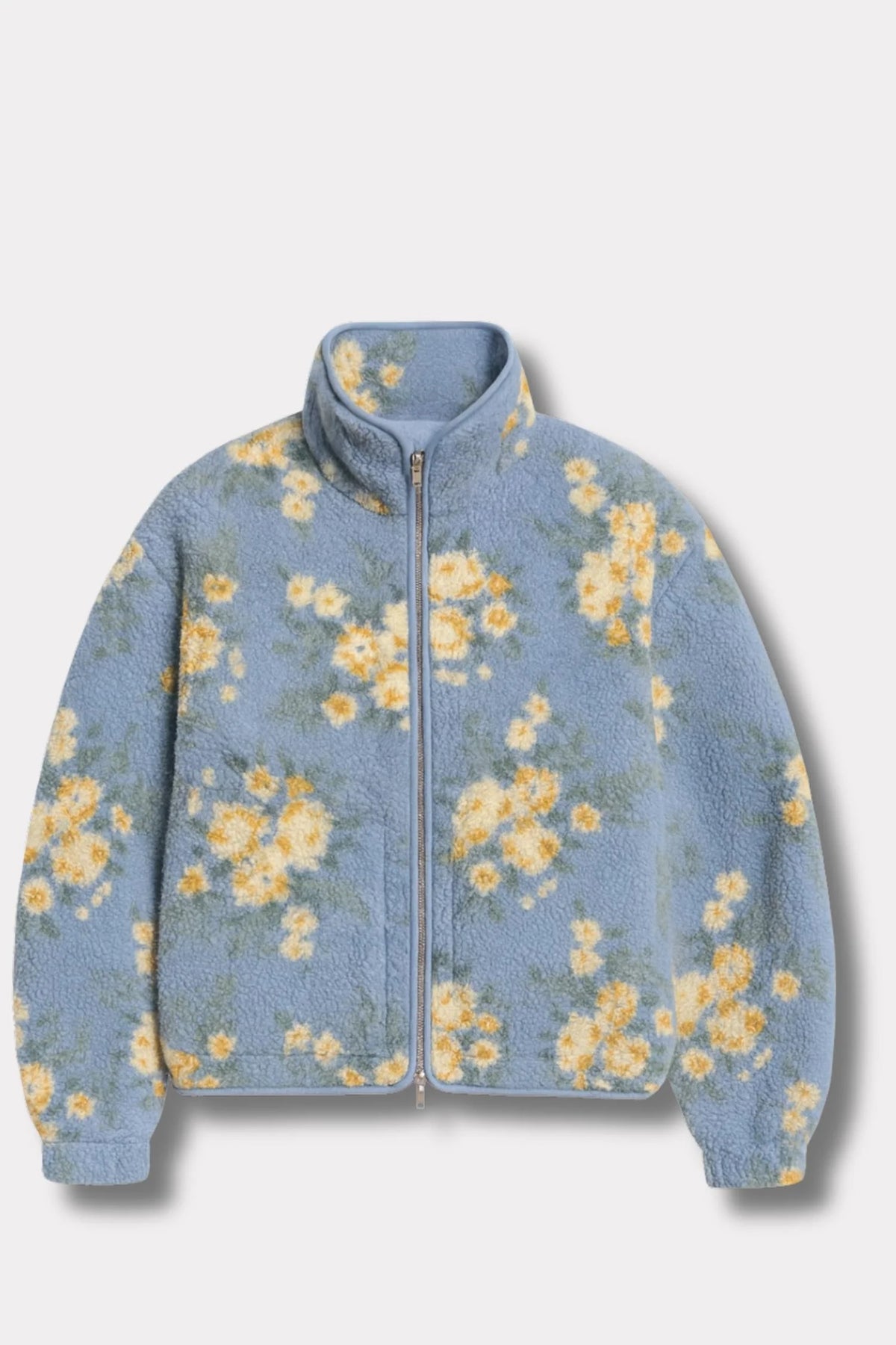 Myk og behagelig fleecejakke med blomsterprint, et gjennomgående uttrykk i kolleksjonen. Jakken har glidelås i front, høy hals, avslappet passform og praktiske sidelommer. Et varmt og stilig plagg som kombinerer funksjon og mote – perfekt til lag-på-lag gjennom kjølige dager.