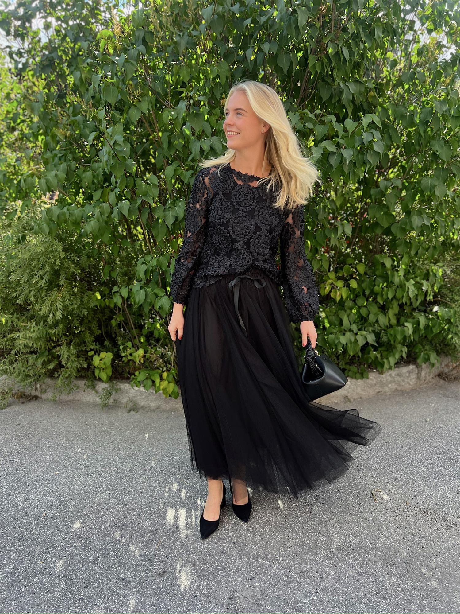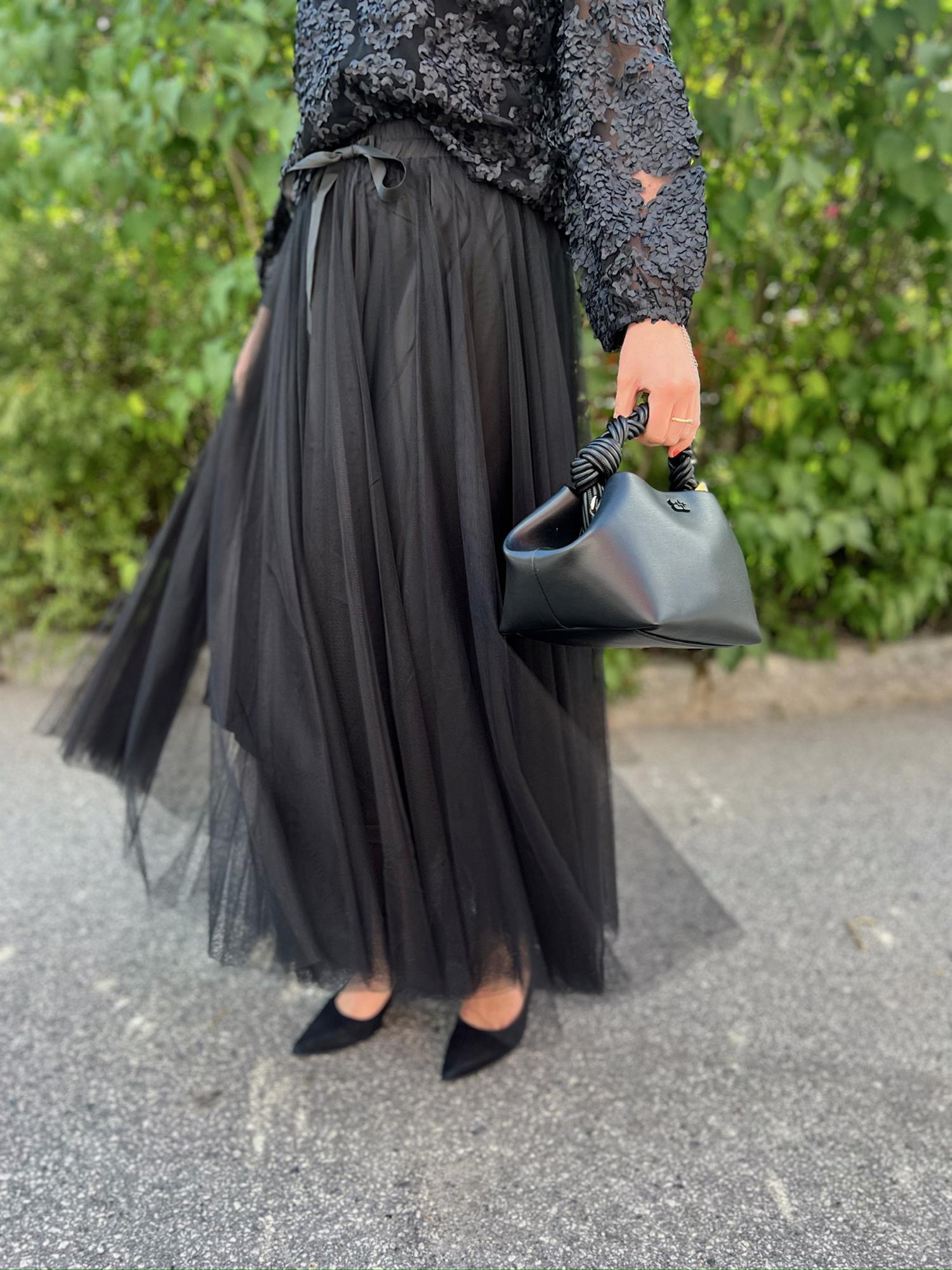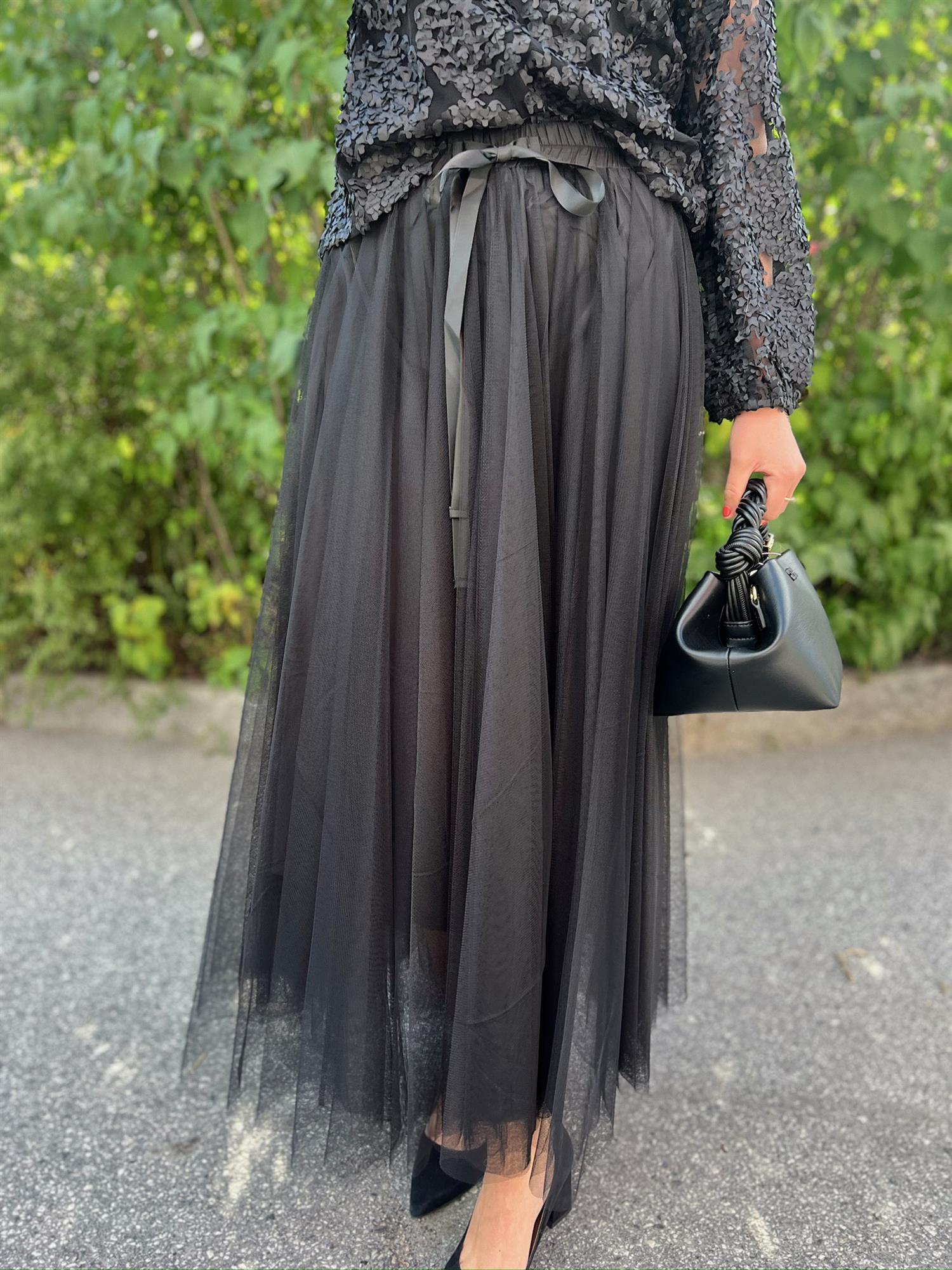 Løft antrekket ditt med dette elegante tyllskjørtet fra From Paris With Love. Skjørtet har en stilfull knyting i livet og faller lekkert, noe som gir et feminint og luftig uttrykk. Perfekt å kombinere med matchende topper, bluser eller en enkel genser for en gjennomført look – både til hverdags og fest.