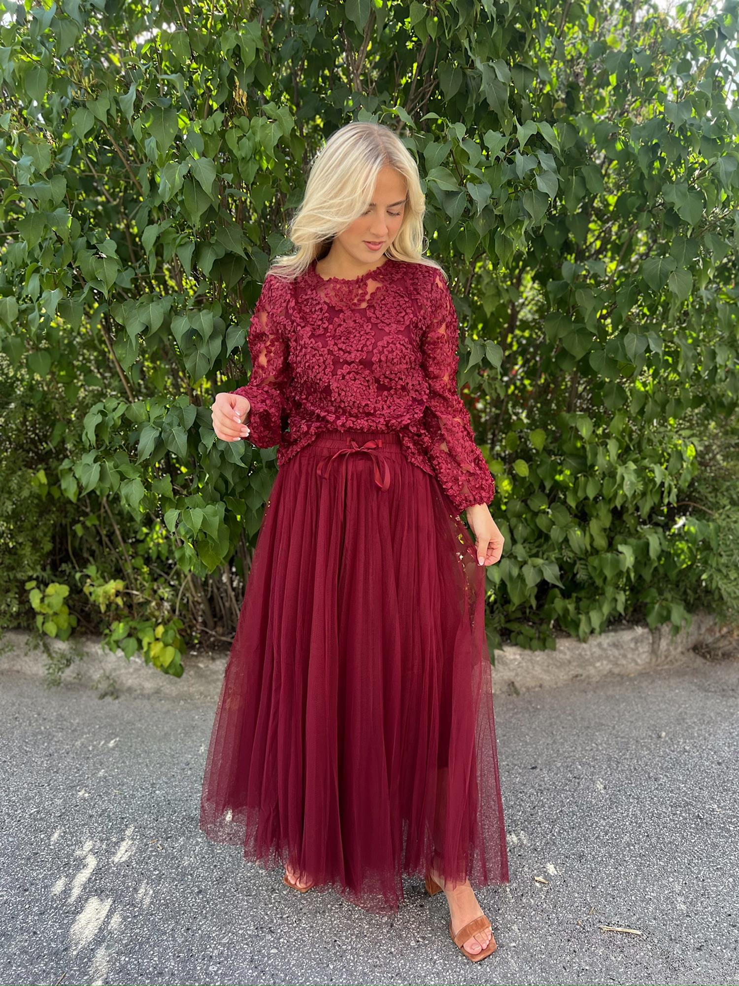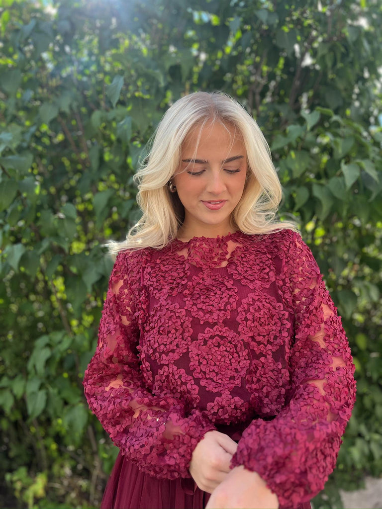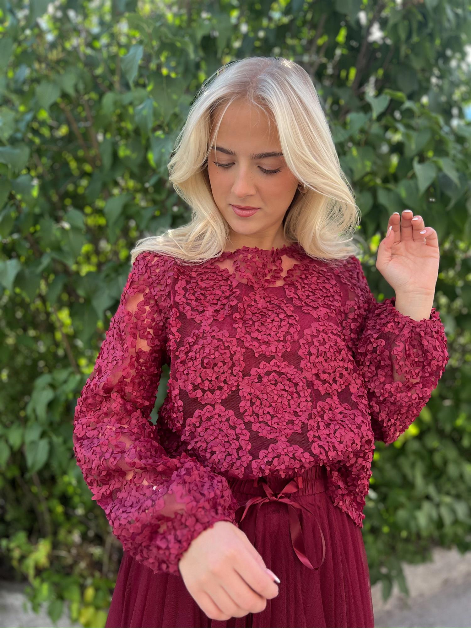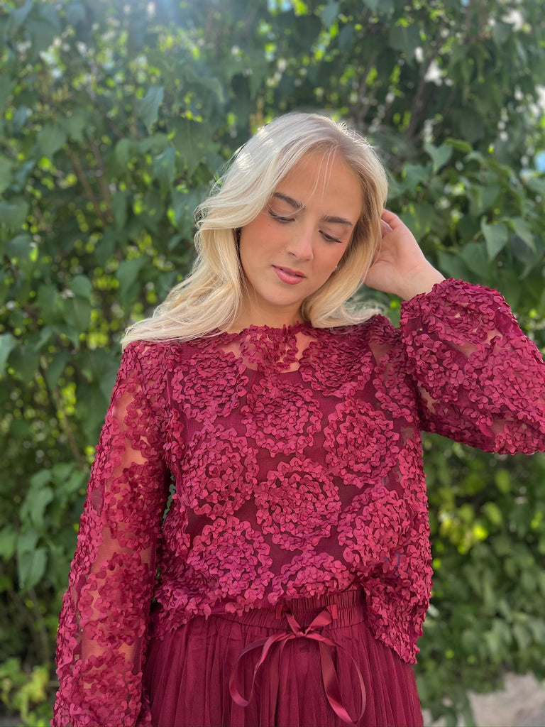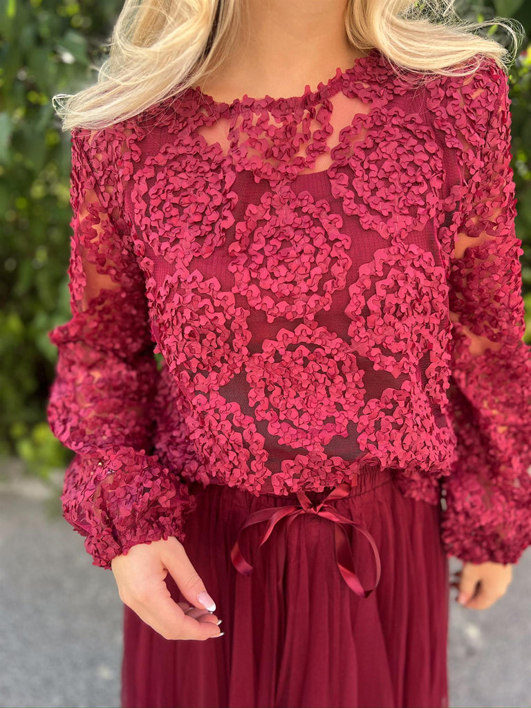 En romantisk og feminin bluse med delikate blomsterdetaljer og lett transparente ermer. Den elegante strukturen gir et eksklusivt uttrykk, samtidig som den er behagelig å ha på. Perfekt å style med skjørt for en sofistikert look, eller med bukser og jeans for en mer hverdagslig, men stilfull stil.