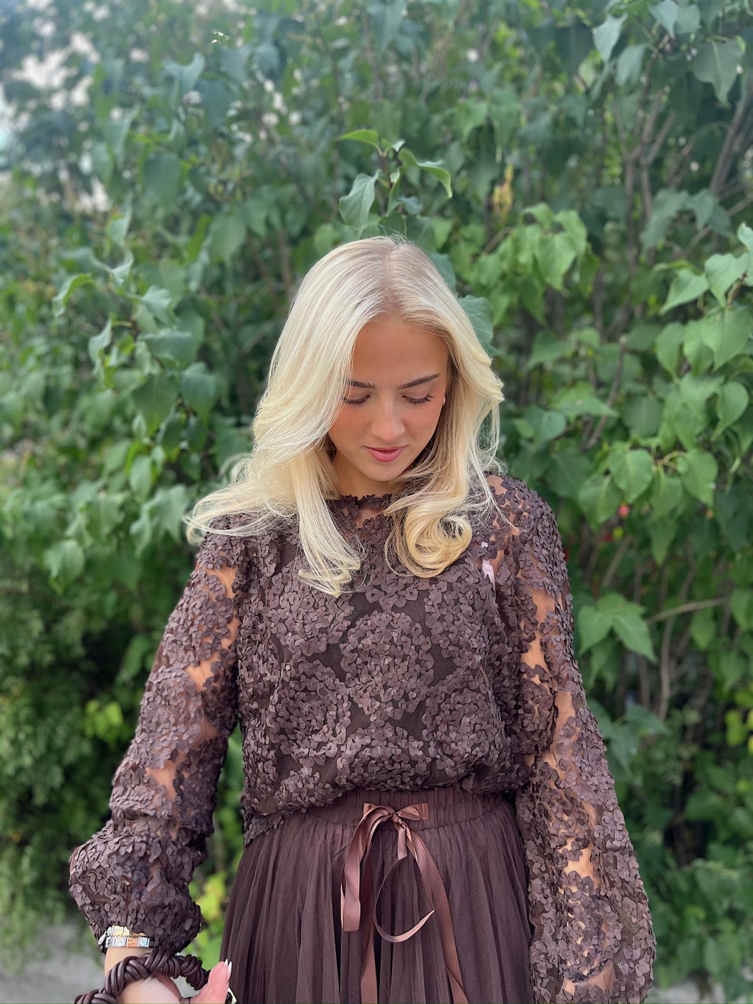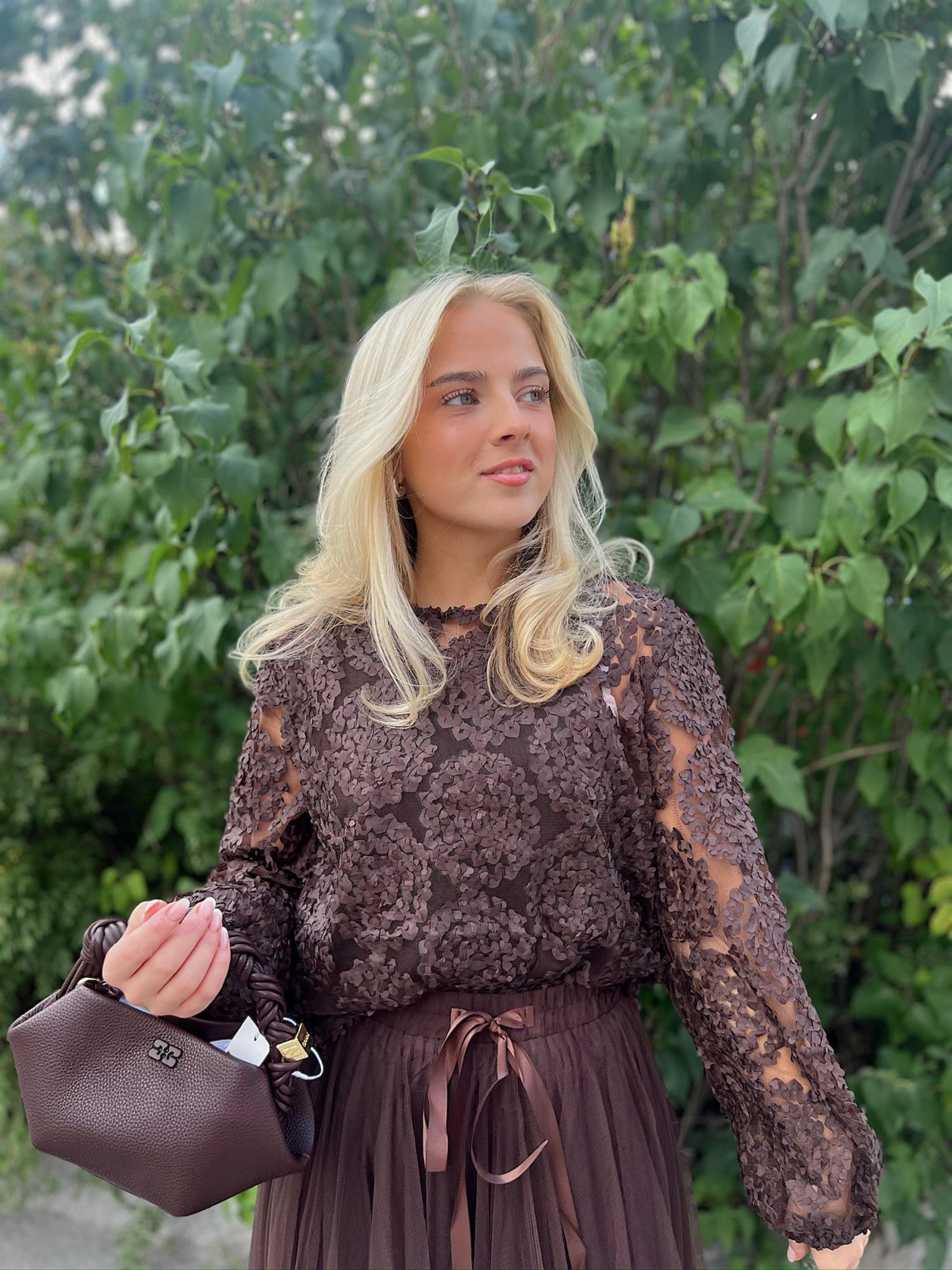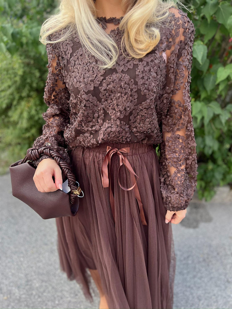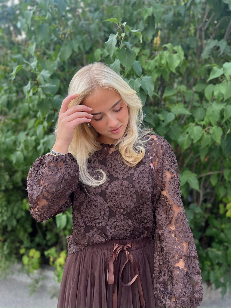 En romantisk og feminin bluse med delikate blomsterdetaljer og lett transparente ermer. Den elegante strukturen gir et eksklusivt uttrykk, samtidig som den er behagelig å ha på. Perfekt å style med skjørt for en sofistikert look, eller med bukser og jeans for en mer hverdagslig, men stilfull stil.