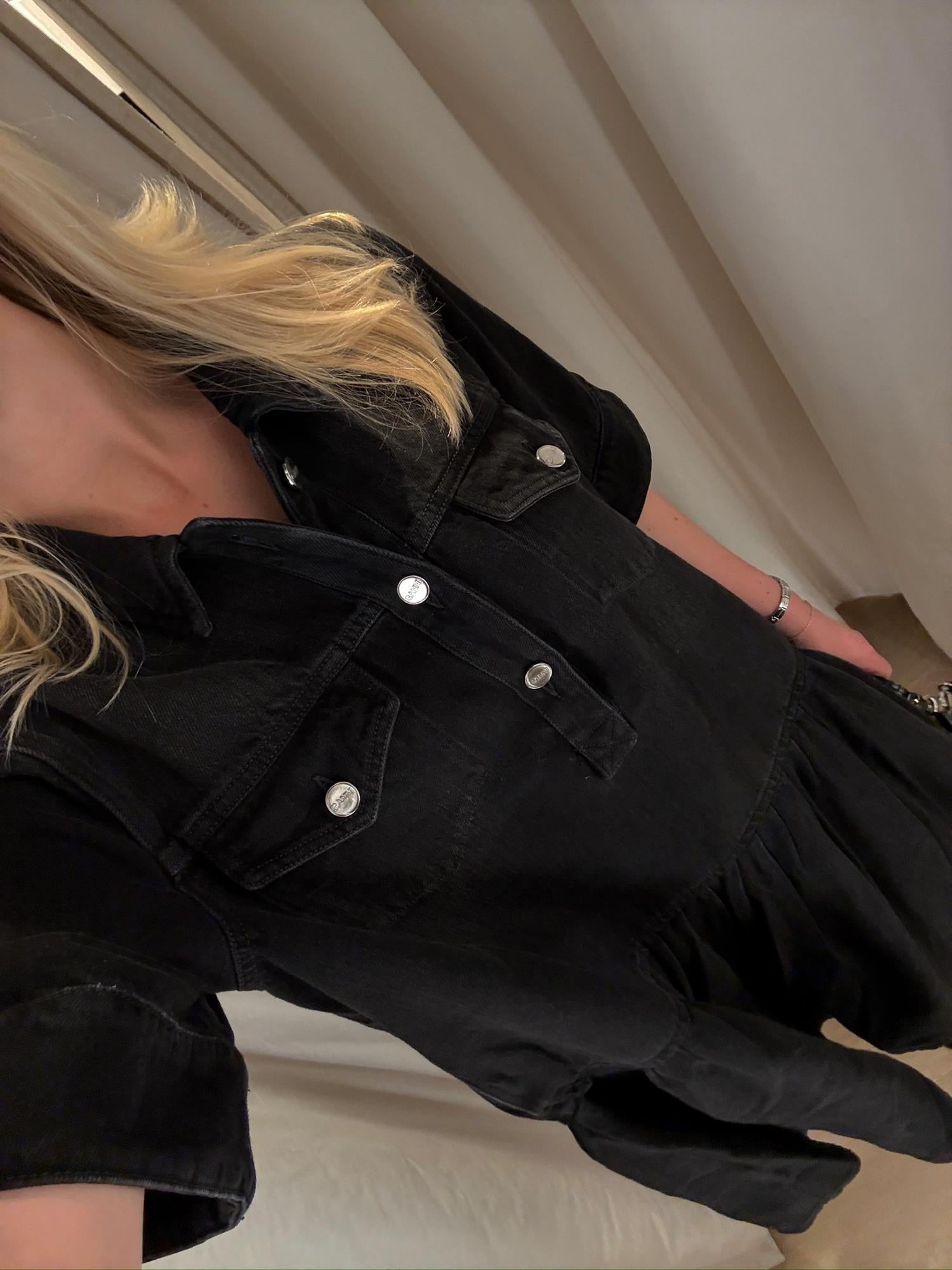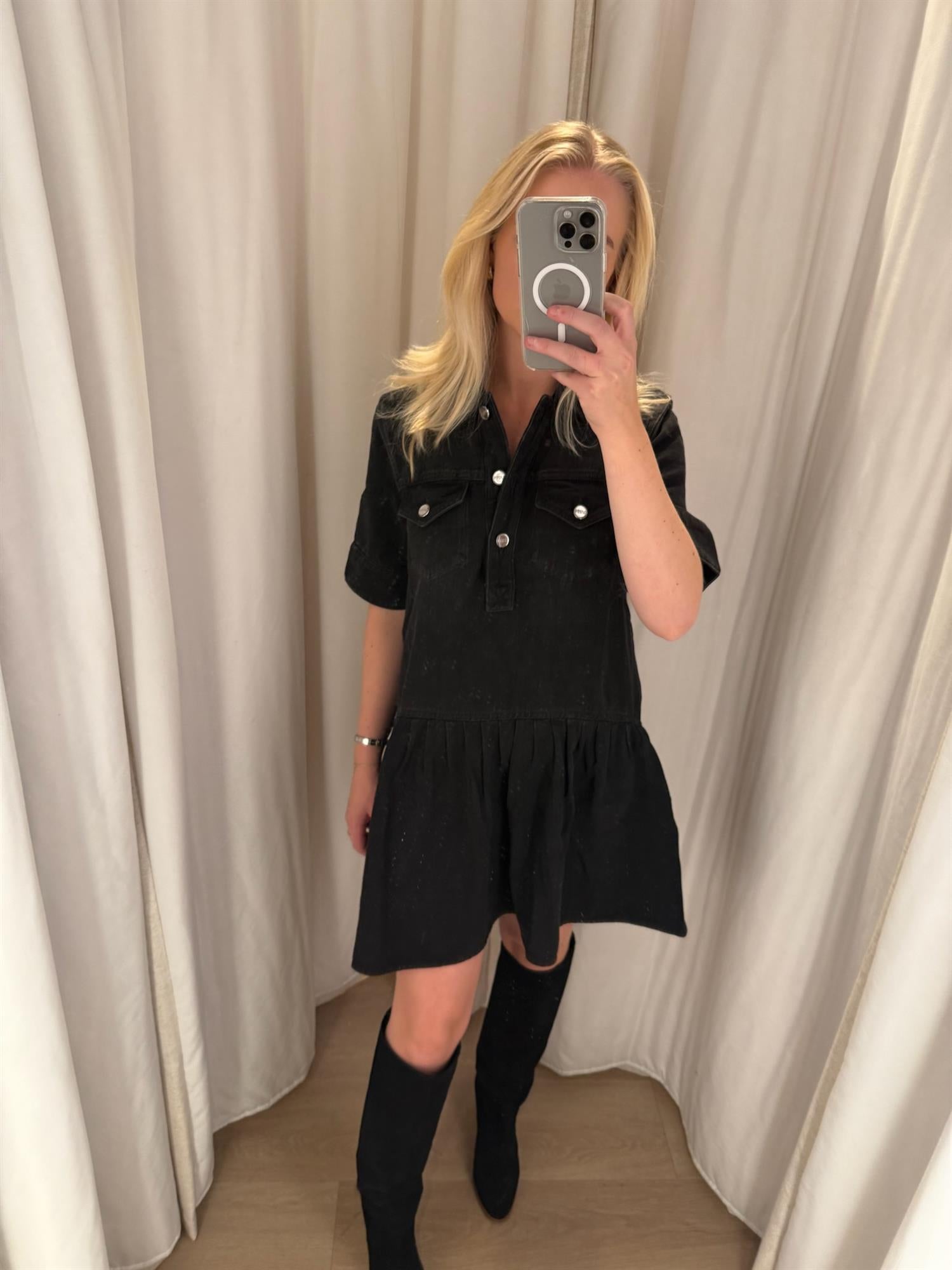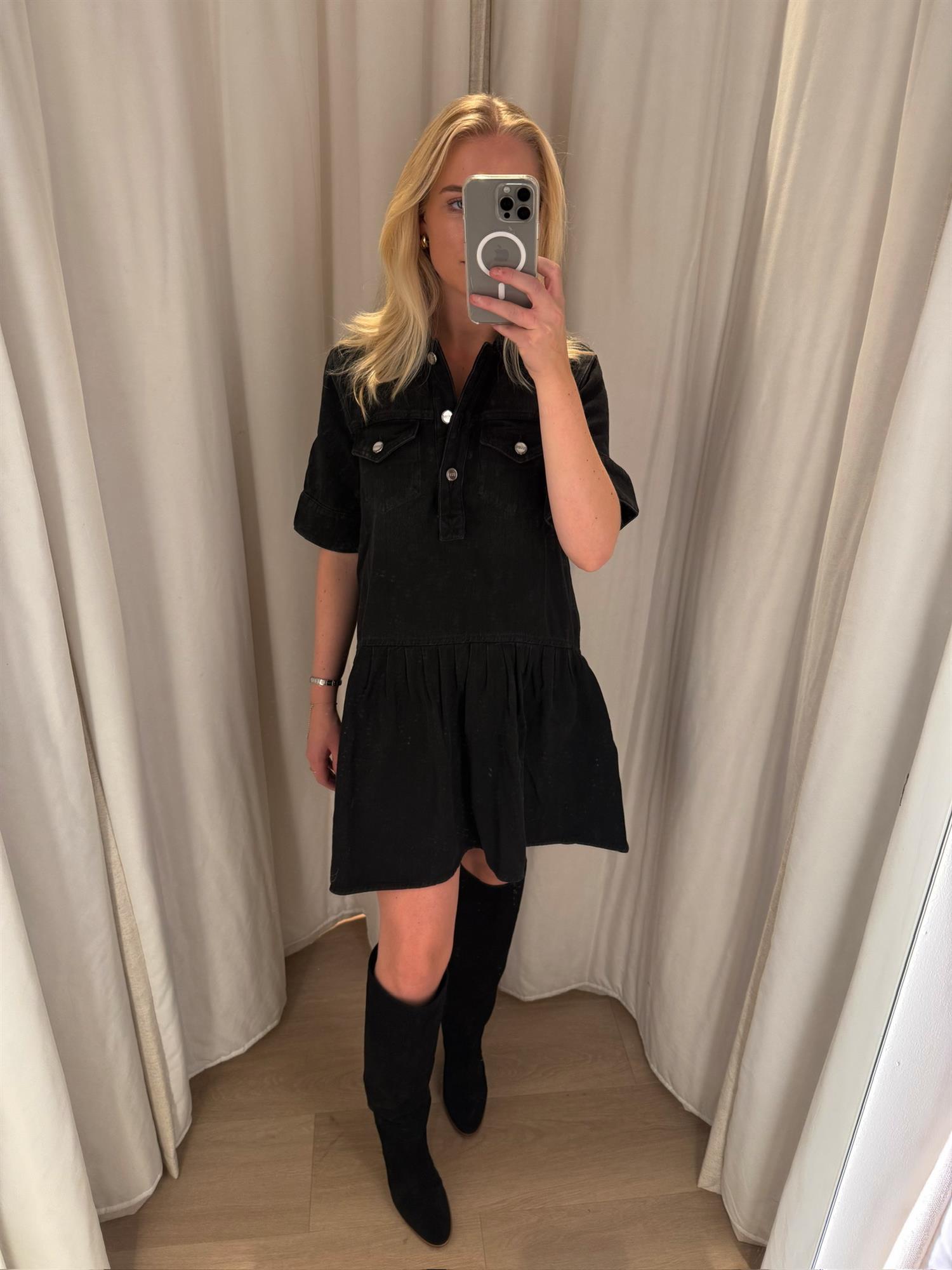 En kul og tidløs mini-kjole i sort denim fra Ganni. Kjolen har en lett strukturert passform som fremhever figuren, med klassisk svartvasket denim som gir et rått og stilrent uttrykk. Perfekt til både hverdagsbruk med sneakers eller til fest med støvletter.