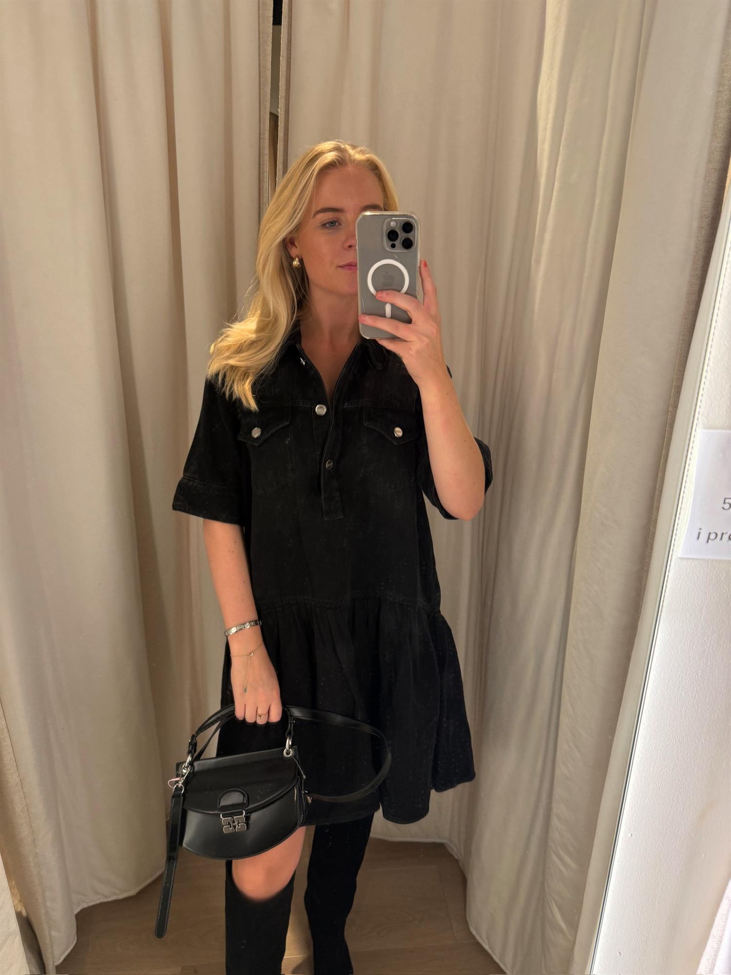 En elegant og praktisk veske fra GANNI med strukturert silhuett og gjennomtenkte detaljer. Vesken har både topphåndtak og avtakbar, justerbar skulderrem, slik at du kan bære den som du ønsker. Lukkes med magnetspenne i gullfarget GANNI Butterfly-design. Tre hovedrom, ett med glidelås, og en praktisk stikklomme gjør organisering enkelt.