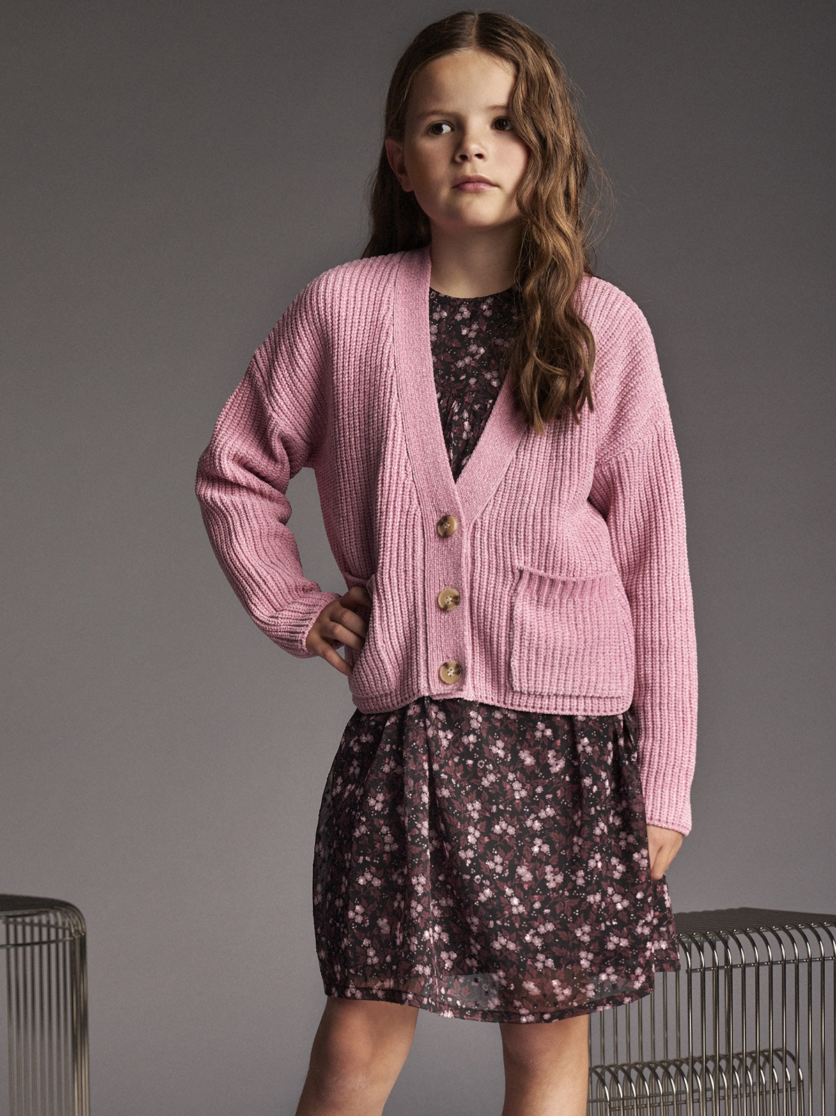 Myk cardigan fra Creamie i chenillestrikk. Den har dyp V-hals, to lommer foran og gjennomgående knapper.