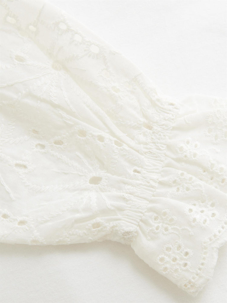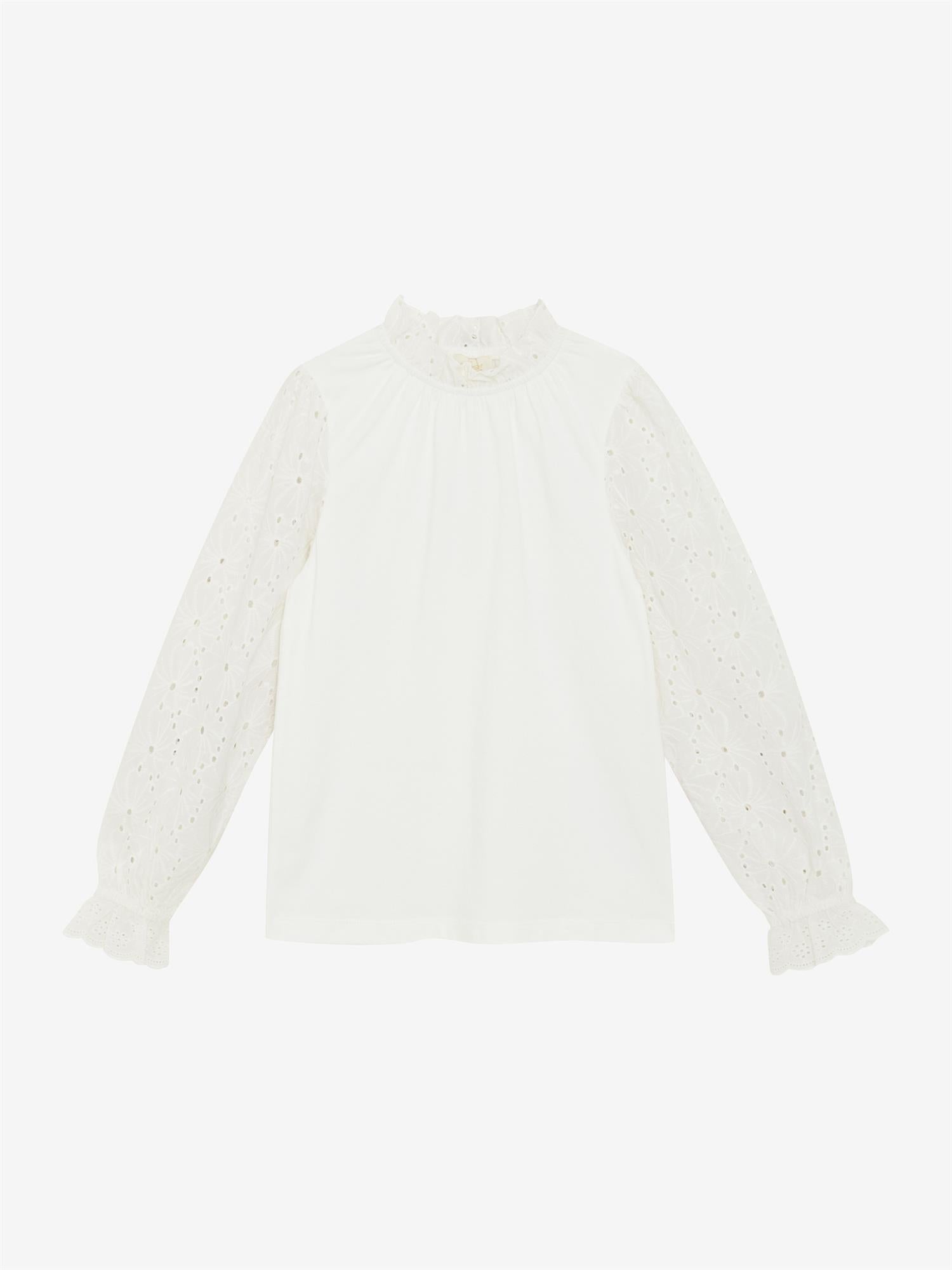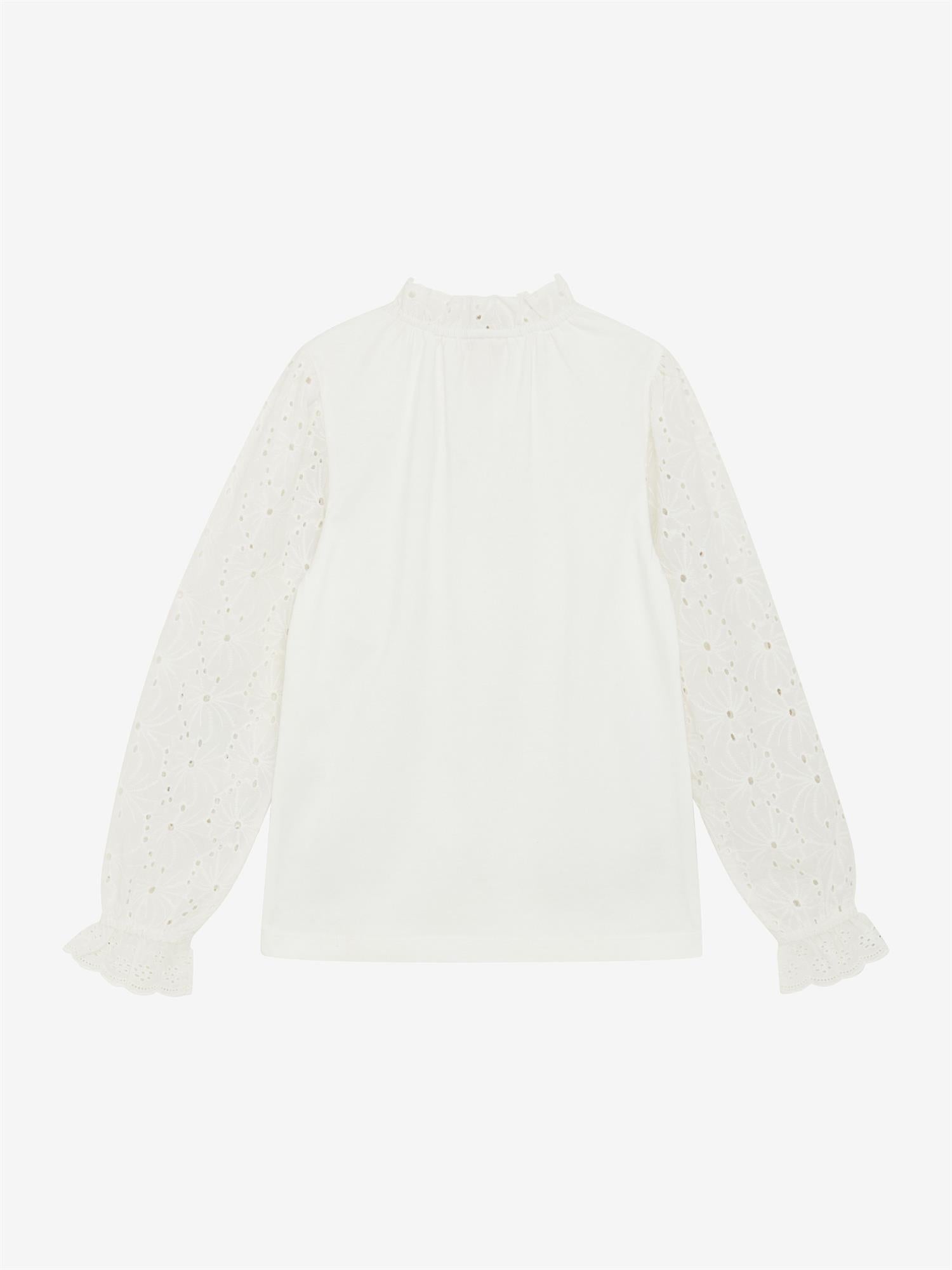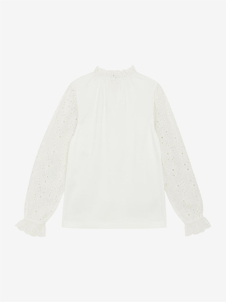 Nydelig bluse fra Creamie. Blusen har pointelle-detaljer på hals og ermer, som er laget i et transparent stoff. Den har rynkeeffekt ved ermene og halsen. Selve blusen er laget i myk bomull. Sertifisert i henhold til GOTS – organic CERES-0366.