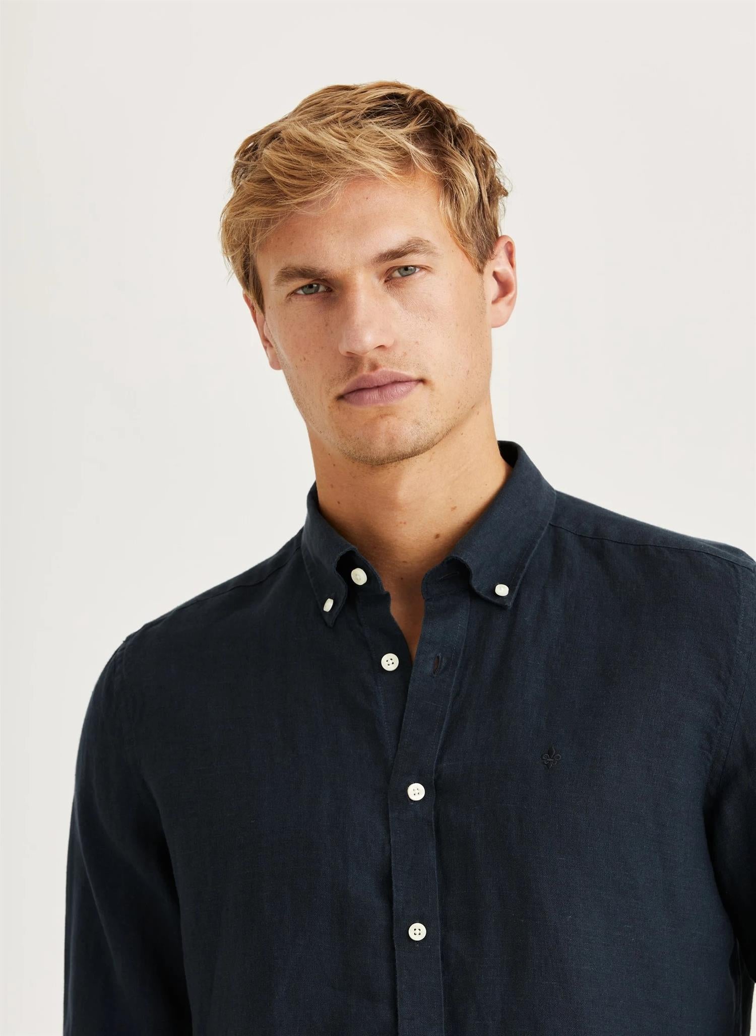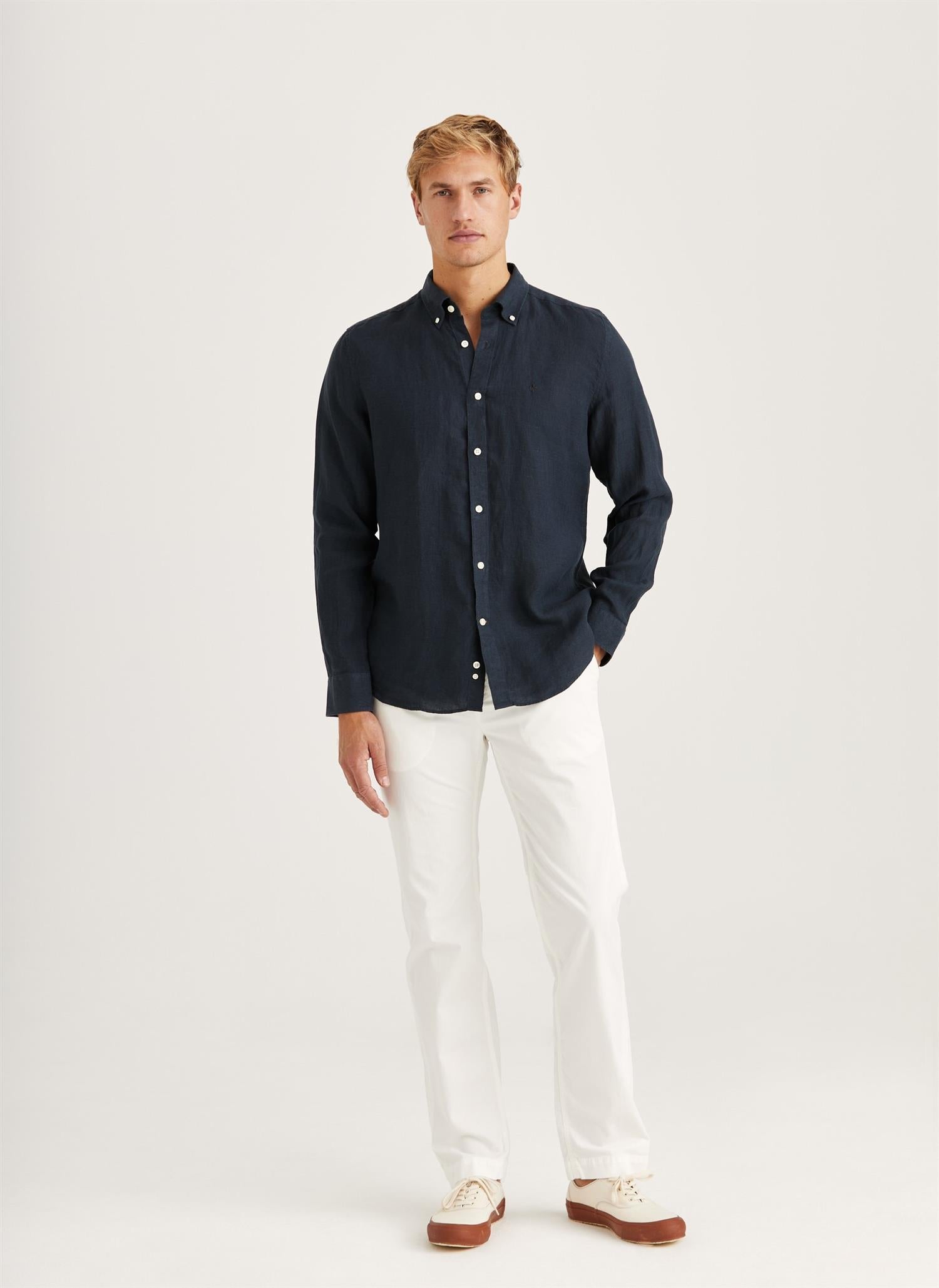 Douglas Linen Shirt er en ikonisk del av Morris-kolleksjonene. Laget av deres populære lin kvalitet, har den en lett og luftig følelse som er perfekt for sommeren. En lin skjorte er et must-have i enhver sommergarderobe, og Douglas er intet unntak. Bruk den med 5-lommers bukser og en blazer tidlig i sesongen, og bytt til shorts eller badeshorts når sommeren virkelig setter inn. Skjorten har en button-down-krage, logoknapper og brodert logo på brystet. Douglas kommer i en klassisk smal modell.