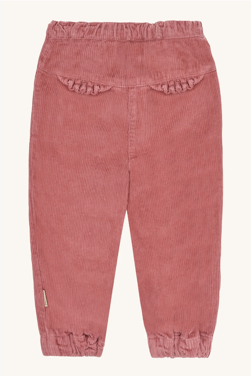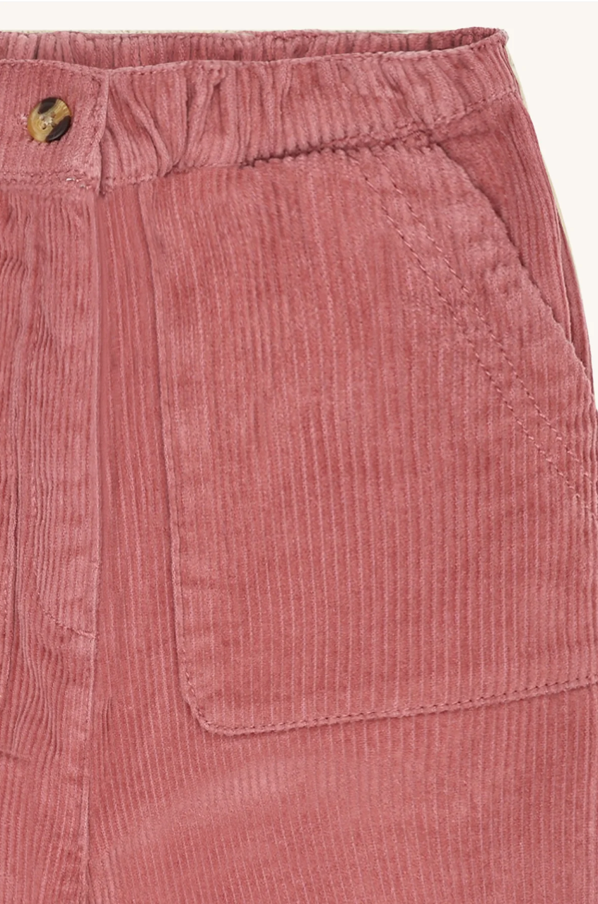 Myk og behagelig bukse i bredriflet cordfløyel fra Hust & Claire. Buksen har elastisk linning med knapp foran, praktiske sidelommer og påsydde frontlommer. Nederst i bena er det strikk som gir en god passform og gjør buksen komfortabel å bruke gjennom hele dagen. Perfekt både til hverdags og litt finere anledninger.