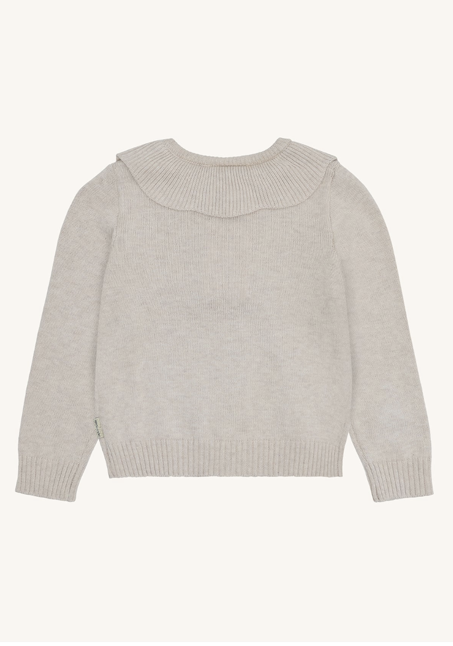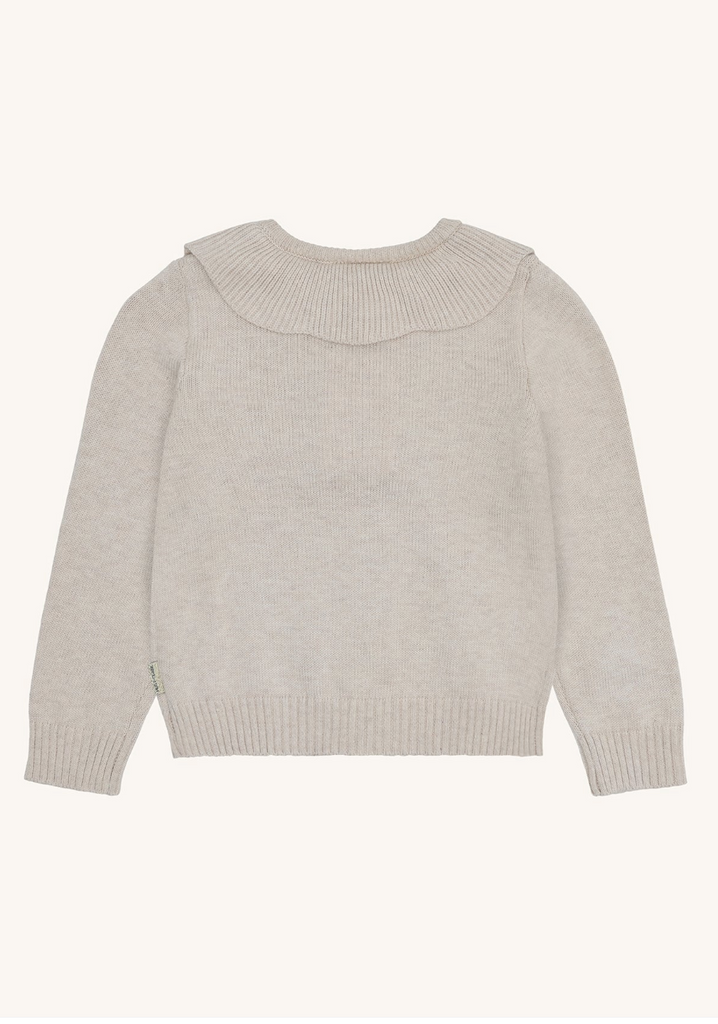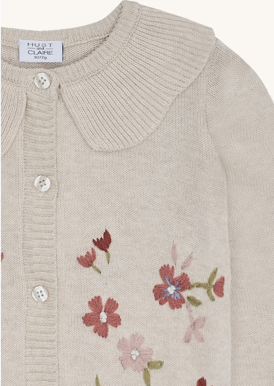 En nydelig cardigan i myk strikk med dekorative blomsterbroderier foran. Modellen har lange ermer, ribbestrikkede kanter og en søt, avrundet krage som gir et klassisk uttrykk. Cardiganen lukkes med knapper i front og passer perfekt som et ekstra lag over kjoler eller topper.