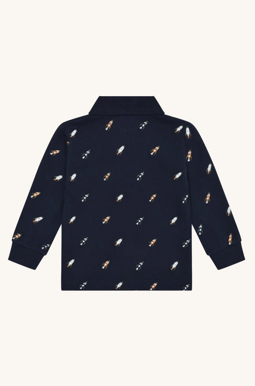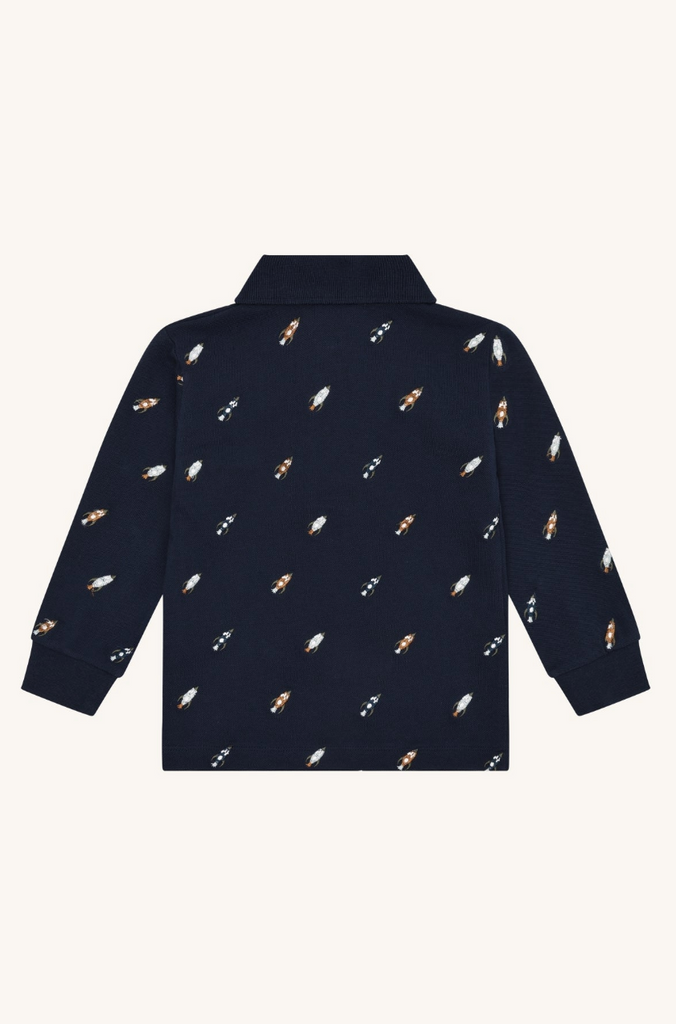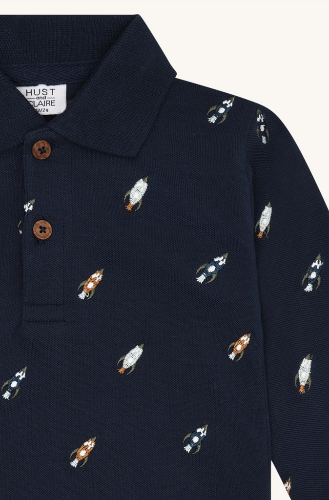 Langermet poloskjorte i vevd bomull med krage og knappestolpe øverst. Modellen er dekorert med broderte romraketter for en leken detalj.