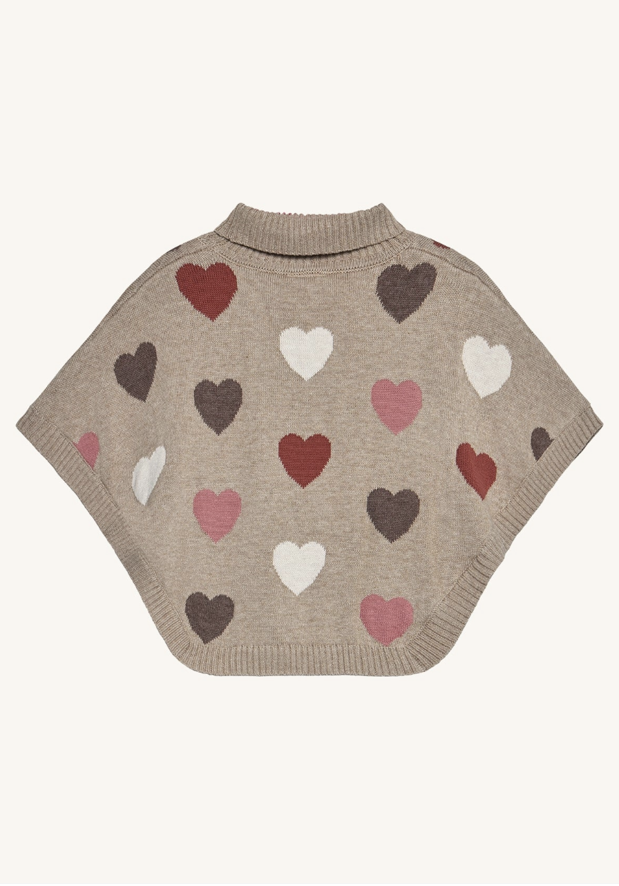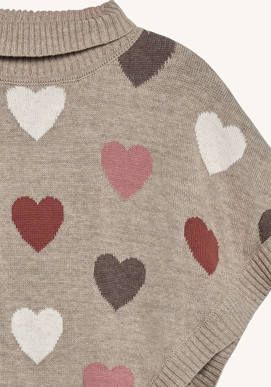 Myk og varm poncho i behagelig strikk med et lekent hjertemønster i fine kontrastfarger. Modellen har en høy hals med ribbekant og avsluttes med ribbestrikk nederst for en god passform. Perfekt å bruke over gensere eller jakker på kjølige dager, samtidig som den gir et søtt og sjarmerende uttrykk.