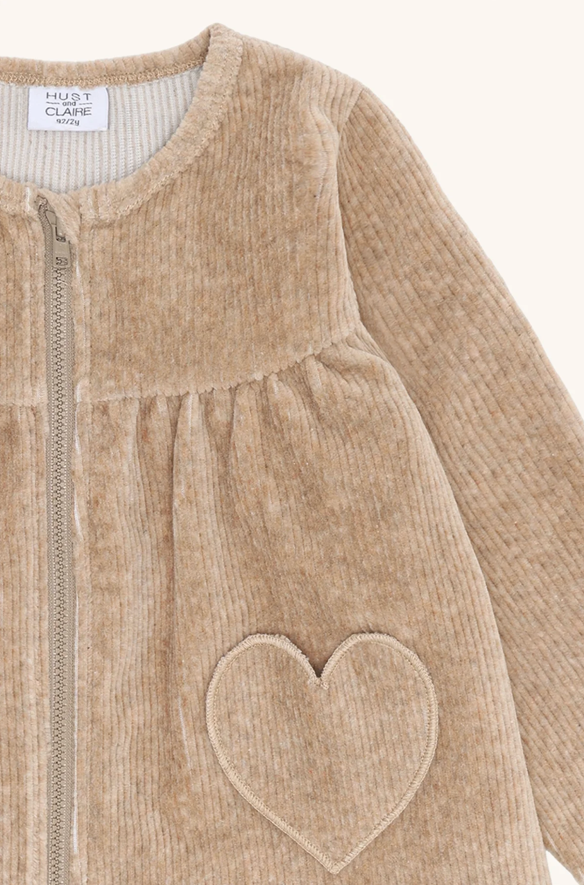 Nydelig og myk jakke i ribbestrikket velour fra Hust & Claire. Jakken har rund hals og praktisk glidelåslukking foran. Den er utsvingt fra brystet, noe som gir en søt og komfortabel passform. Foran har den to hjerteformede lommer som gir plagget et lekent og sjarmerende uttrykk.
